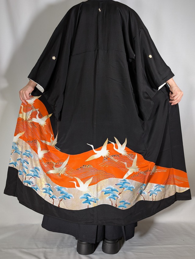 【14468】 着物リメイク 黒留袖 赤 鶴模様 ロングコート kimono tomesode remake long coat black