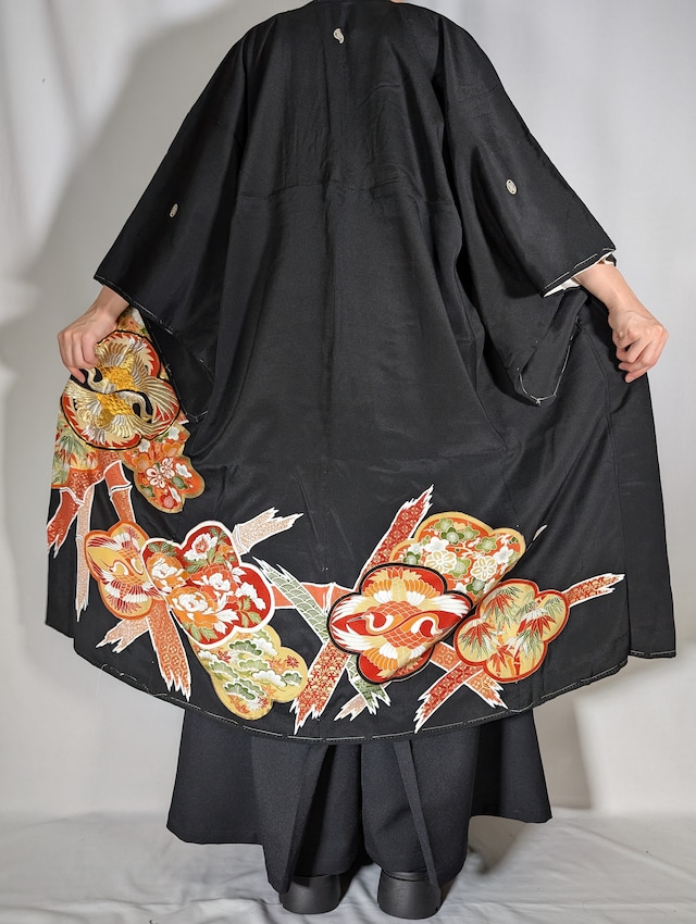 【14486】 着物リメイク 黒留袖 花車模様 牡丹 菊 梅 kimono tomesode remake long coat black
