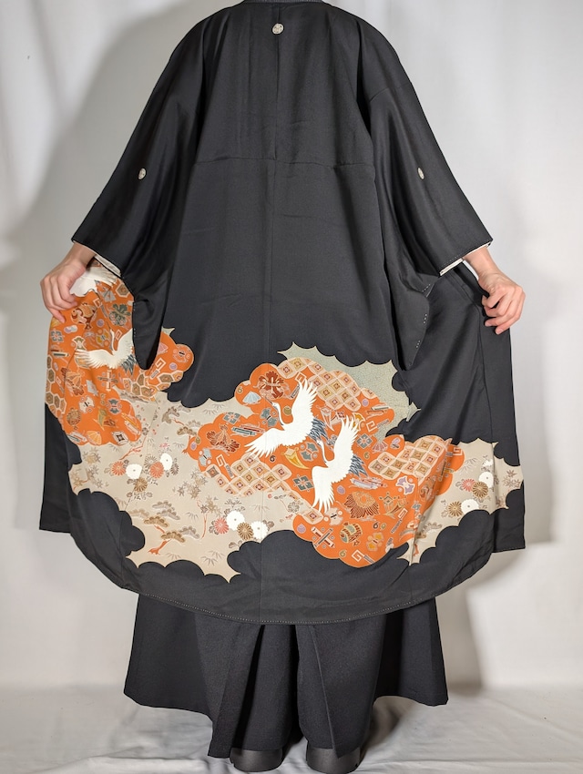 【14481】 着物リメイク 黒留袖 オレンジ 鶴 宝尽くし模様 菊 松 ロングコート kimono tomesode remake long coat black
