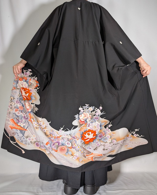 【14470】 着物リメイク 黒留袖 花模様 牡丹 梅 菊 ロングコート kimono tomesode remake long coat black