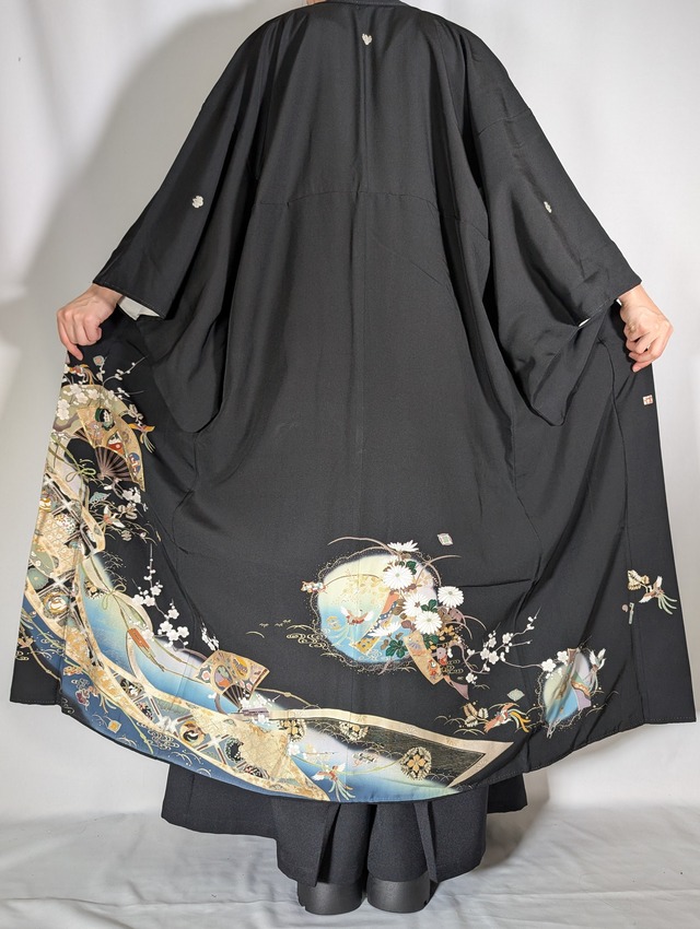 【14475】 着物リメイク 黒留袖 地紙 扇子 梅 菊 笹 金 ロングコート kimono tomesode remake long coat black