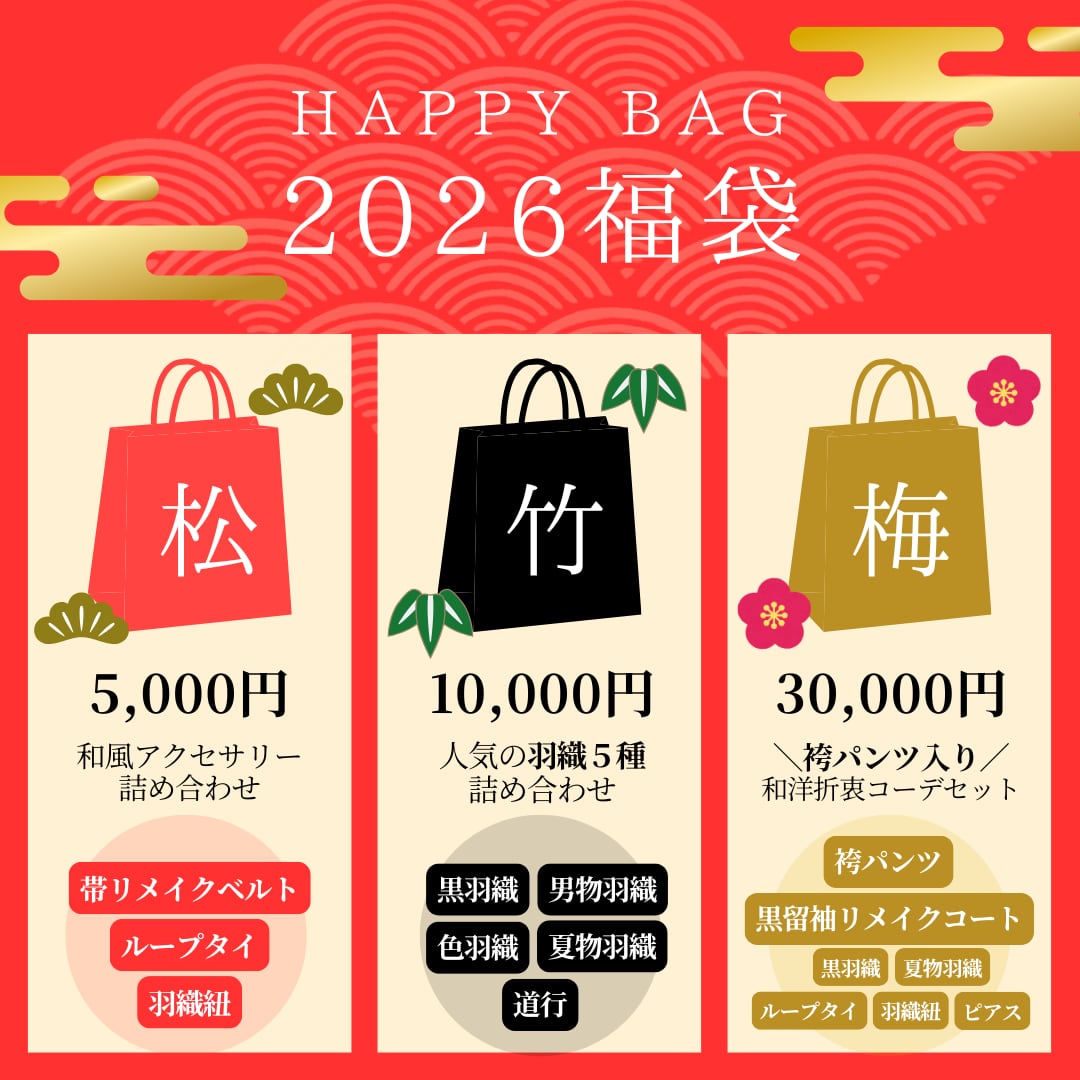 《繁體中文商品說明請參考本頁面下方》 ★ ★ ★ 数量限定!2026福袋 ★ ★ ★ ■販売期間:〜2026年1月13日まで ※予定数に達し次第、早期終了となる場合があります。 ■年末年始の発送休止期間:2025年12月30日(火)〜1/4(日) ※年内のお届けは、【12/29(月)午前中まで】のお支払い完了分が対象となります。 ※年始は2026/1/5(月)より順次発送いたします。 ★ ★ ★ ★ ★ ★ ★ ★ ★ ★ ★ ★ ★ 【HAPPY BAG 2026|梅】 \60,000円相当 → 30,000円(税込)/ 【袴パンツ入り】和洋折衷コーデ7点セット 「気になっていたけれど、なかなか手が出なかった」 そんな袴パンツや黒留袖リメイクコートを、特別価格でお楽しみいただける豪華福袋です。 コーディネートの軸になるアイテムがそろっているため、お手持ちのトップスと合わせるだけで幅広い着回しが楽しめます。 夏物羽織も含まれているため季節を問わず活躍する内容となっています。 一年を通して和洋折衷のスタイリングを楽しみたい方におすすめです。 ■内容(計7点) 袴パンツ ×1点(付属ベルト付) ※お好きな色・サイズをお選びいただけます。(現在在庫のある色・サイズが対象となります。在庫状況はこちらの商品ページ内「種類を選択する」よりご確認ください) 黒留袖リメイクコート ×1点 ※110cm, 120cm, 130cmよりお好きな丈をお選びいただけます。 黒羽織 ×1点 夏物羽織 ×1点 ピアス ×1点 ヴィンテージループタイ ×1点 ヴィンテージ羽織紐 ×1点 ※袴パンツ以外のアイテムは、各1点ランダムで入ります。 ※写真はイメージです。 【ご購入前の注意事項】 ・福袋の特性上、商品の種類・色・柄等のご希望は承っておりません。 (※袴パンツ・黒留袖コートの丈を除く) ・福袋商品につきましては、発送前のアイロンがけは行っておりません。(黒留袖コート) ・福袋に含まれるアイテムは、すべてヴィンテージ品です。(※袴パンツ・ピアスを除く) 古着着物特有の匂いや使用感が見られる場合がございます。ヴィンテージ品に慣れていない方、匂いに敏感な方は、あらかじめご了承の上でご購入をお願いいたします。 ・福袋に入るヴィンテージアイテムのコンディションはA〜Bランクの以上のものとなりますのでご安心くださいませ。 <Aランク> 状態の良好なもの →傷・よごれがない、もしくはわからない程度に少しあるのみで、全体的に状態の良いものです。 <Bランク> 着用感や若干の傷・よごれなどがあるもの →一般的な「古着」と言われる状態です。全体的もしくは一部に傷・よごれ・着用感がございます。(着用時に目立つ汚れのあるものは基本的にお入れしておりませんが、目立たない小さな汚れや羽裏のシミがあるものは含まれる場合がございます。) ・返品について お客様都合での返品・返金・交換は承っておりません。 万が一、到着した商品の中に《着用時に大きく目立つ汚れ》や《ほつれ・破れなど》の着用できない状態のものが含まれていた場合は、お手数ですが商品到着後【7日以内】にご連絡ください。 ▽こちらよりご連絡ください。 https://thebase.com/inquiry/haoriyaetowa-theshop-jp 可海外寄送|全商品日本製 運費(台灣: 4150日圓/香港:6,100 日圓) ★ ★ ★ 數量限定!2026 福袋 ★ ★ ★ ■販售期間:即日起至 2026 年 1 月 13 日 ※達到預定數量後,可能提前結束販售。 ■年末年始出貨暫停期間: 2025 年 12 月 30 日(二)~ 2026 年 1 月 4 日(日) ※年內配送僅限於【12 月 29 日(一)上午前】完成付款之訂單。 ※新年將自 2026 年 1 月 5 日(一)起依序出貨。 ★ ★ ★ ★ ★ ★ ★ ★ ★ ★ ★ ★ ★ 【HAPPY BAG 2026|梅】 \價值約 60,000 日圓 → 30,000 日圓(含稅)/ 【含袴褲】和洋折衷穿搭 7 件組 「一直很在意,卻遲遲無法下手」 這款豪華福袋,讓您能以特別價格入手袴褲與黑留袖改製外套等人氣單品。 由於包含可作為穿搭核心的重點單品, 只需搭配您手邊的上衣,即可享受多樣化的穿搭變化。 內容亦包含夏季用羽織,一年四季皆可活躍使用。 推薦給想全年享受和洋折衷風格穿搭的您。 ■ 內容(共 7 件) ・袴褲 × 1(附腰帶) ※可選擇喜歡的顏色與尺寸 (僅限目前有庫存之顏色與尺寸,請於本商品頁面「選擇種類」中確認) ・和服改製外套 × 1 ※可從 110 cm/120 cm/130 cm 中選擇衣長 ・黑羽織 × 1 ・夏用羽織 × 1 ・耳環/耳夾 × 1 ・復古波洛領帶 × 1 ・復古羽織繩 × 1 ※除袴褲外,其餘商品皆為隨機各 1 件。 ※圖片僅供參考。 【購買前注意事項】 ・因福袋商品之特性,恕無法接受商品種類、顏色、花色等指定。 (※袴褲、和服改製外套之衣長除外) ・福袋商品恕不提供出貨前熨燙服務。(和服改製外套) ・福袋內所包含之商品皆為復古/古著商品。(※袴褲、耳環/耳夾除外) 可能會有古著和服特有的氣味或使用痕跡。 對復古商品不熟悉者,或對氣味較為敏感者,請於充分理解後再行購買。 ・福袋內的復古商品皆為 A~B 級以上之良好狀態,請安心選購。 〈A 級〉 狀態良好,無明顯損傷或污漬,或僅有極輕微且不易察覺之痕跡,整體保存狀況良好。 〈B 級〉 有使用感,或有些微損傷、污漬之商品。 屬於一般所稱之「古著」狀態,整體或局部可能有使用痕跡、污漬或損傷。