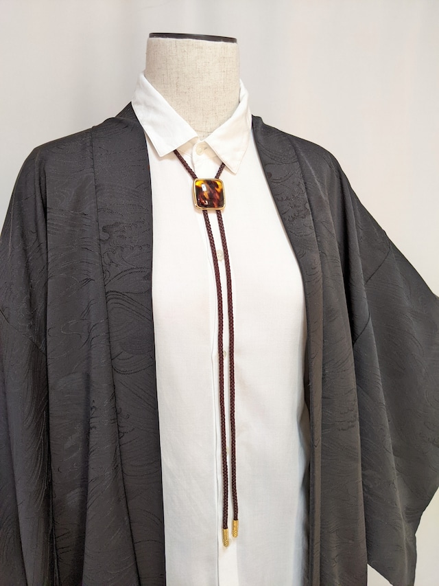 羽織との相性はもちろん、現代のファッションにも合わせやすいアンティークループタイ。 シンプルな服装に合わせるだけで、ぐっとおしゃれに。 どんな装いにも品格を与えてくれます。 一点もののため、お気に入りのアイテムを見つけた際はぜひお早めに。 【サイズ】 全長:約50cm パーツサイズ:縦 約4.5cm × 横 約4cm 【状態】 <A> ※当店ではヴィンテージ品ののコンディションを以下のランクによって区別して表示しております。 <S> 未使用品、もしくは未使用に近いもの 傷・よごれ・着用感がなく、良好な状態です。 <A> 状態の良好なもの 傷・よごれがない、もしくはわからない程度に少しあるのみで、全体的に状態の良いものです。 <B> 着用感や若干の傷・よごれなどがあるもの 全体的もしくは一部に傷・よごれ・着用感がございます。 <C> 状態が比較的悪いもの 全体的に傷・よごれ・着用感が目立ちます。 【必ずお読みください】 ・商品の状態について 特筆すべきダメージ等が確認される商品ついては各商品ページに記載致します。 記載のないものは、見栄えを大きく損なうダメージは無く、一般的なヴィンテージコンディションであるものです。 商品掲載前、発送前には商品チェックは行っておりますが、記載以外にも細かな傷や汚れ(表地・裏地)、その他ダメージ箇所がある場合がございます。ヴィンテージ商品の状態は個々人の主観によって異なる場合もあるため、中古衣類の性質をご理解頂くとともに、新品同等の完全な美品をお探しの方、神経質な方はトラブルを避ける為、ご注文をお控えくださいますようお願い申し上げます。 ・返品について ヴィンテージ商品(中古衣類)の返品・返金・交換は承れませんので予めご了承下さいませ。 万が一、商品に記載のない大きなダメージがあるなどの場合は、商品到着後3日以内にご連絡ください。至急対応させて頂きます。3日以降を経過しての商品状態についてのお問い合わせはお受け致しかねますので予めご了承ください。 商品の状態につきまして、ご不安がございます場合はご購入前にお気軽にお問い合わせ下さいませ。 This antique necktie adds a touch of elegance to both traditional Japanese haori and modern attire. As each piece is one-of-a-kind, we encourage you to secure your favorite item promptly. Overall length:50 cm Part size: 4.5 cm × 4 cm condition: <A> * The condition is defined as below. <A> Good condition There are few damages, almost in good condition. <B> Nomal condition There are multiple stains or damages but not so noticeable. <C> Not-so-good condition Stains or damages are noticeable. [Please check followings before purchasing] ・ About the condition of the item If there are noticeable damages, we describe them on each item page. We inspect items before it is posted and before shipping, but there may be minor damages, stains other than those listed. ・ About returns Please note that we cannot accept returns, refunds or exchanges of vintage items. If there is significant damage not listed on the item page, please contact us within 3 days after arriving. We will respond as soon as possible. If you have any concerns, please feel free to contact us before purchasing.