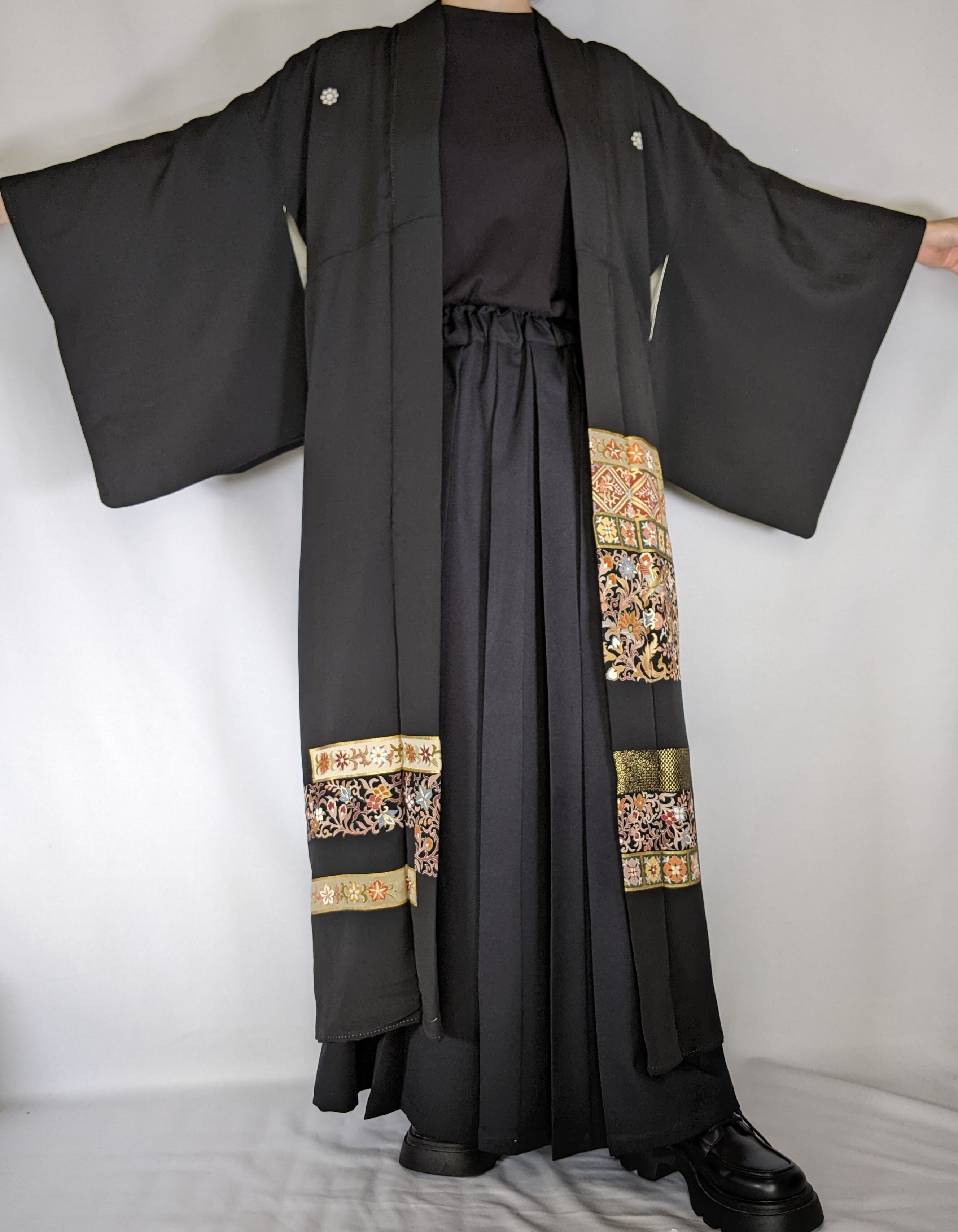 ヴィンテージの着物(黒留袖)をリメイクした世界に一点だけのロングコート。