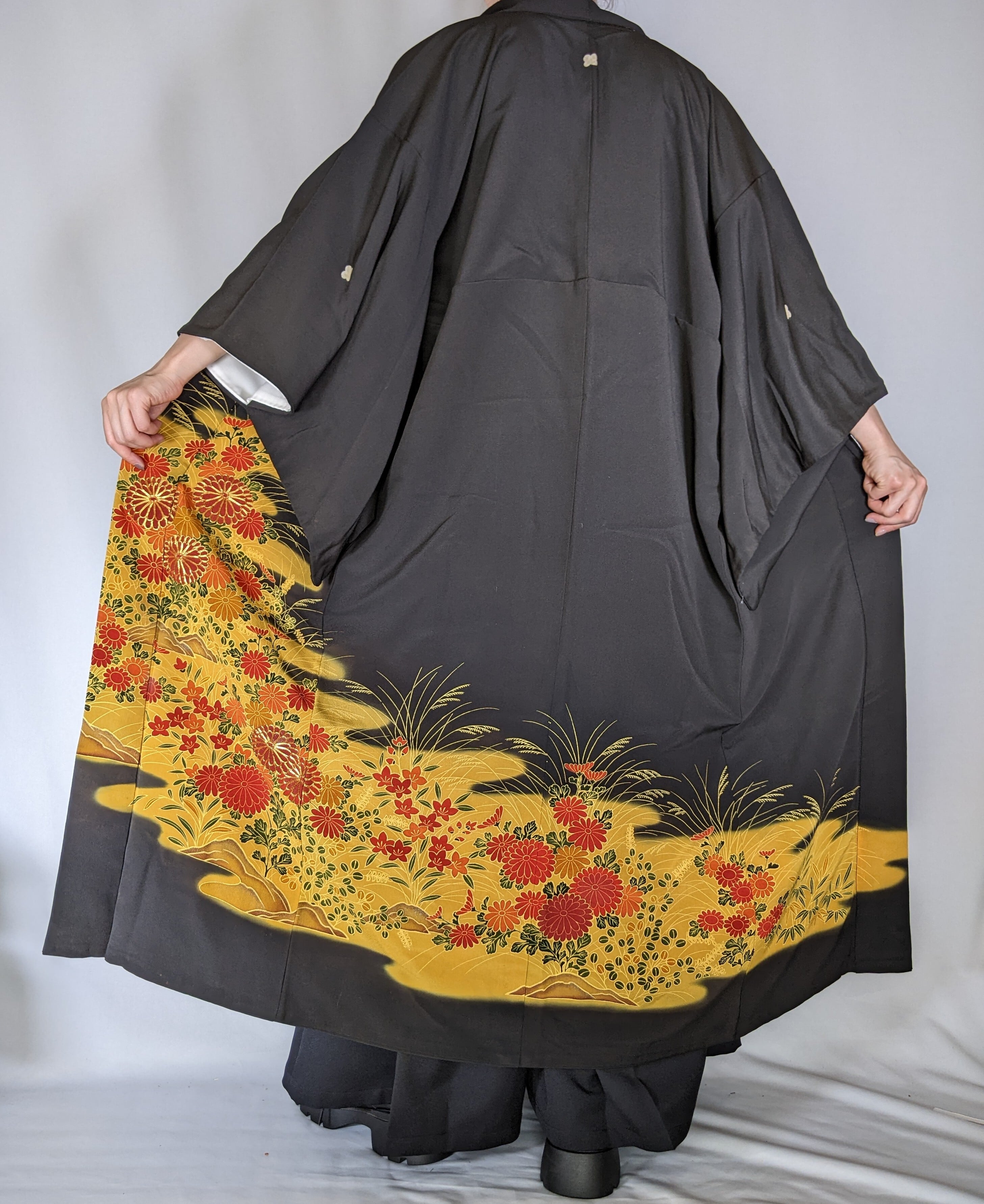 ヴィンテージの着物(黒留袖)をリメイクした世界に一点だけのロングコート。