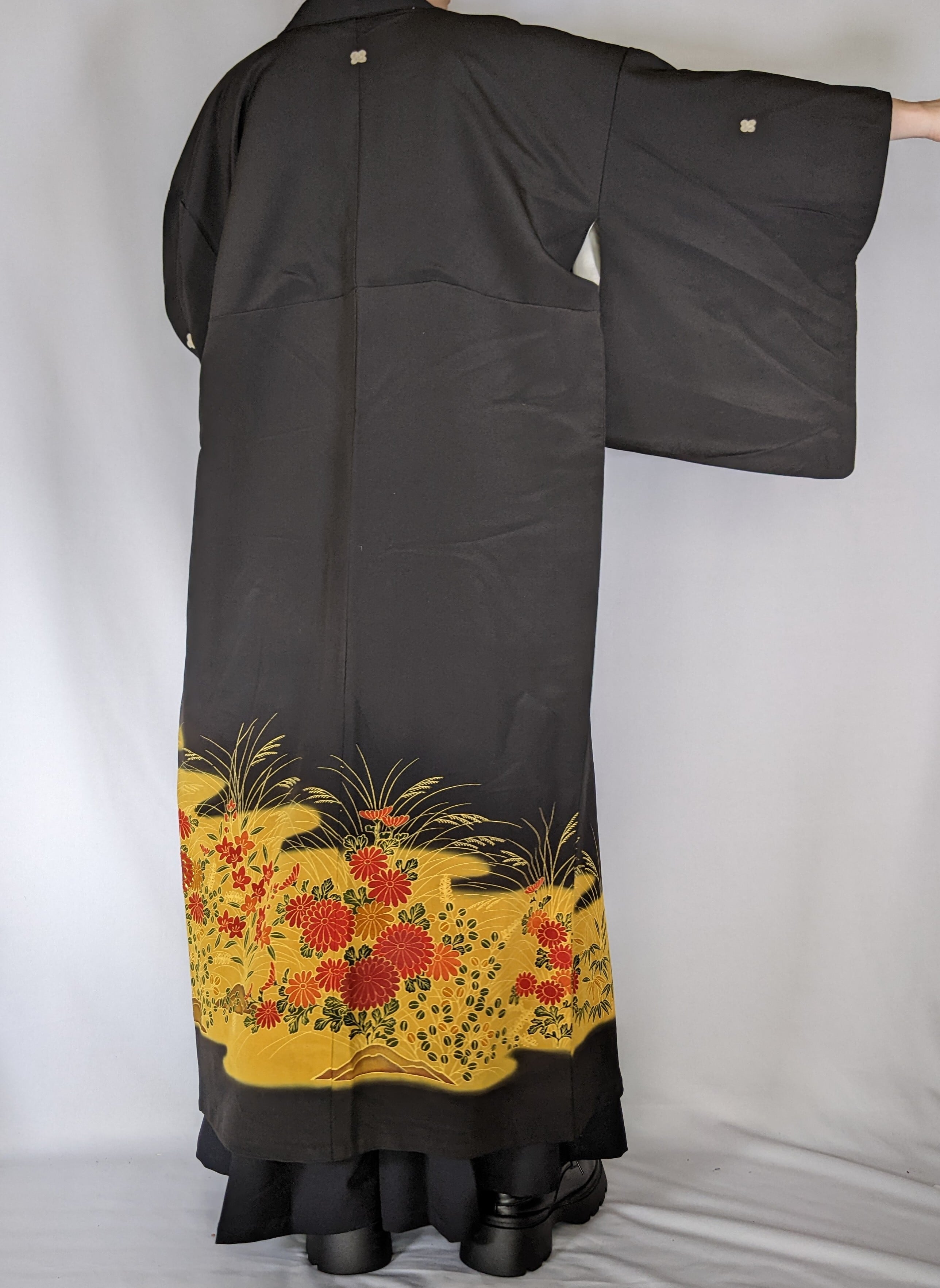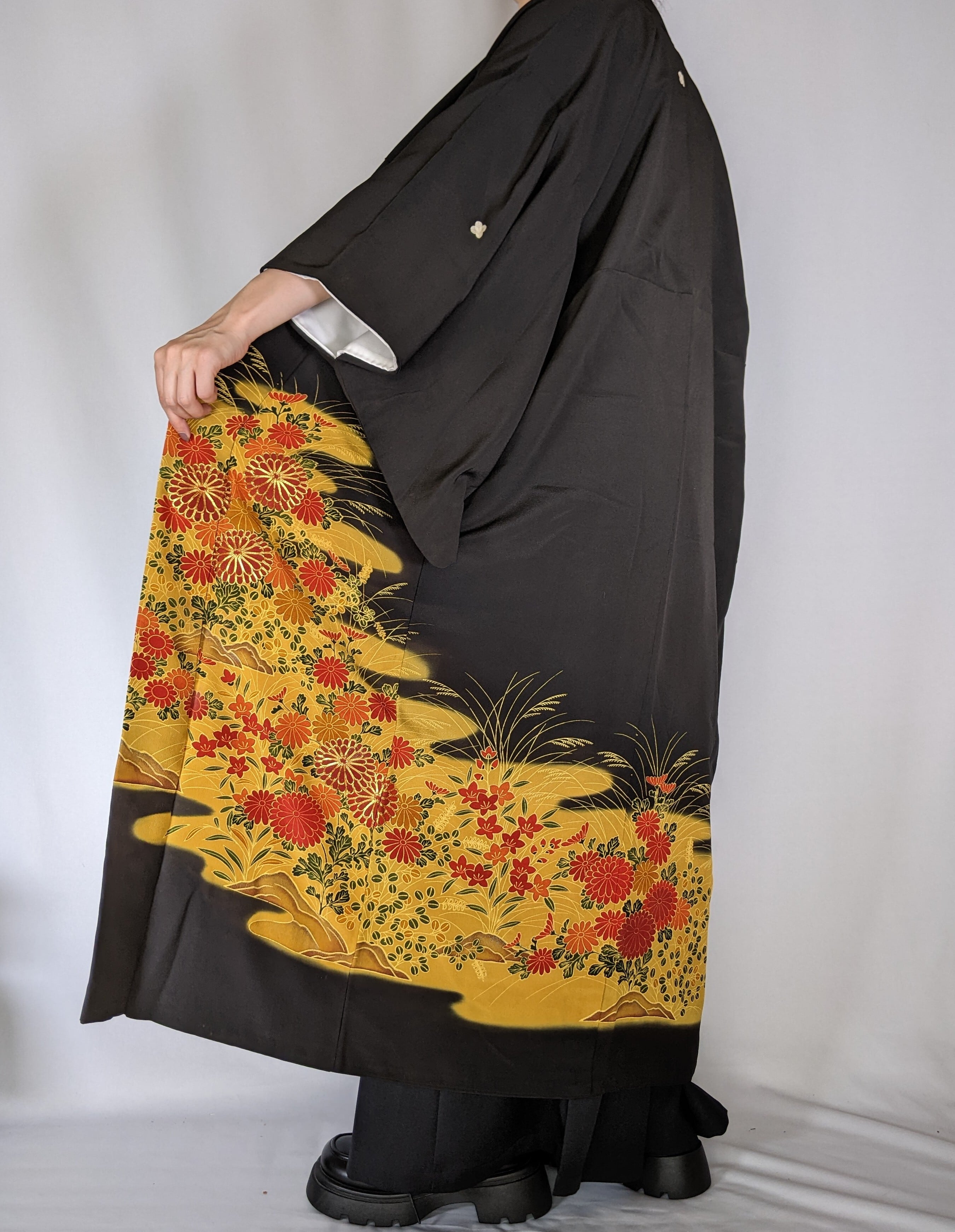 【13918】 着物リメイク 黒留袖 ロングコート 黄色 花模様 kimono tomesode remake long coat black