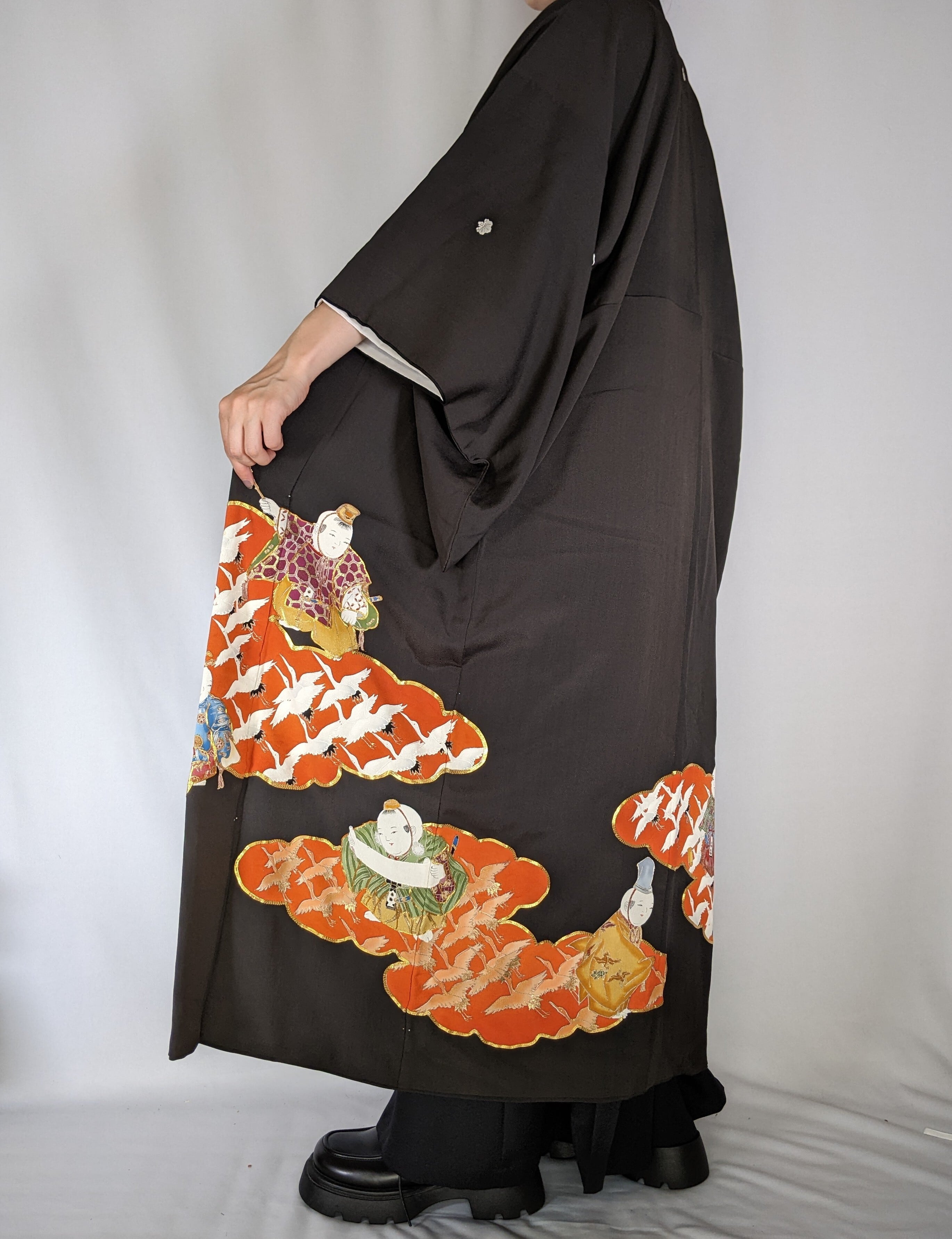 【13921】 着物リメイク 黒留袖 ロングコート 鶴 kimono tomesode remake long coat black