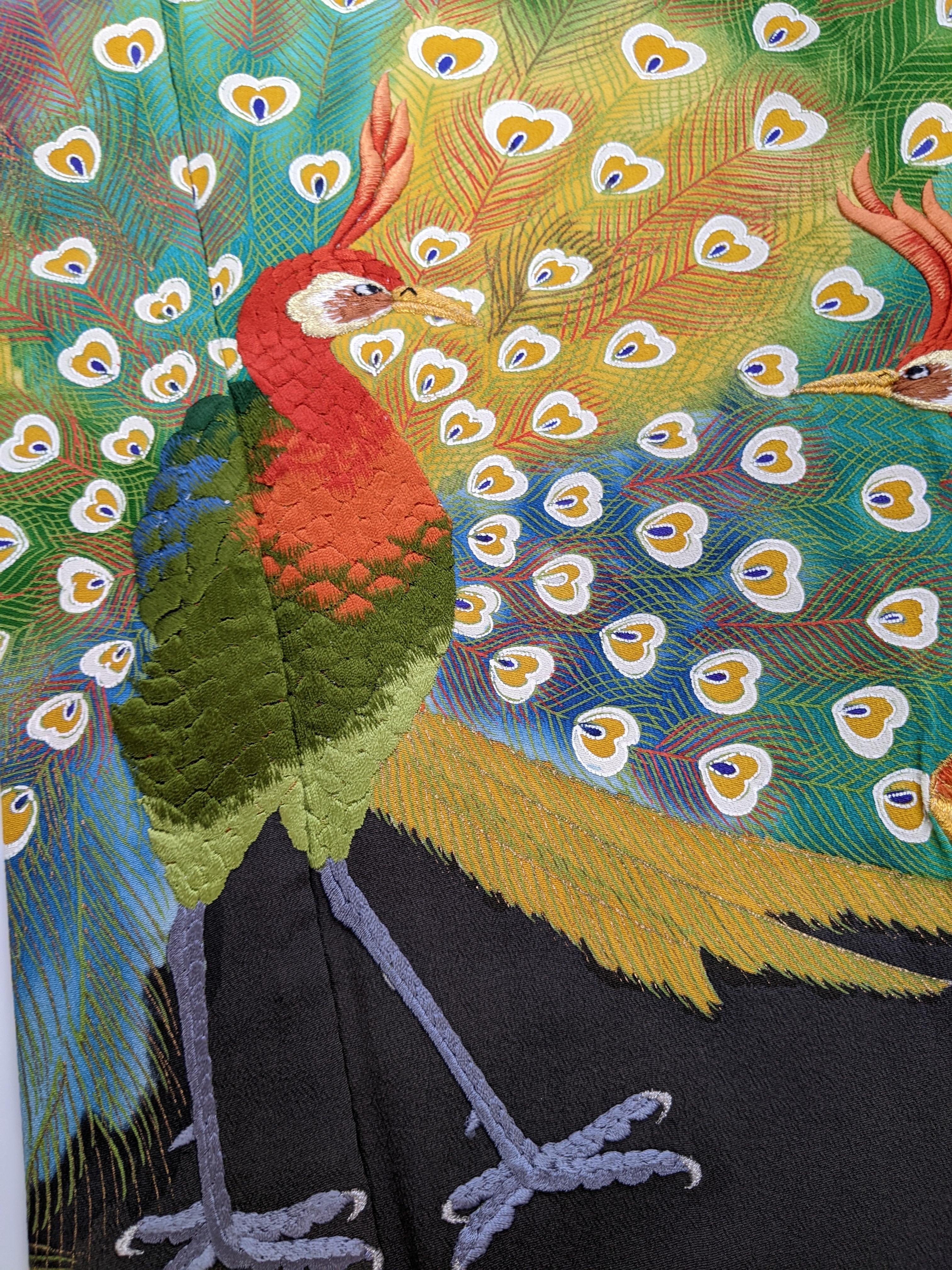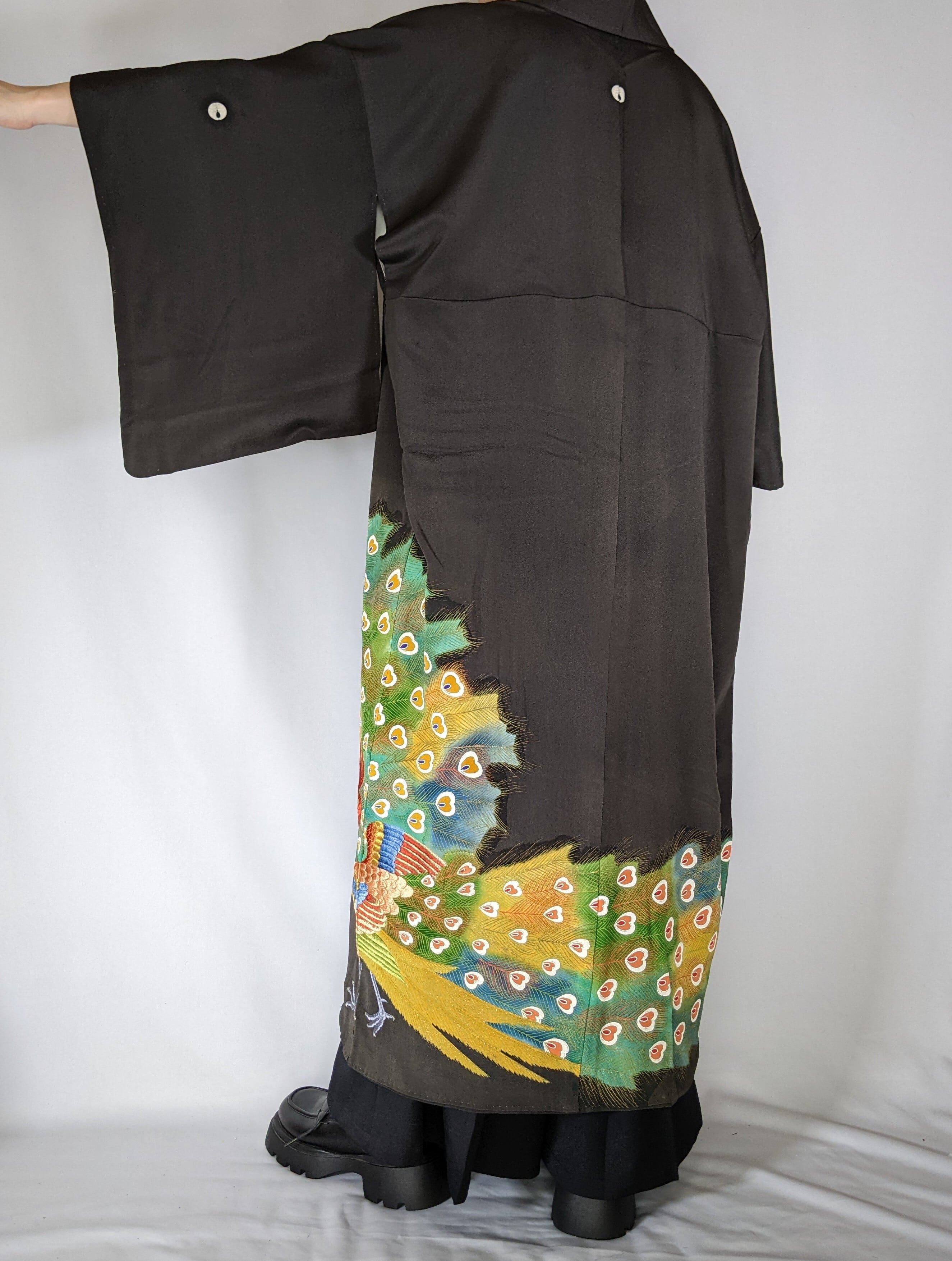 【13926】 着物リメイク 黒留袖 ロングコート 孔雀 刺繍 kimono tomesode remake long coat black