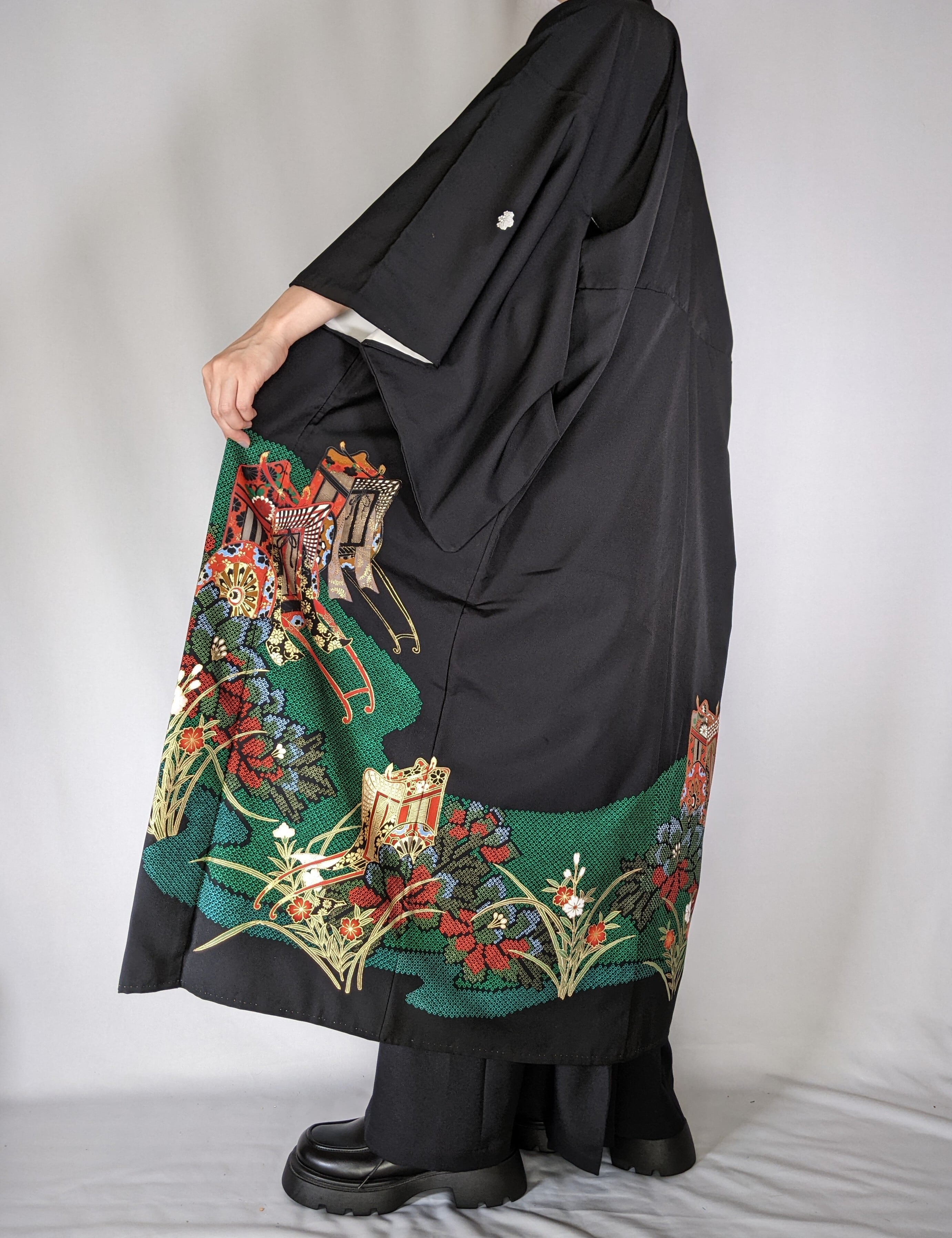 【13929】 着物リメイク 黒留袖 ロングコート 緑 金 御所車 kimono tomesode remake long coat black