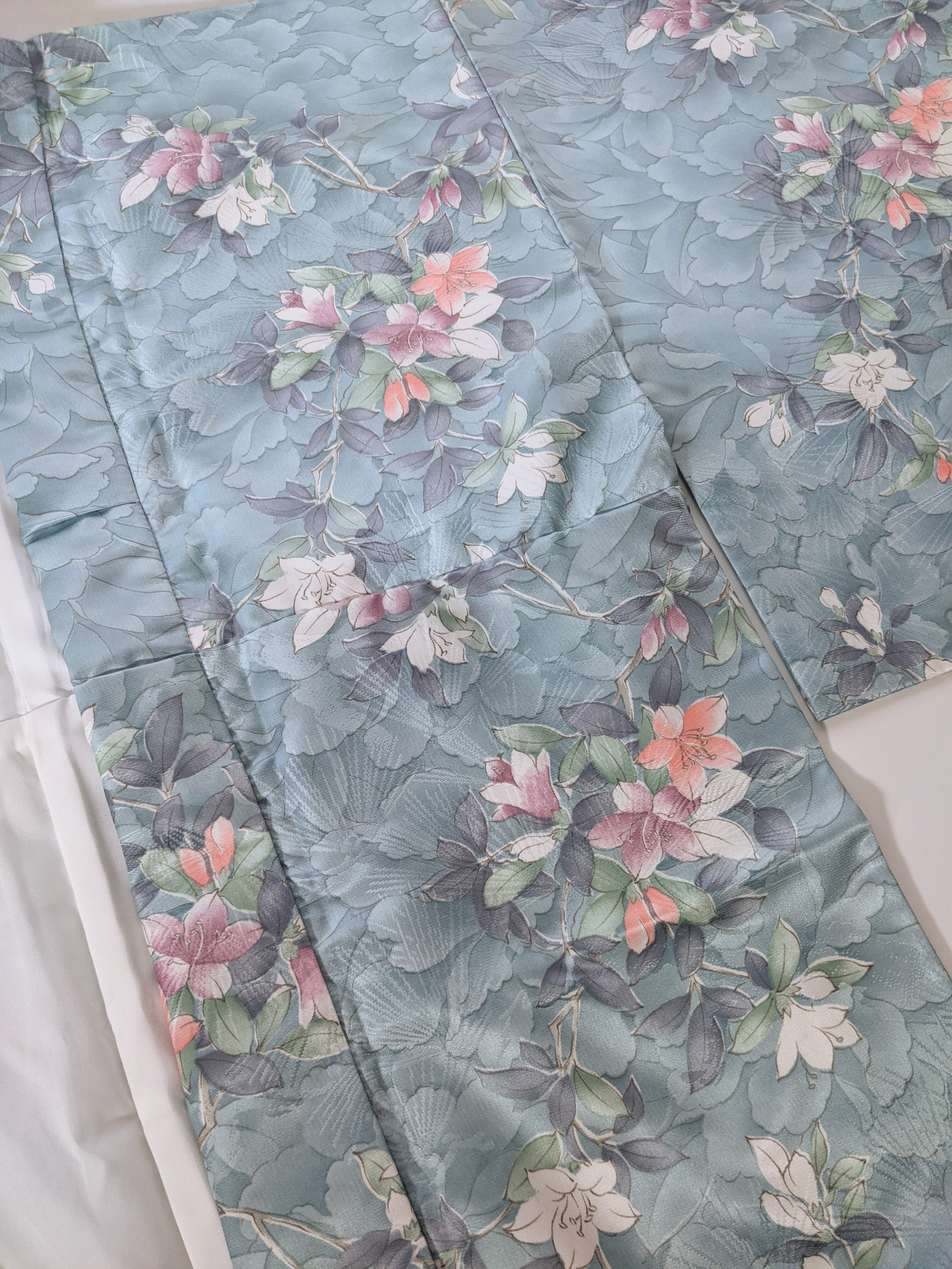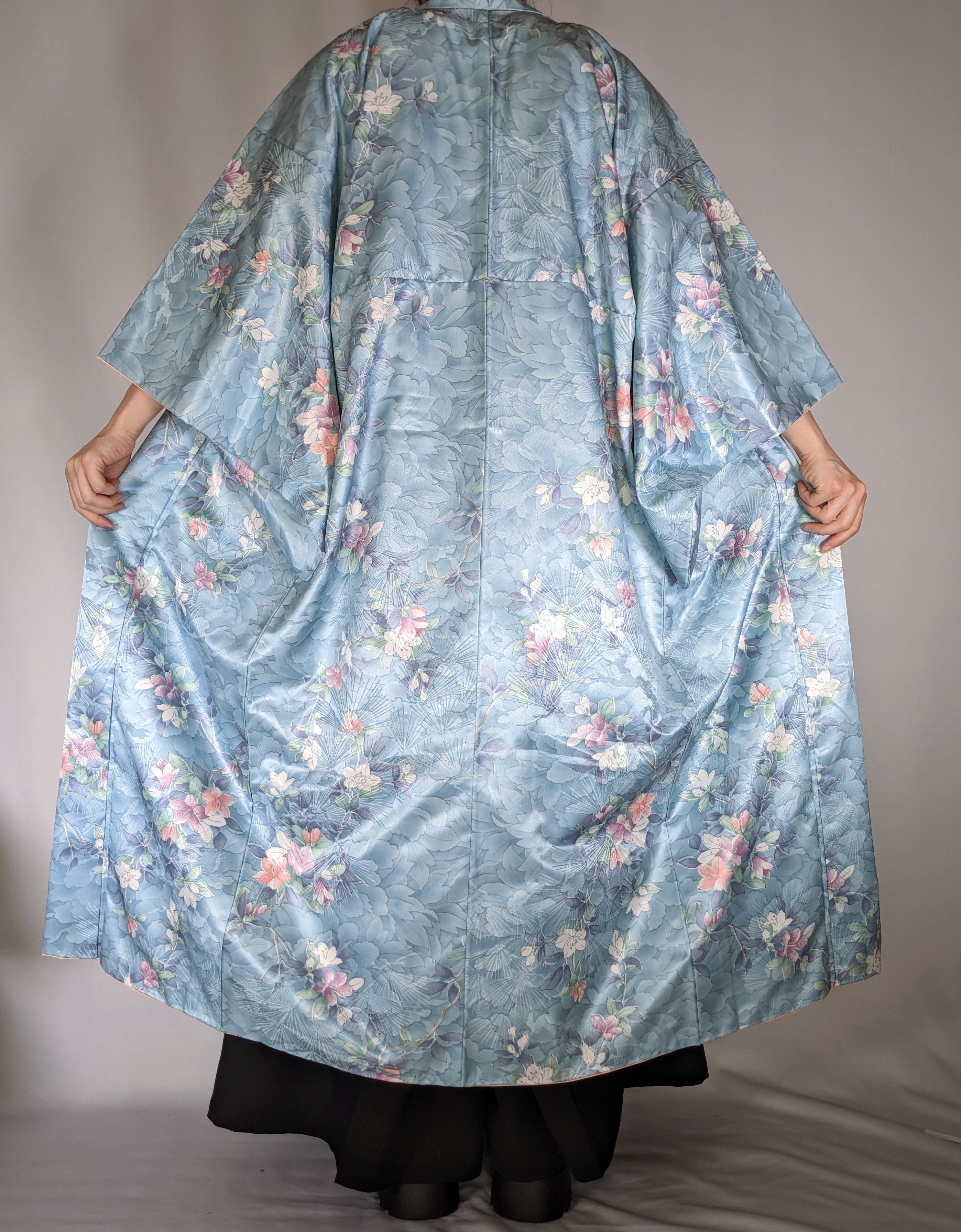 【13933】 着物リメイク ロングコート 水色 花模様 kimono remake long coat black