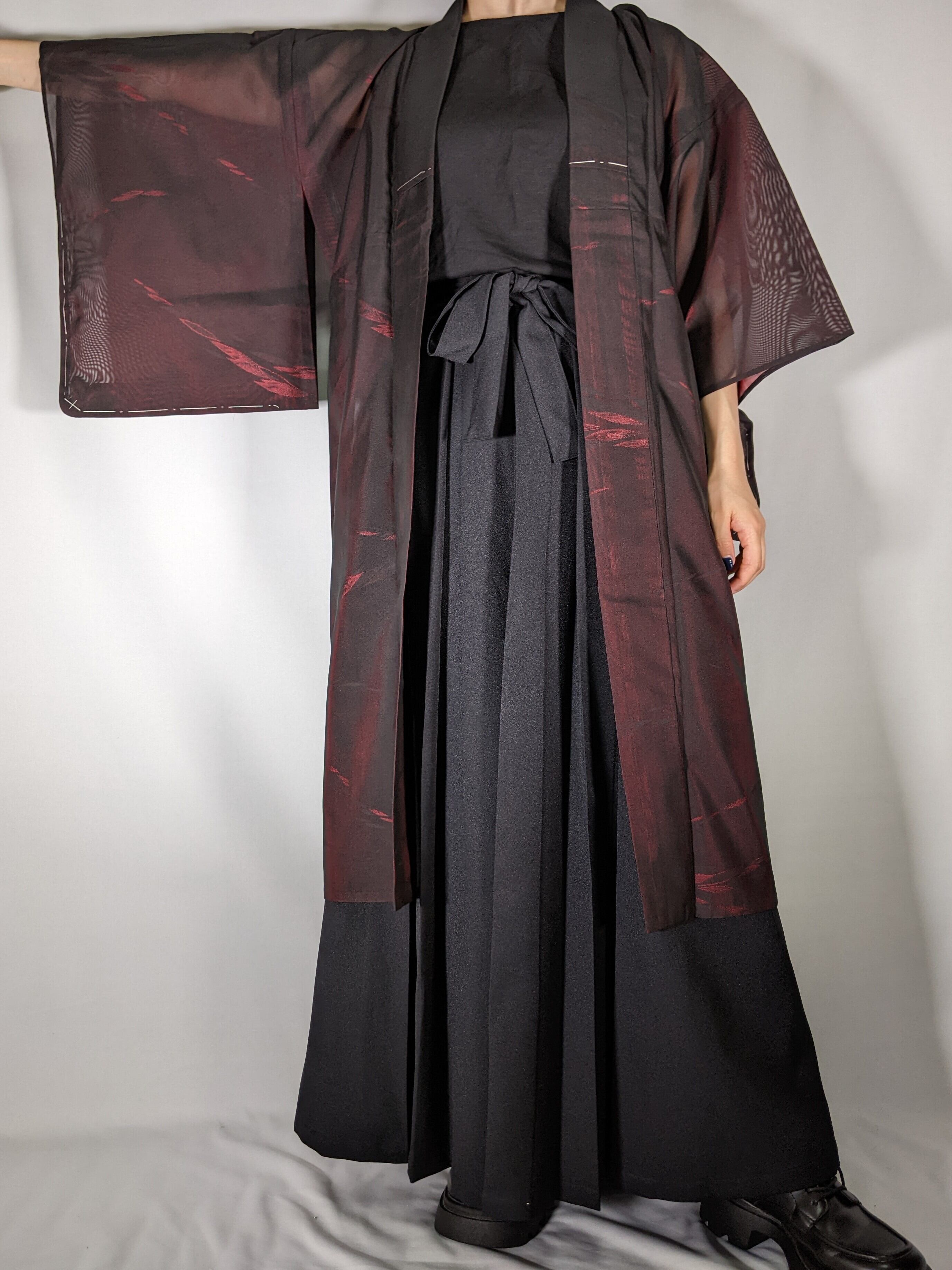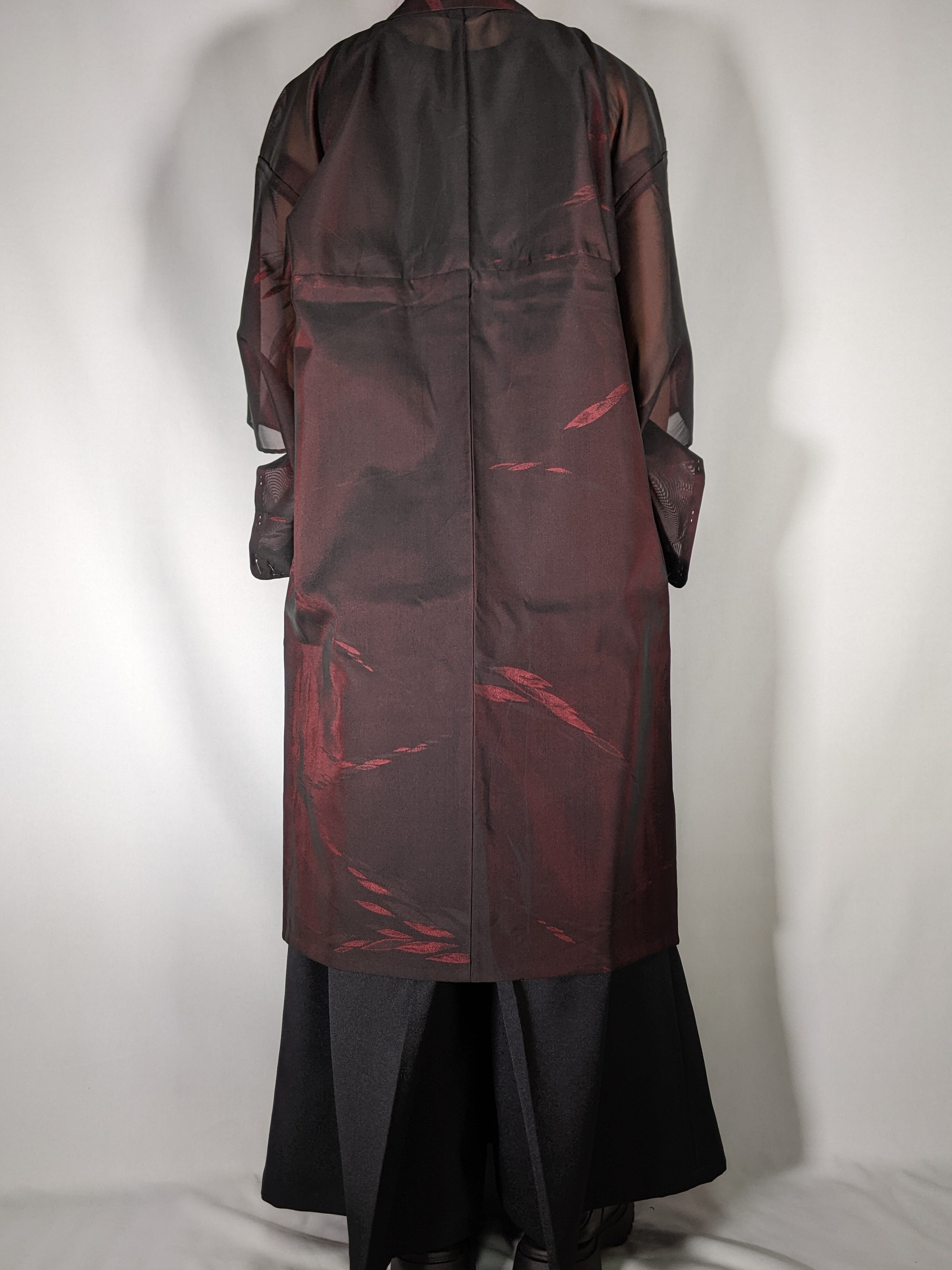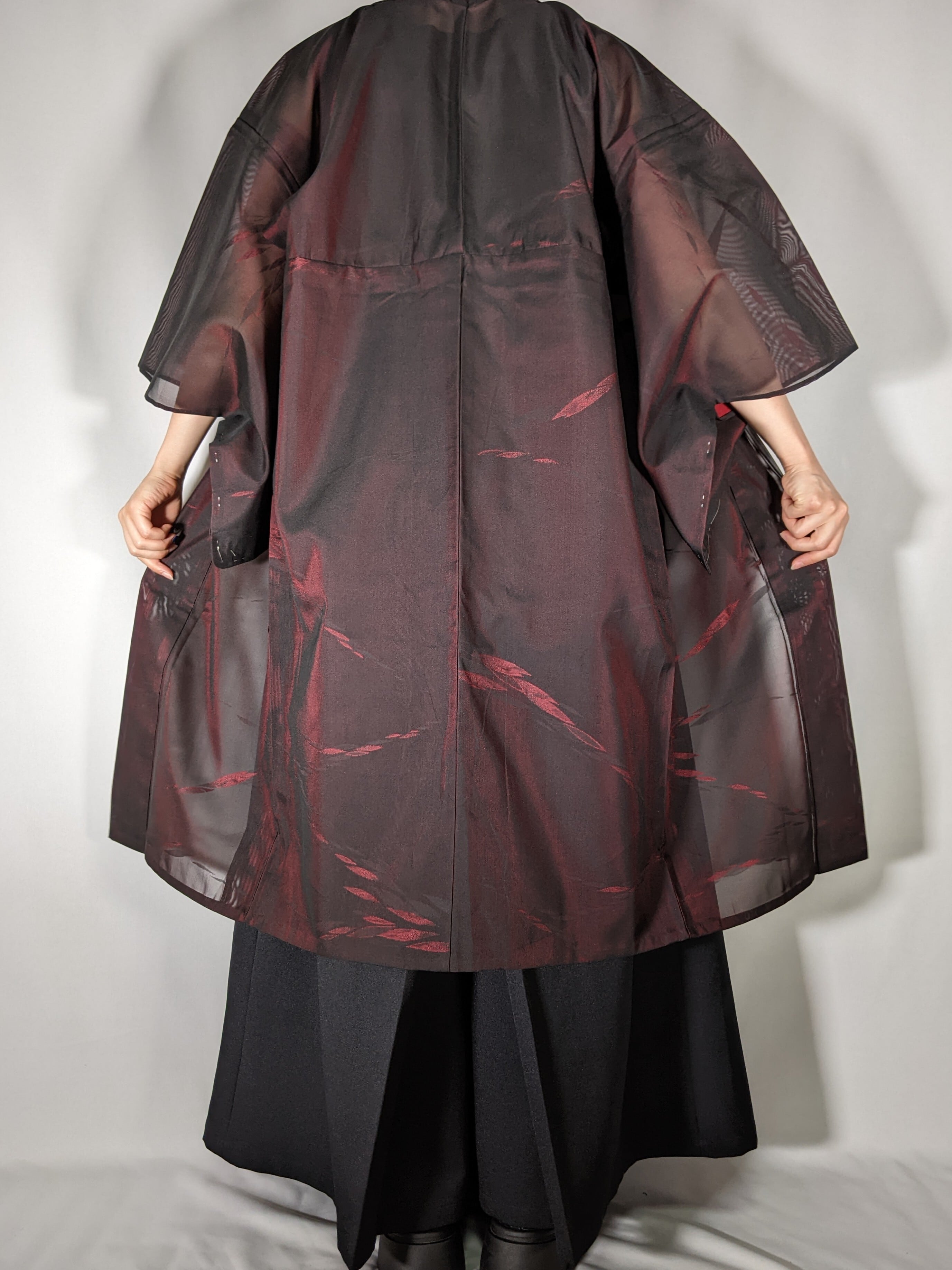 【14105】 着物リメイク 夏物着物 透け感 黒 裏地赤 ロングコート kimono tomesode remake long coat black red