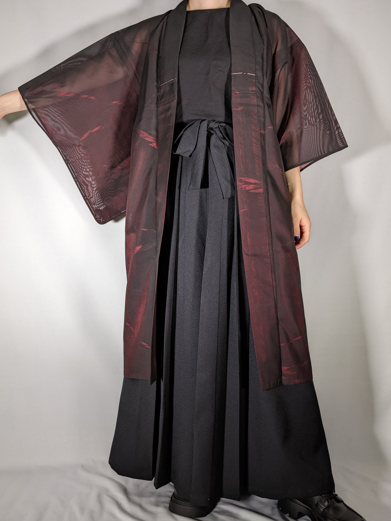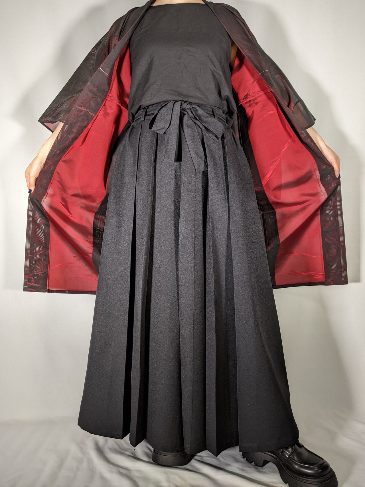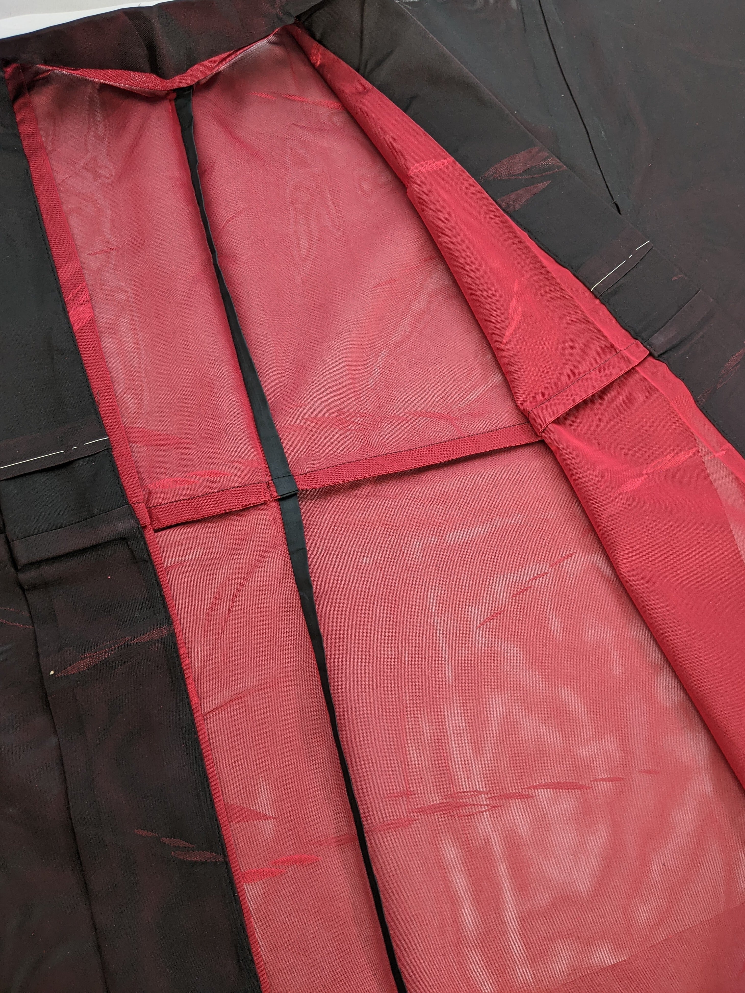 【14105】 着物リメイク 夏物着物 透け感 黒 裏地赤 ロングコート kimono tomesode remake long coat black red