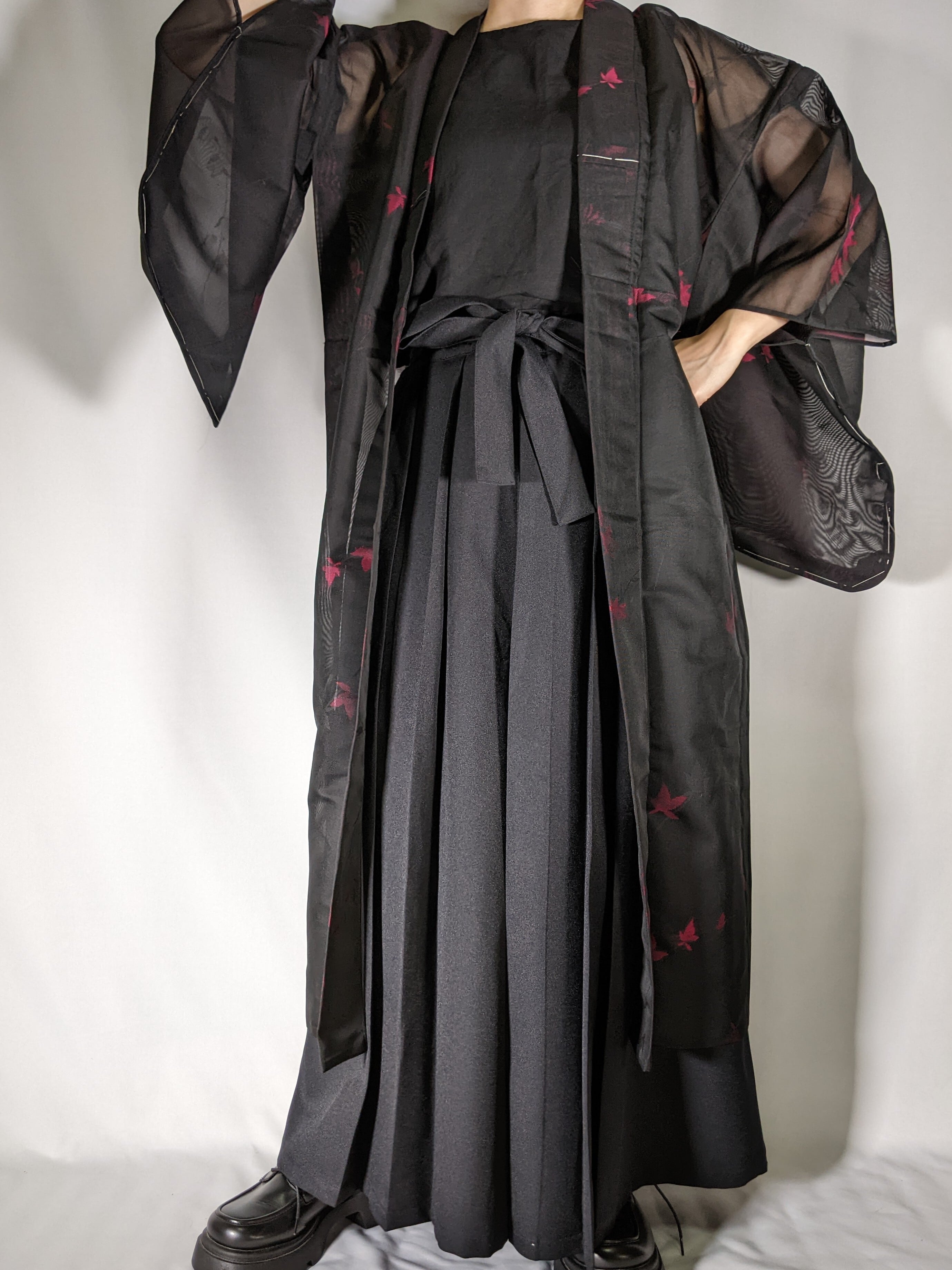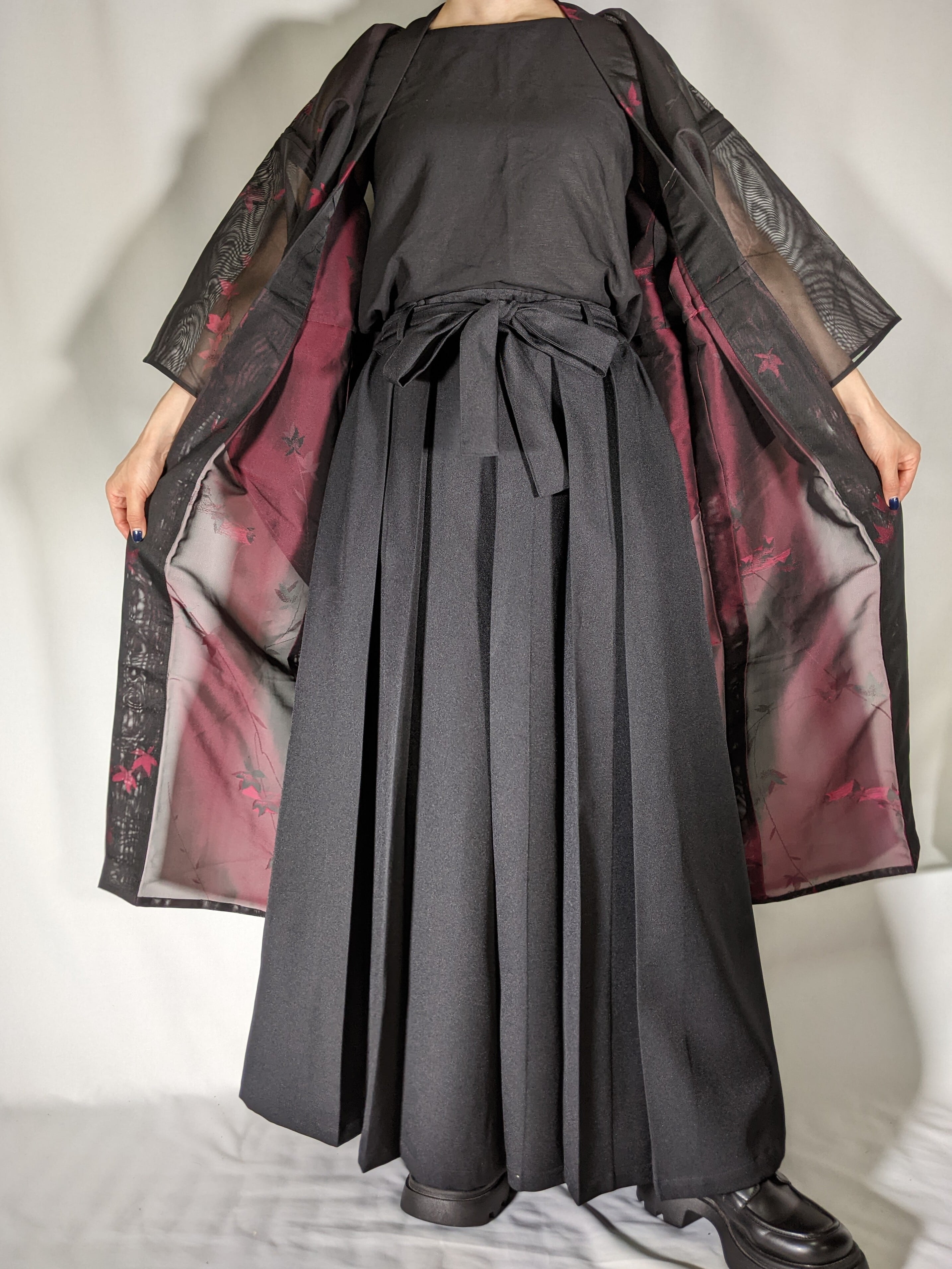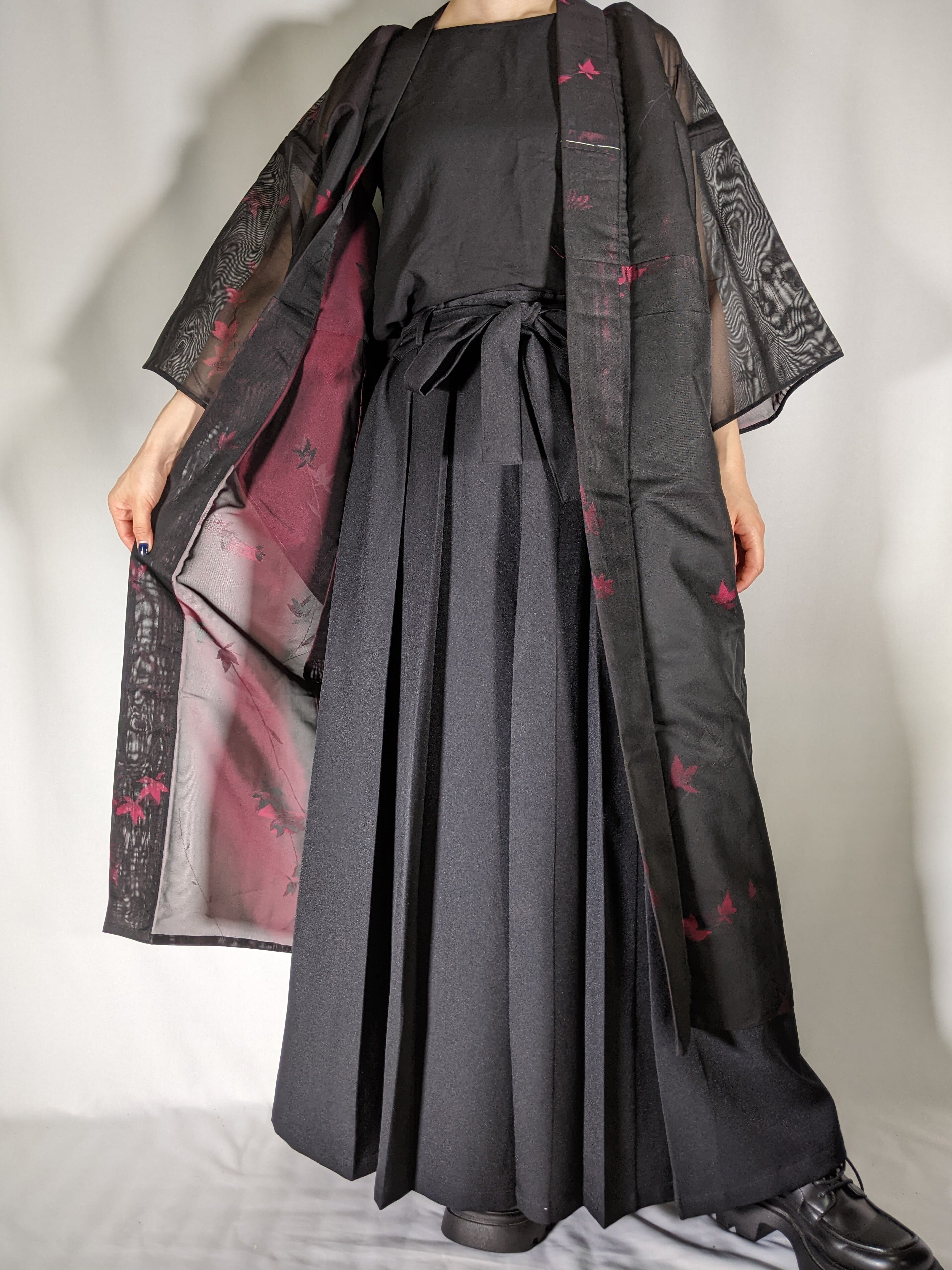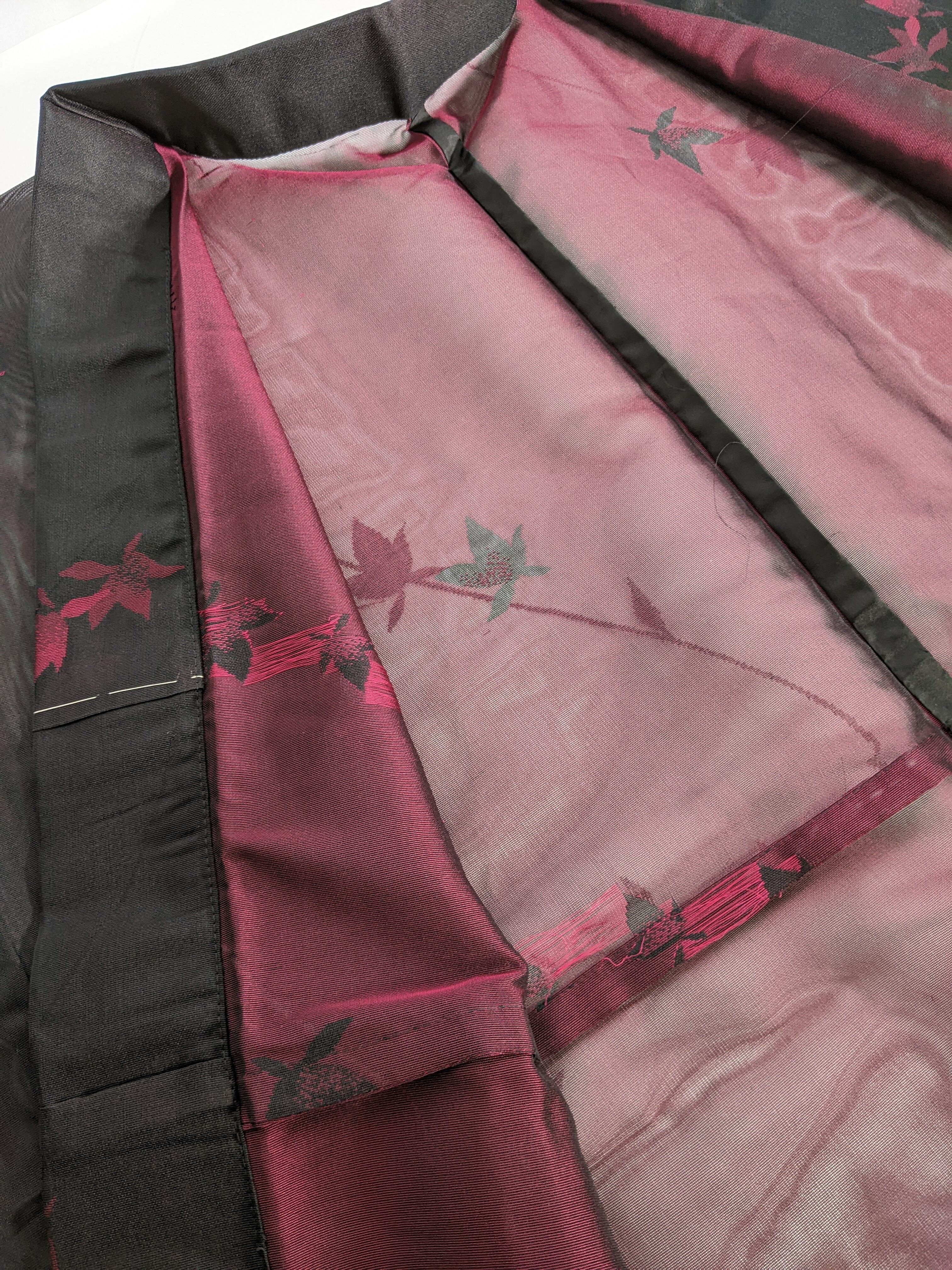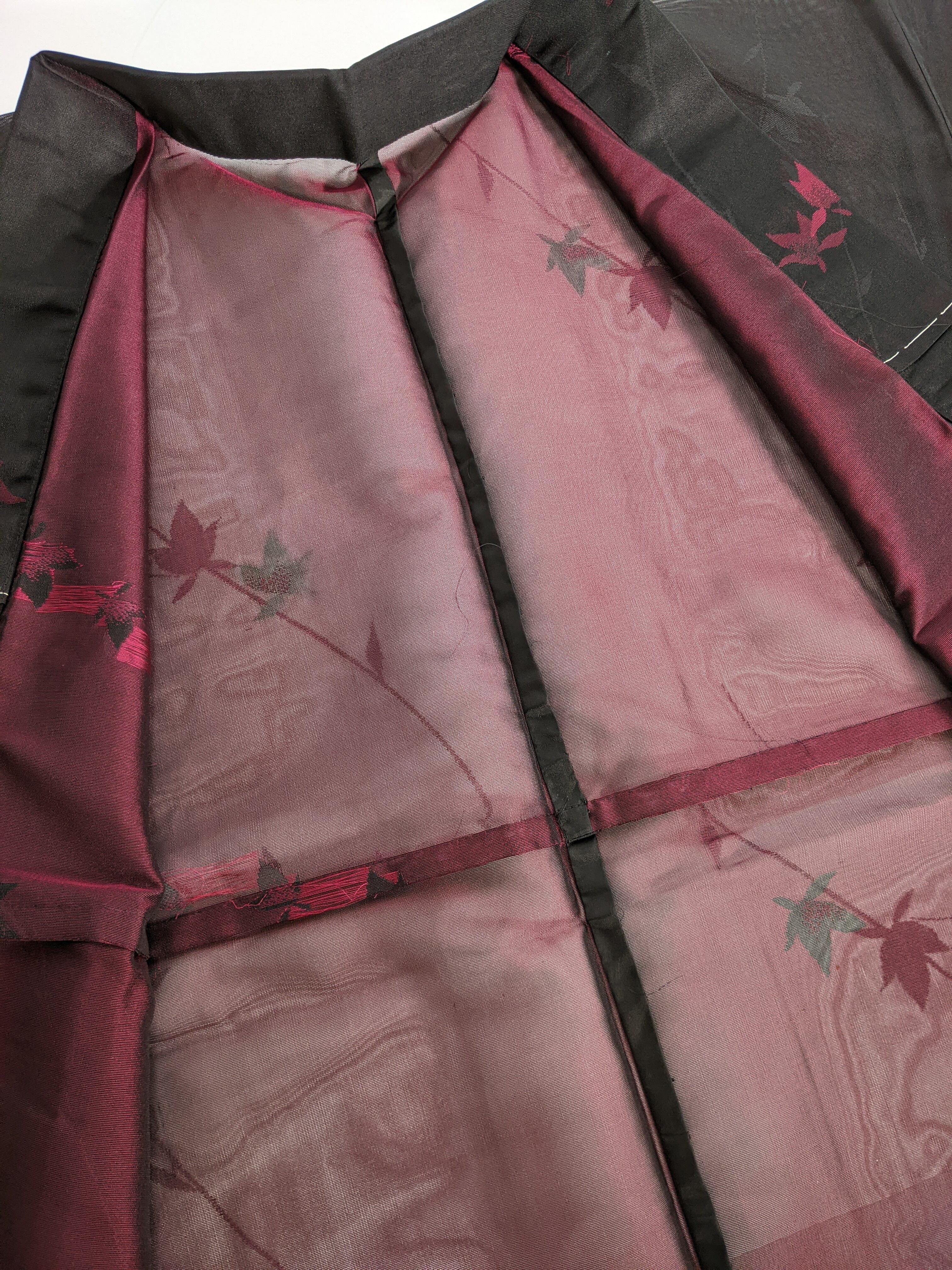 【14116】 着物リメイク 夏物着物 透け感 黒 裏地ピンク ロングコート kimono tomesode remake long coat black pink