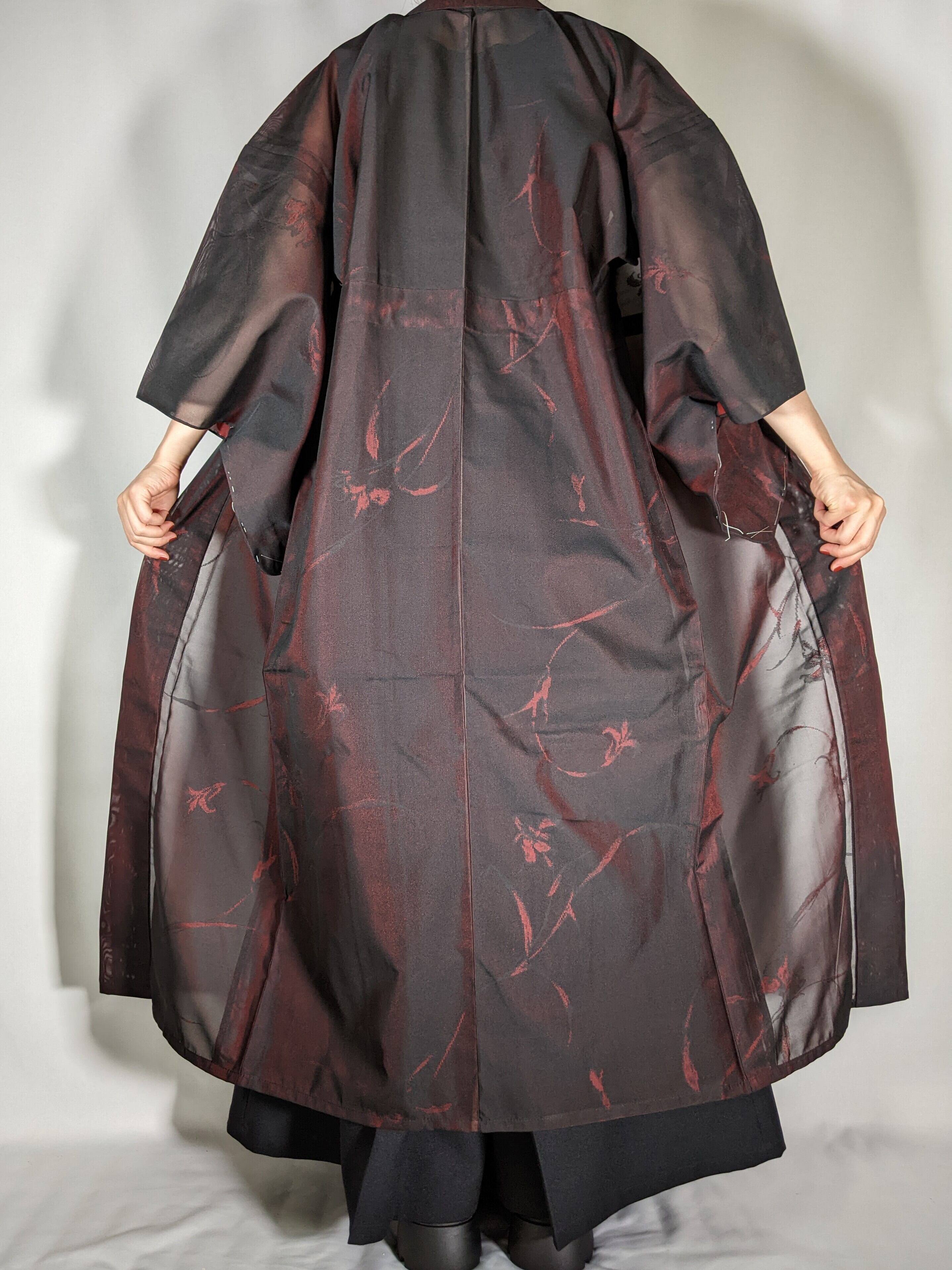 【14127】 着物リメイク 夏物着物 透け感 黒 裏地赤 植物模様 ロングコート kimono tomesode remake long coat black