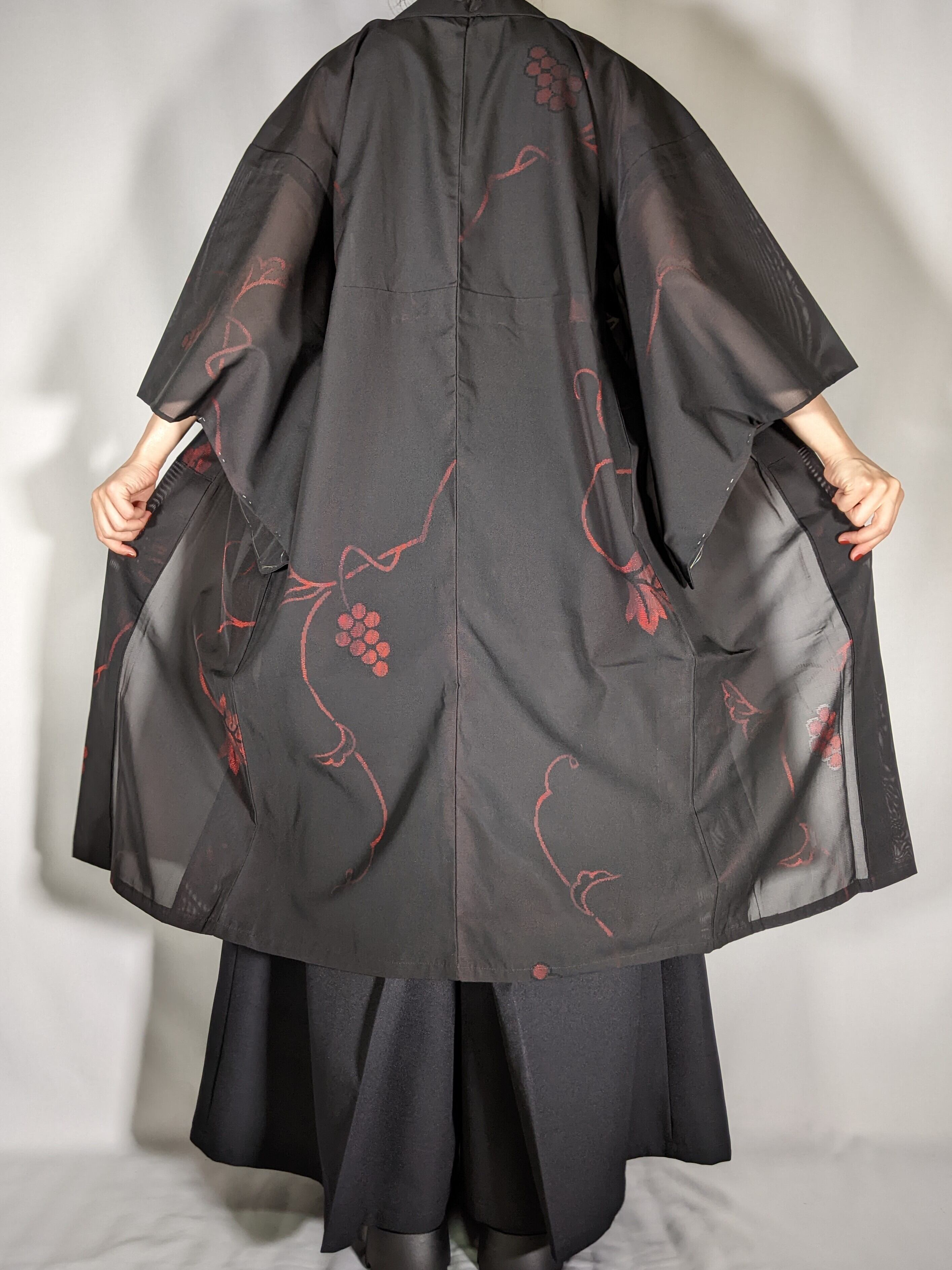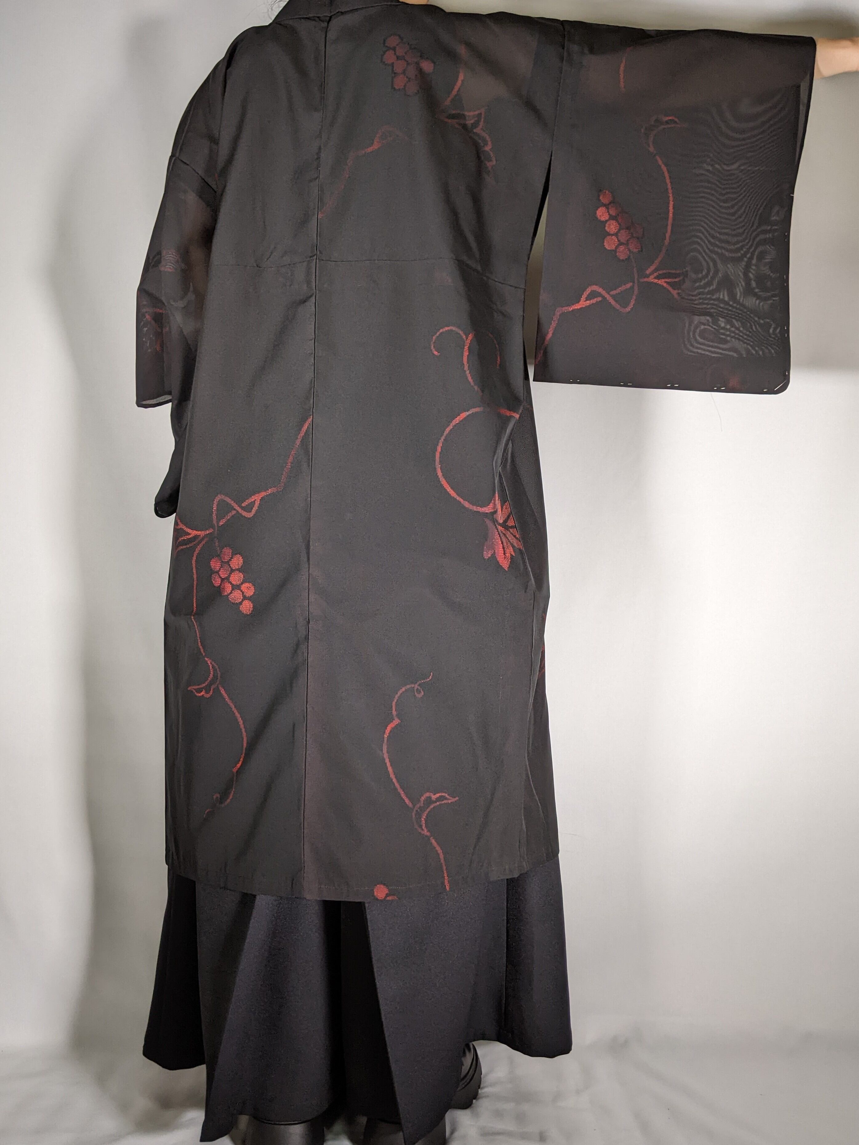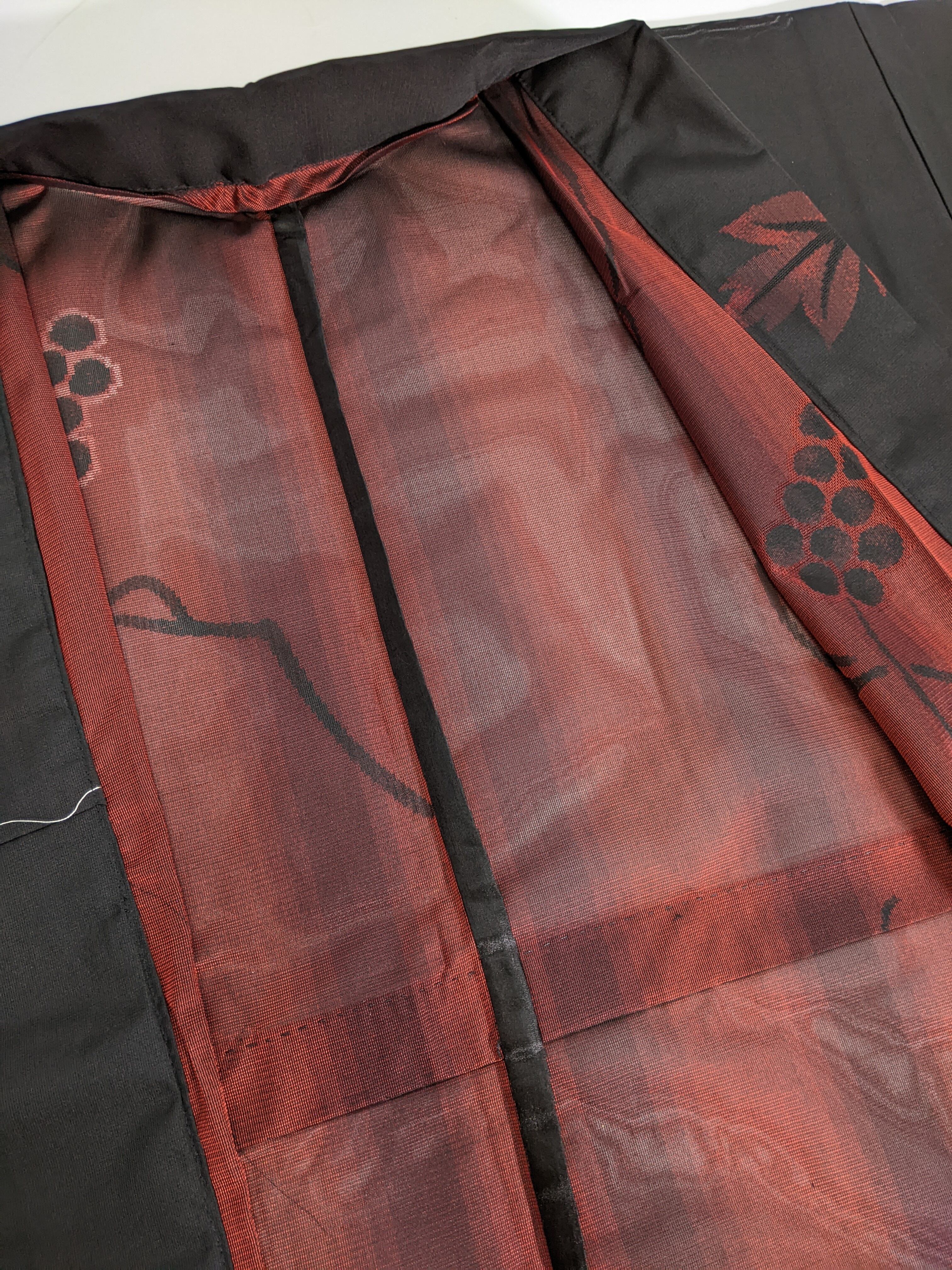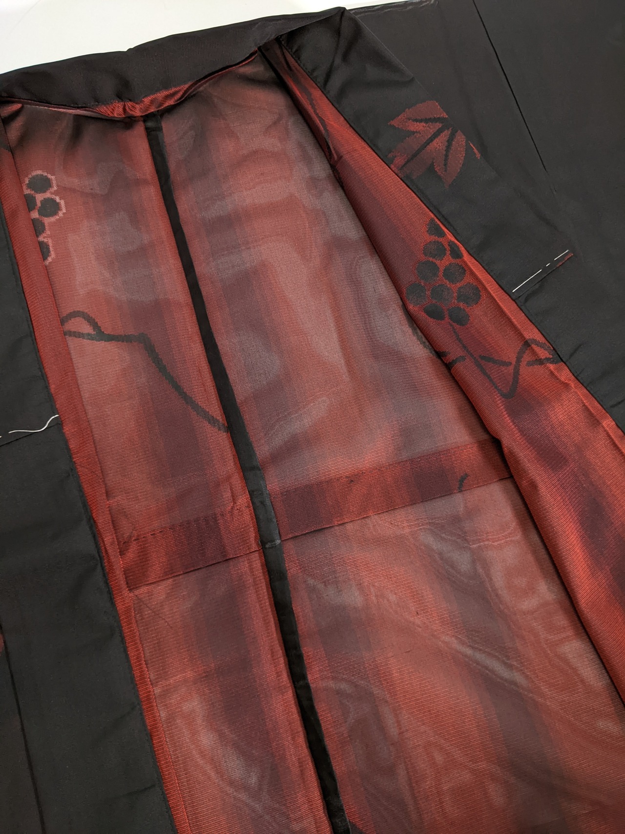 【14128】 着物リメイク 夏物着物 透け感 黒 裏地赤 葡萄模様 ロングコート kimono tomesode remake long coat black