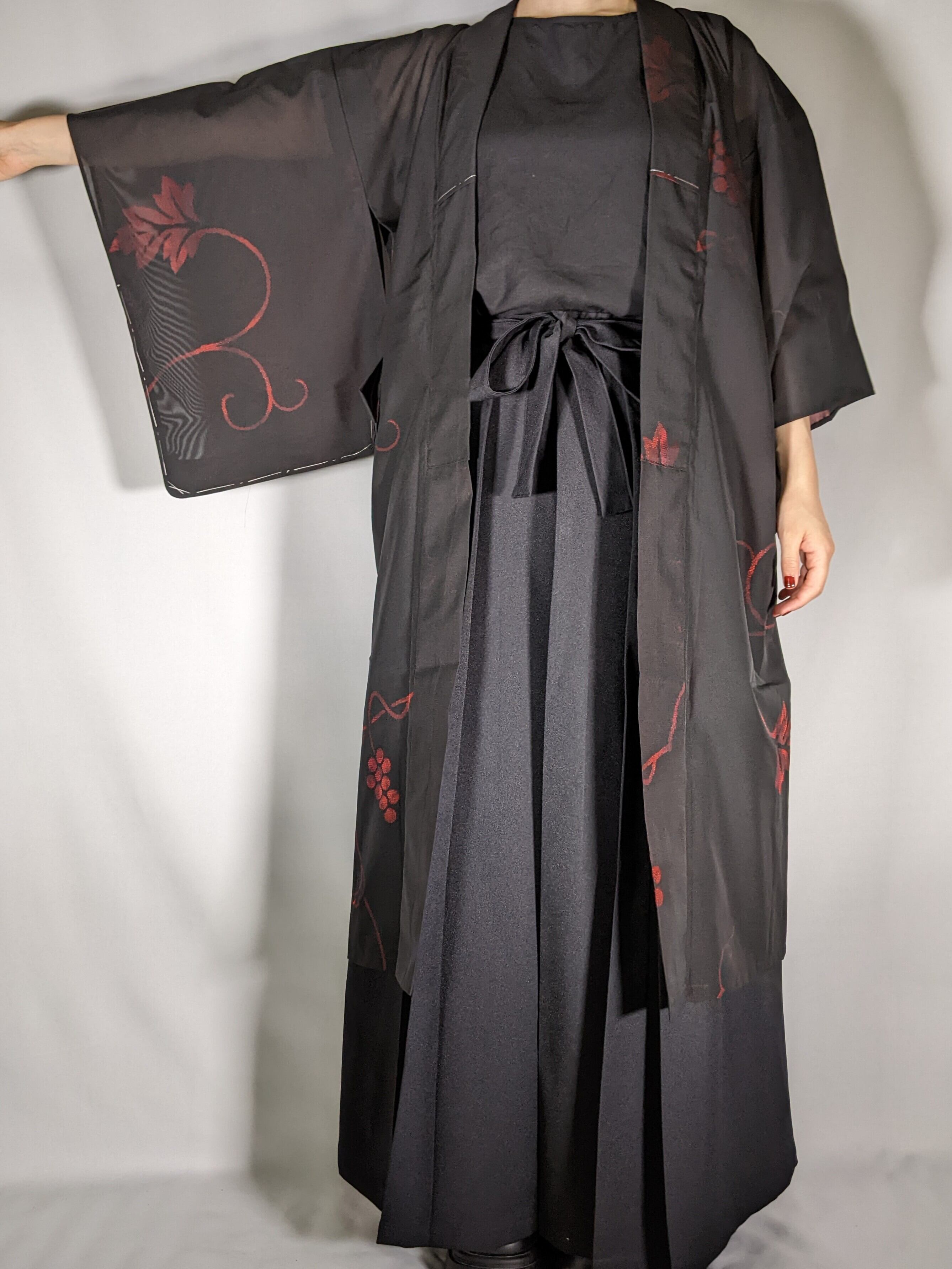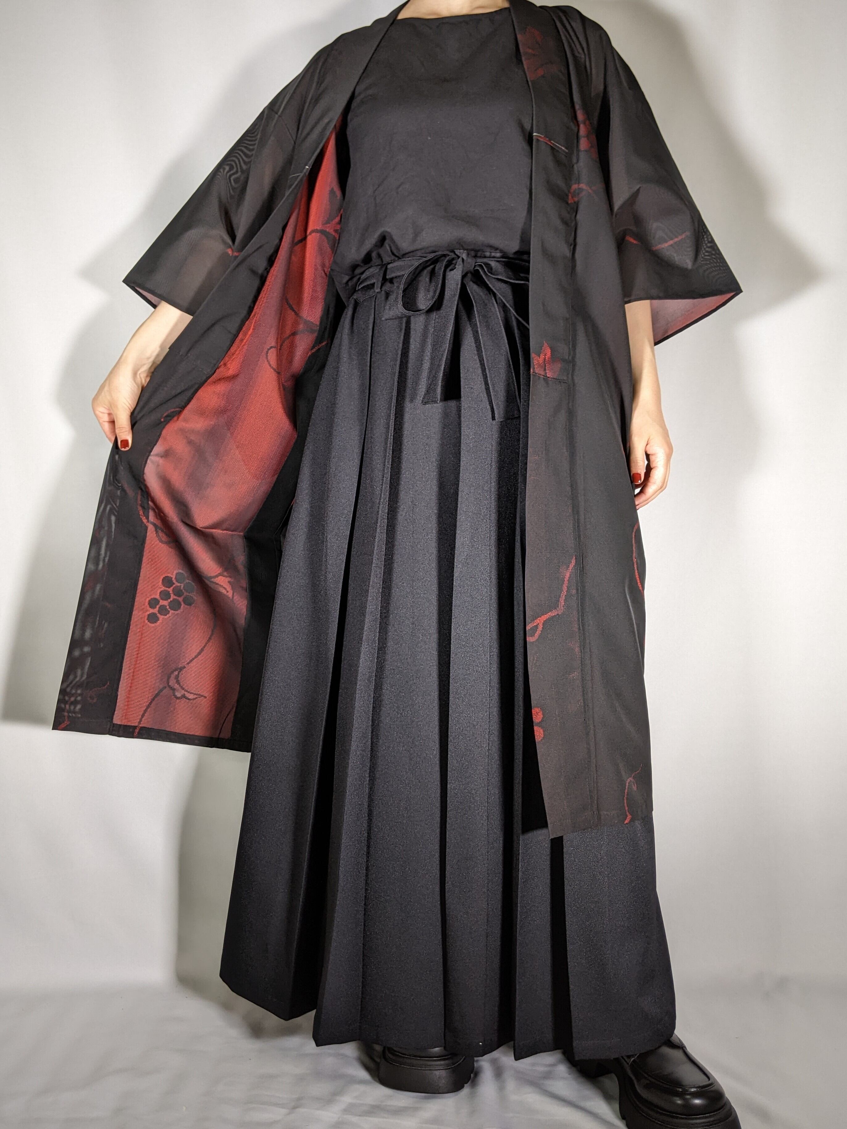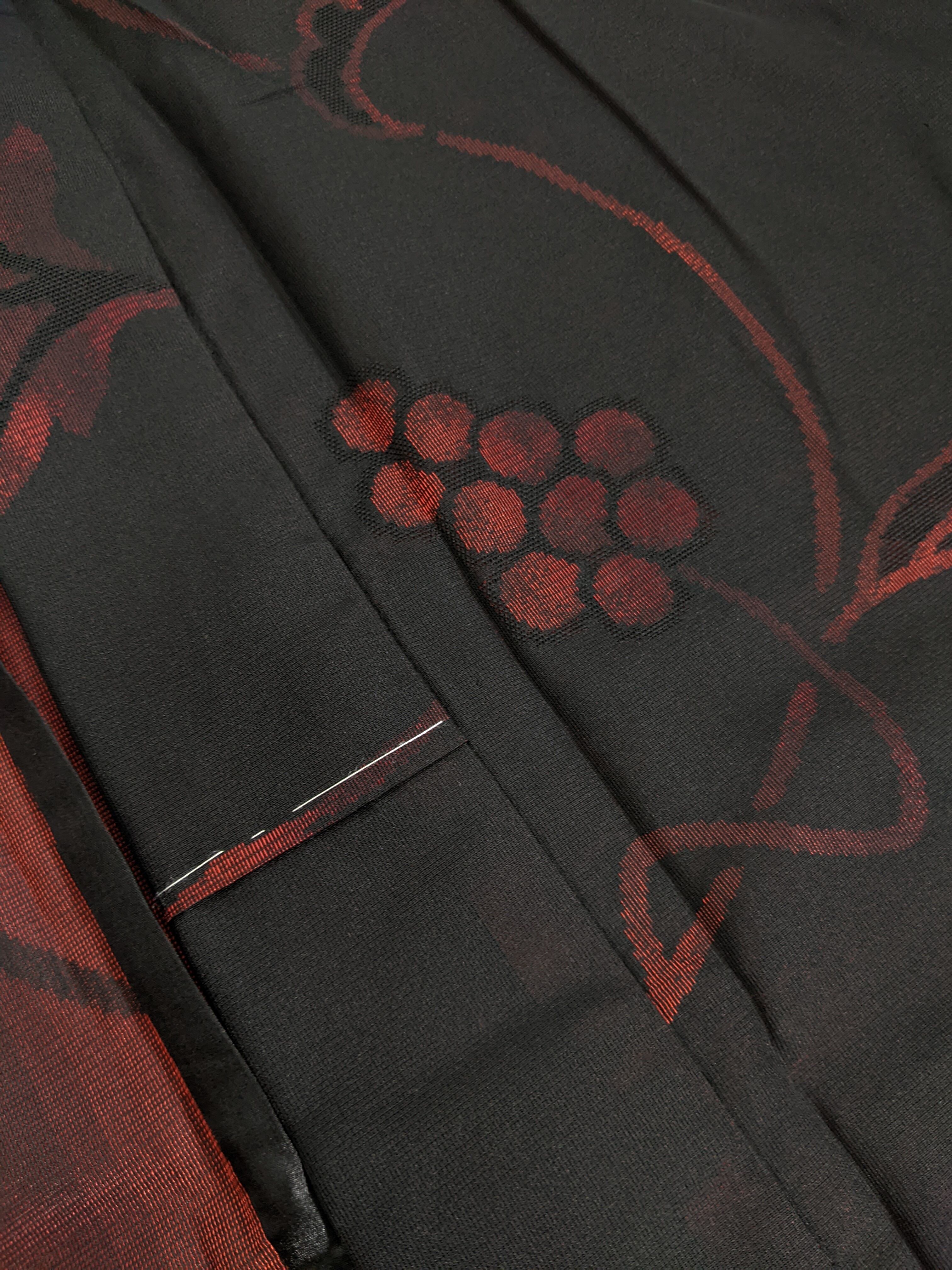 【14128】 着物リメイク 夏物着物 透け感 黒 裏地赤 葡萄模様 ロングコート kimono tomesode remake long coat black