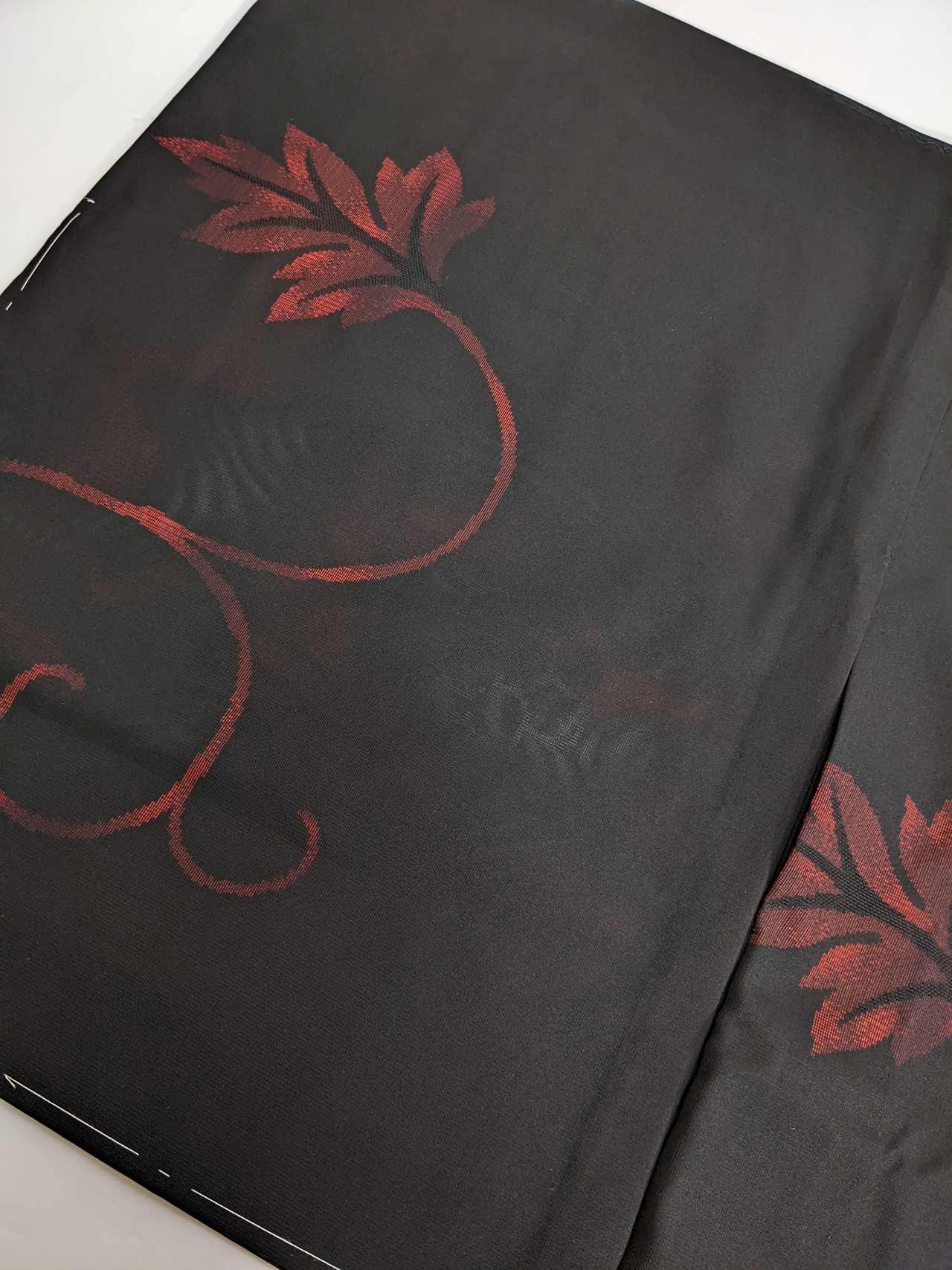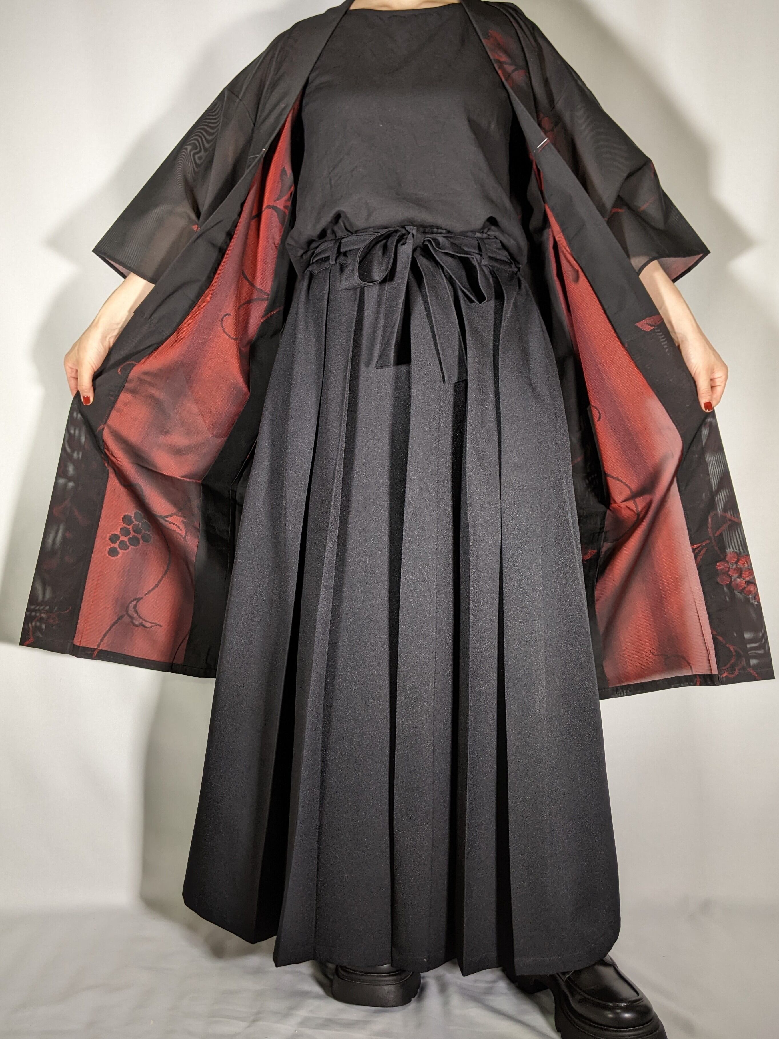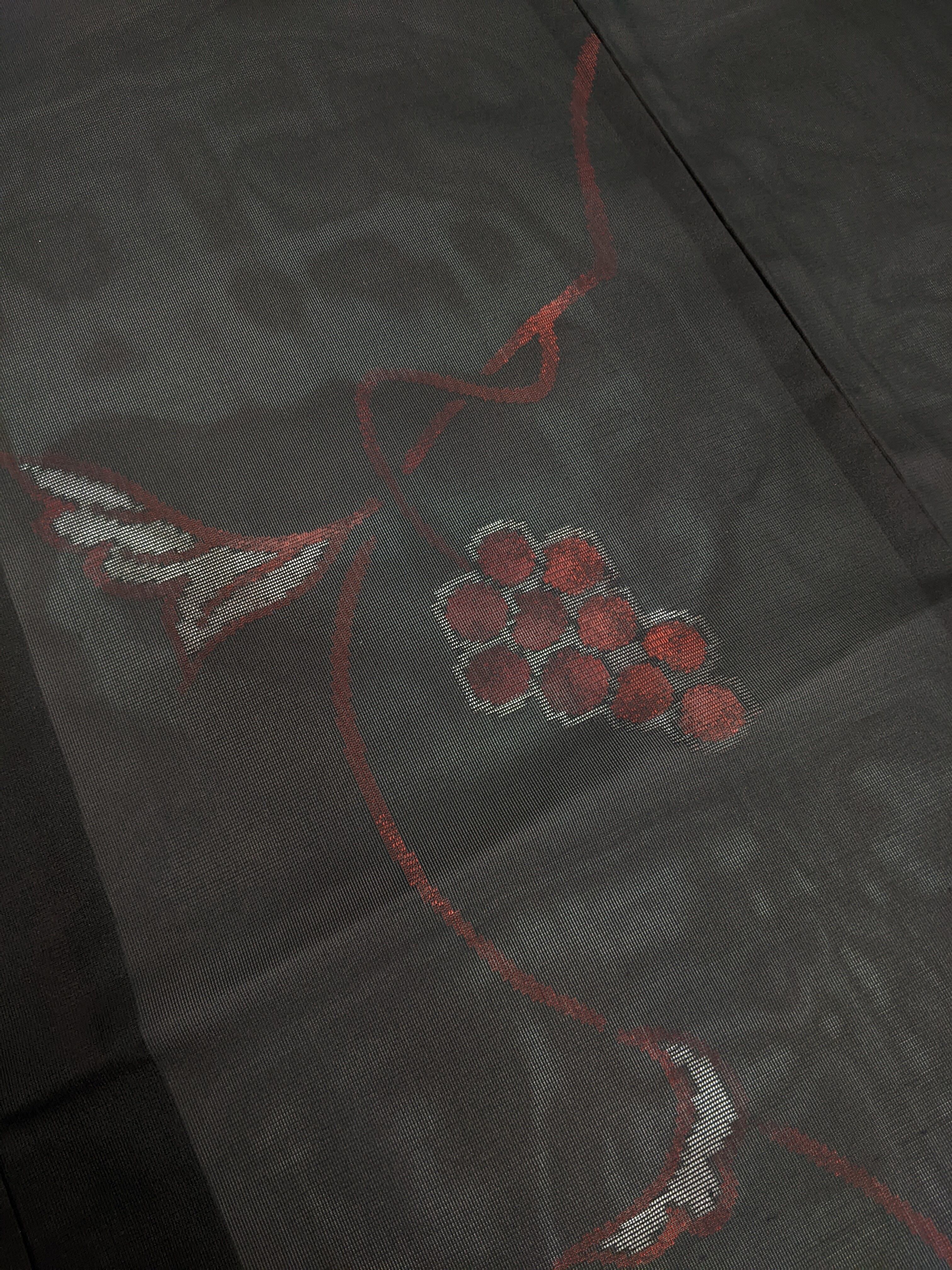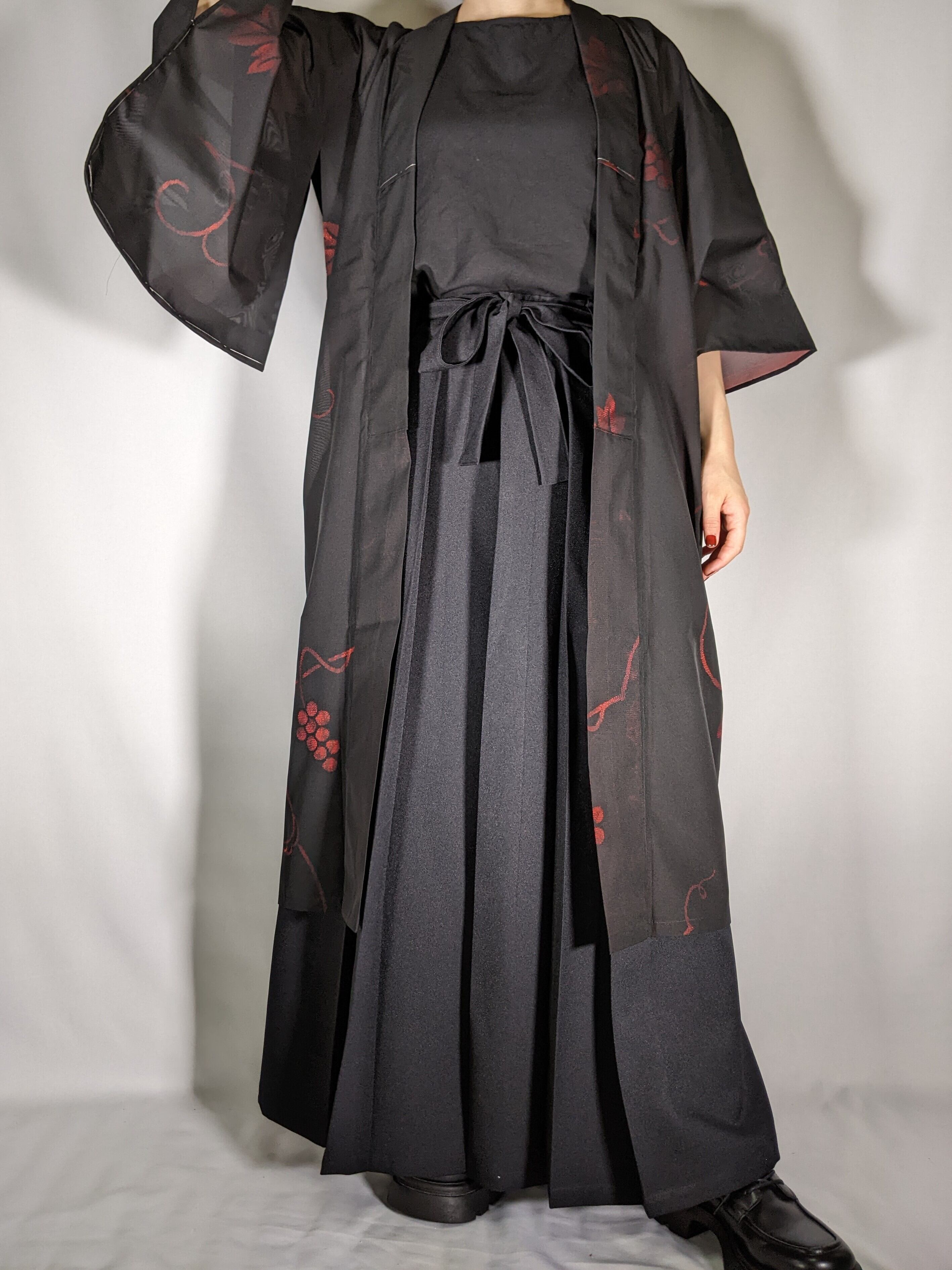 【14128】 着物リメイク 夏物着物 透け感 黒 裏地赤 葡萄模様 ロングコート kimono tomesode remake long coat black