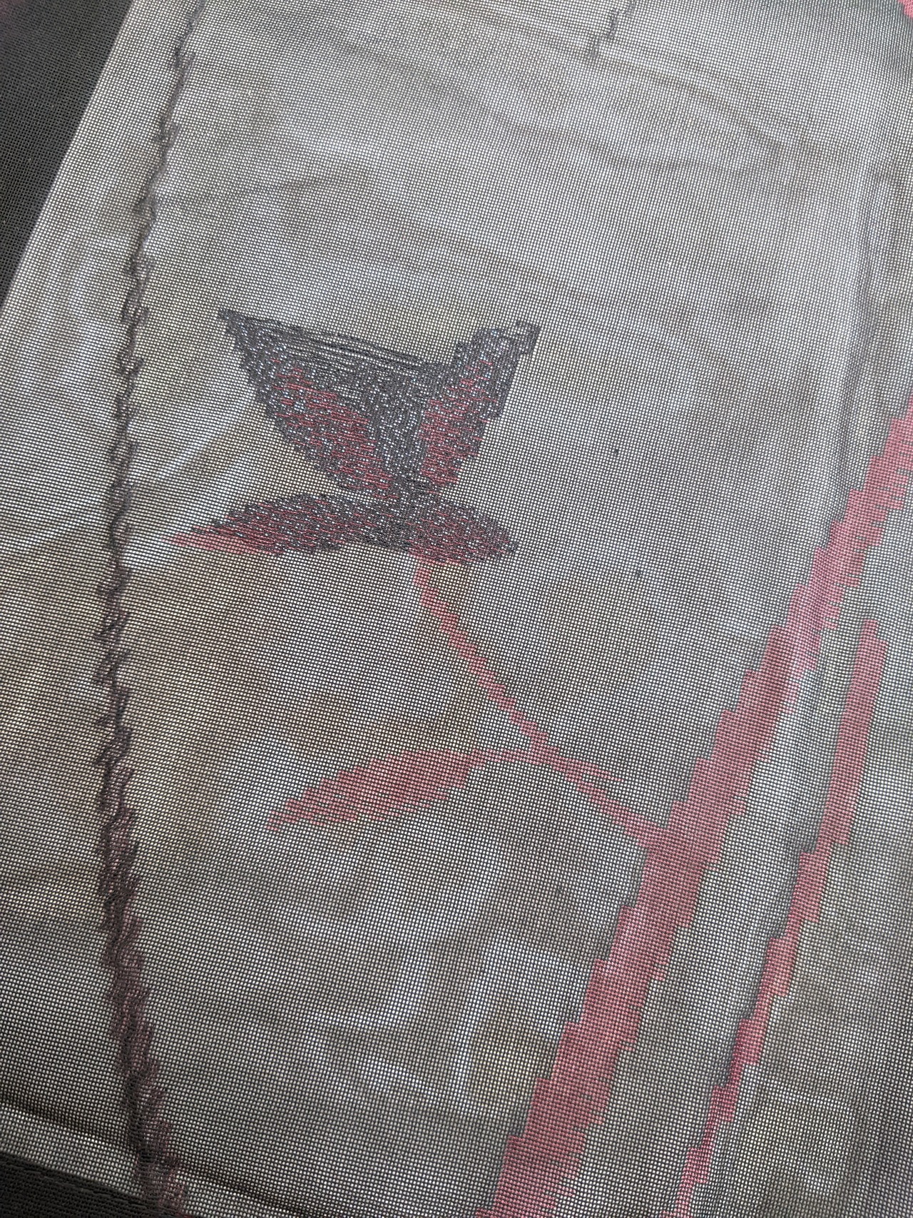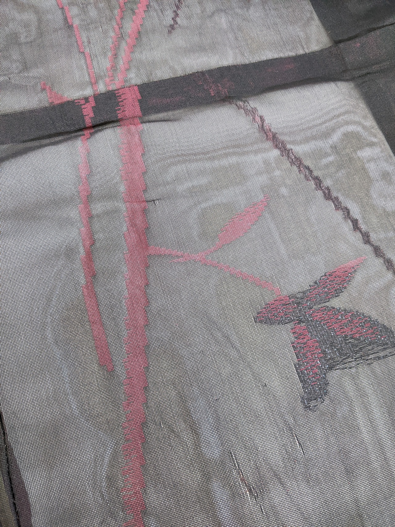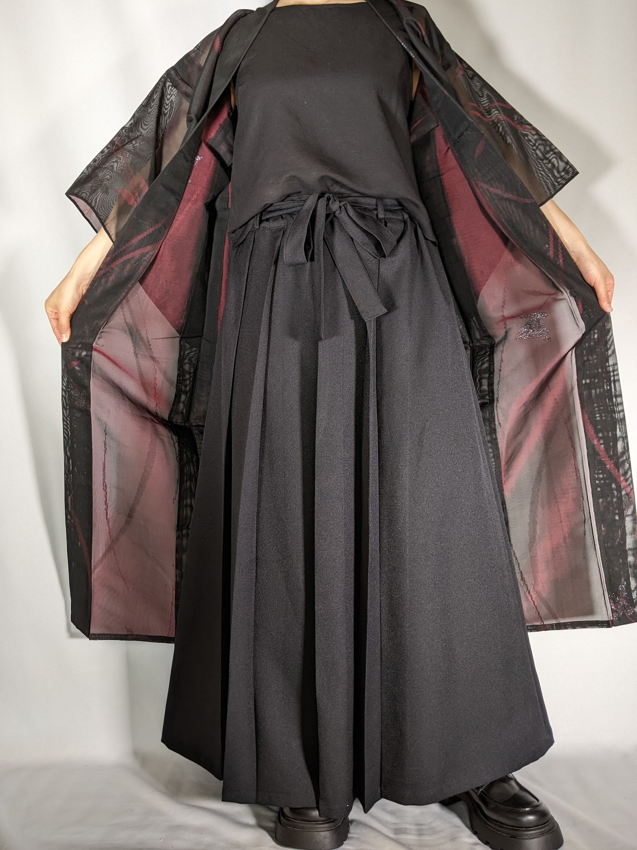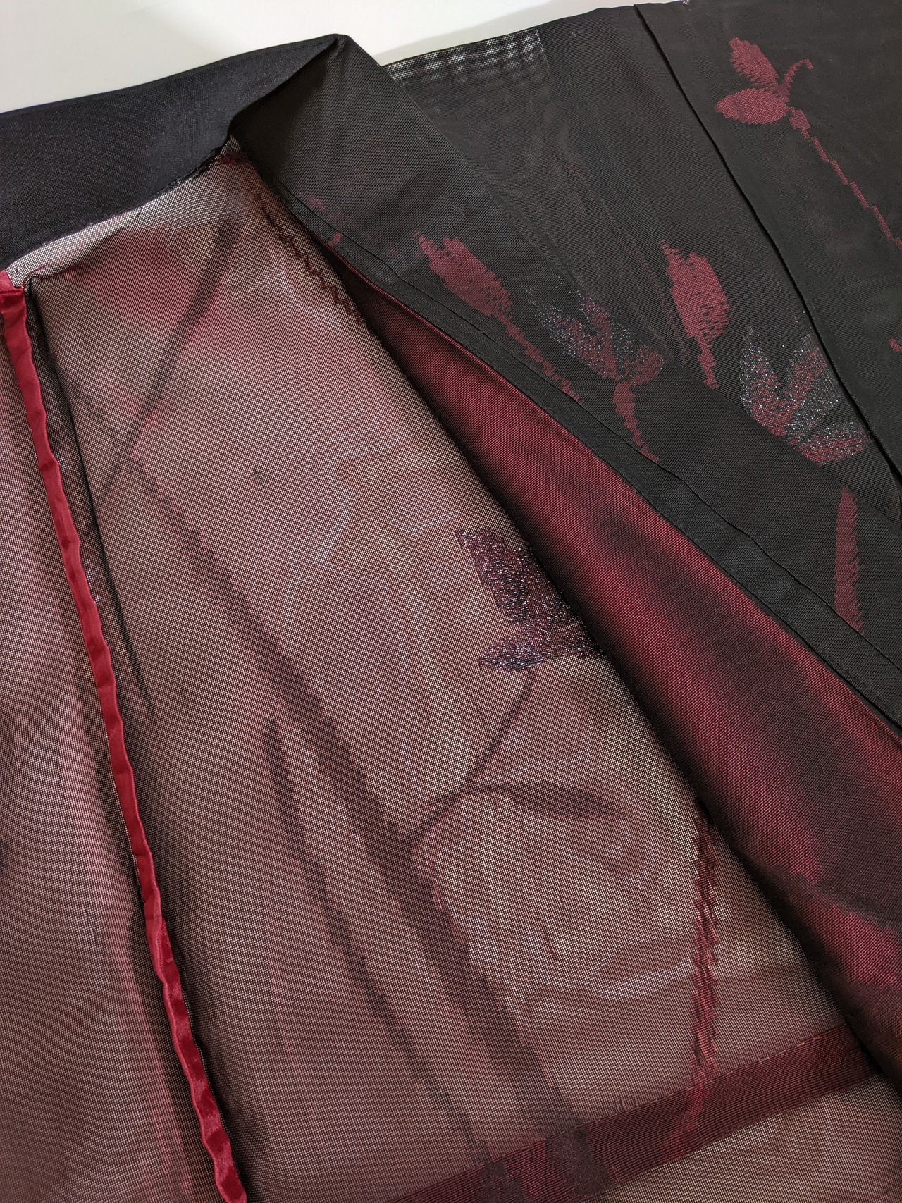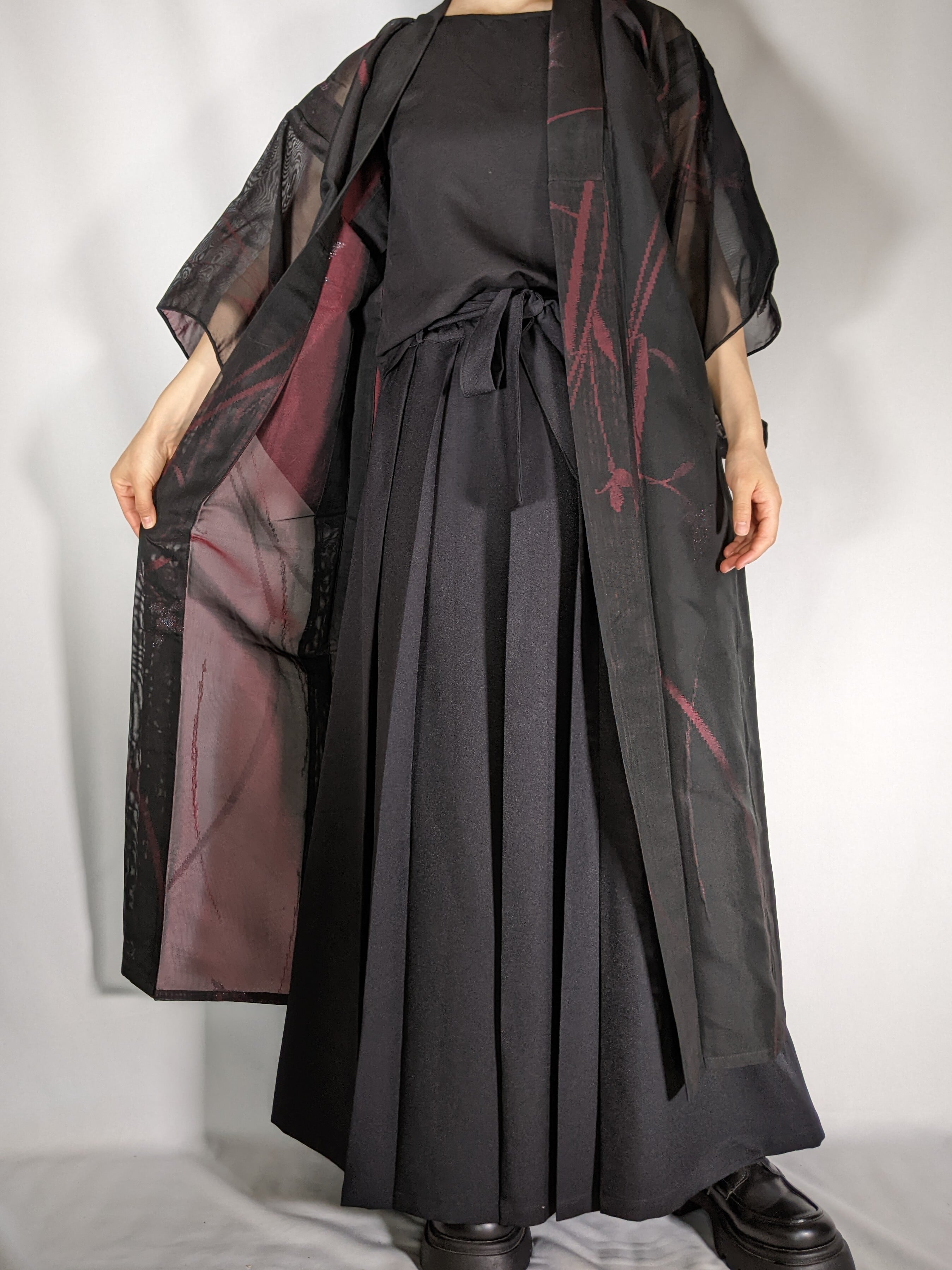 【14212】 着物リメイク 夏物着物 透け感 黒 裏地赤 ロングコート sheer kimono remake long coat black red