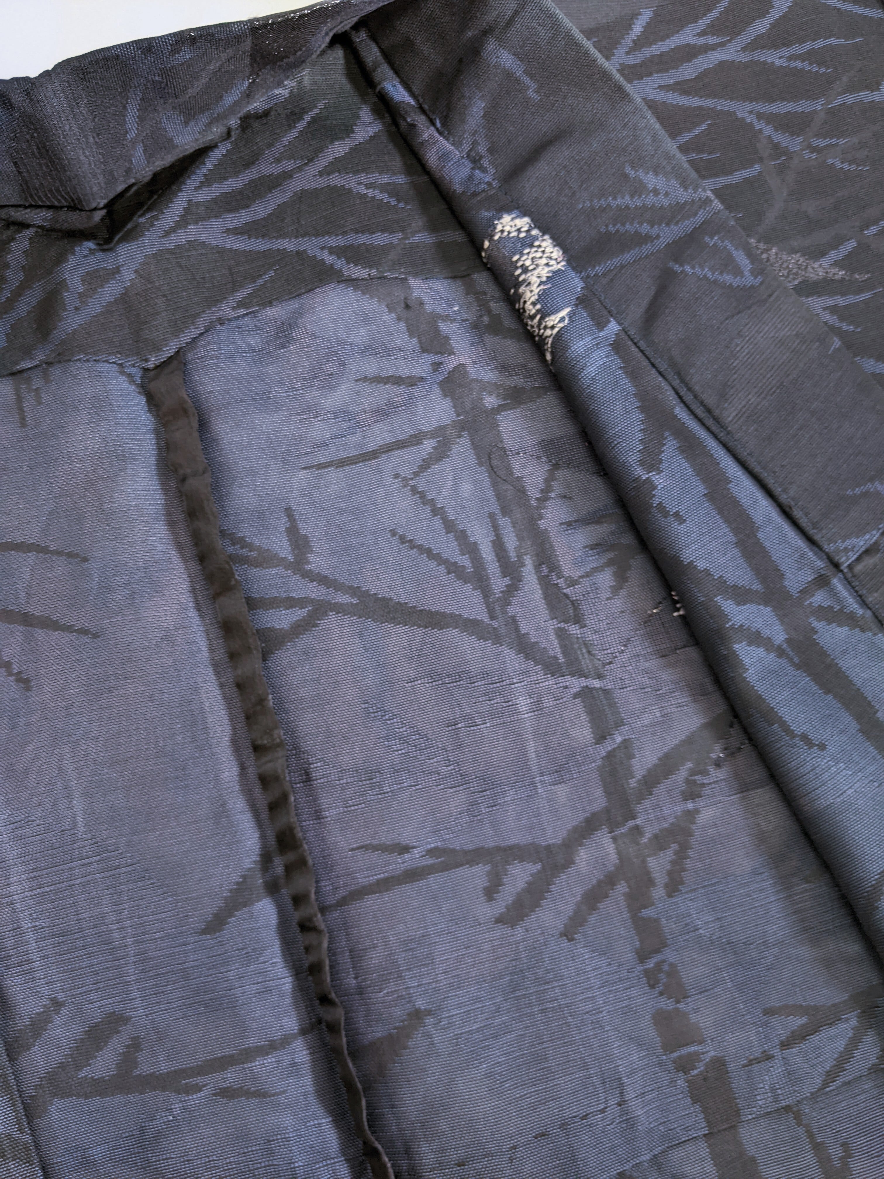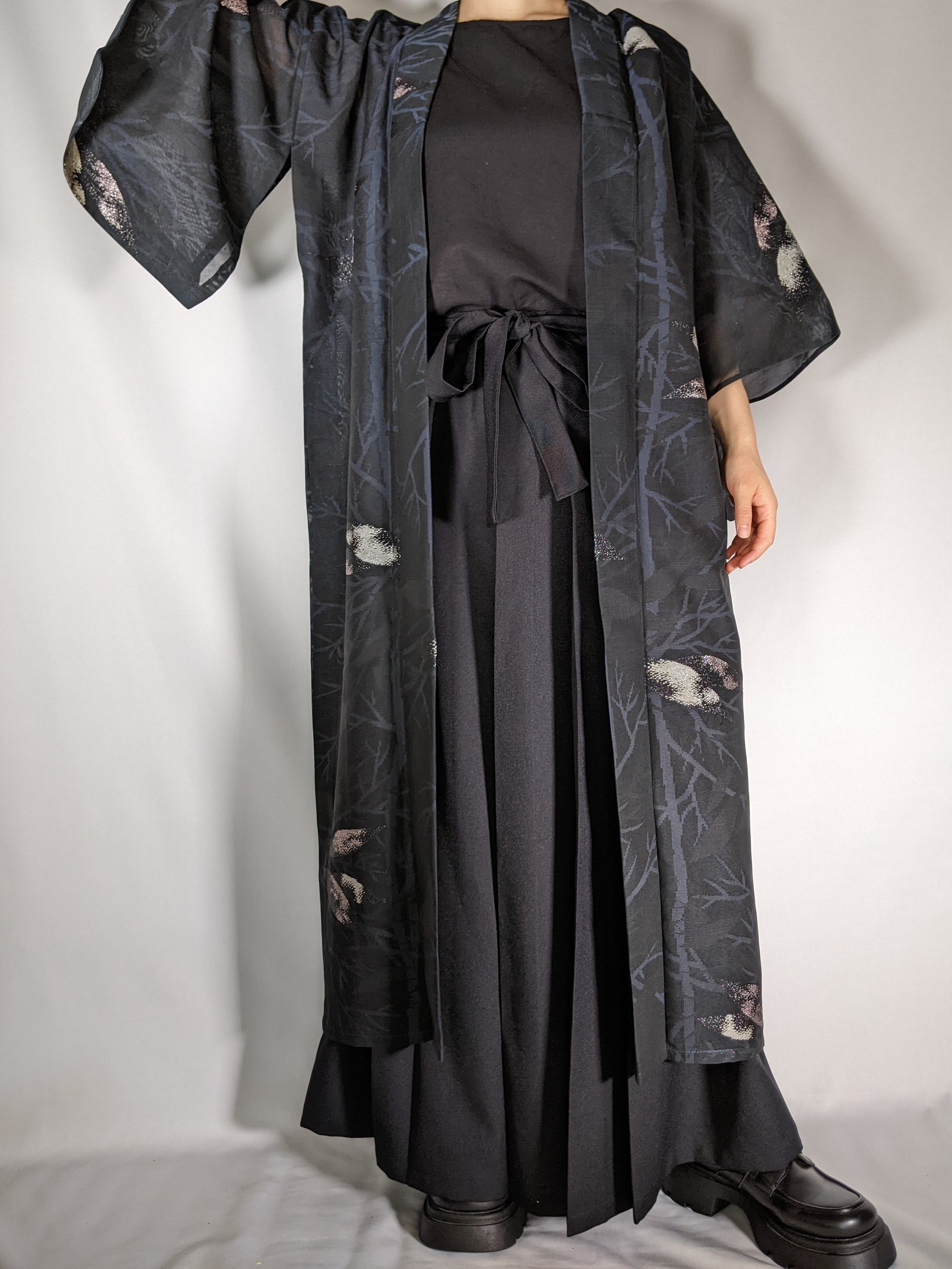 【14213】 着物リメイク 夏物着物 透け感 黒 青系 植物模様 ロングコート sheer kimono remake long coat black blue