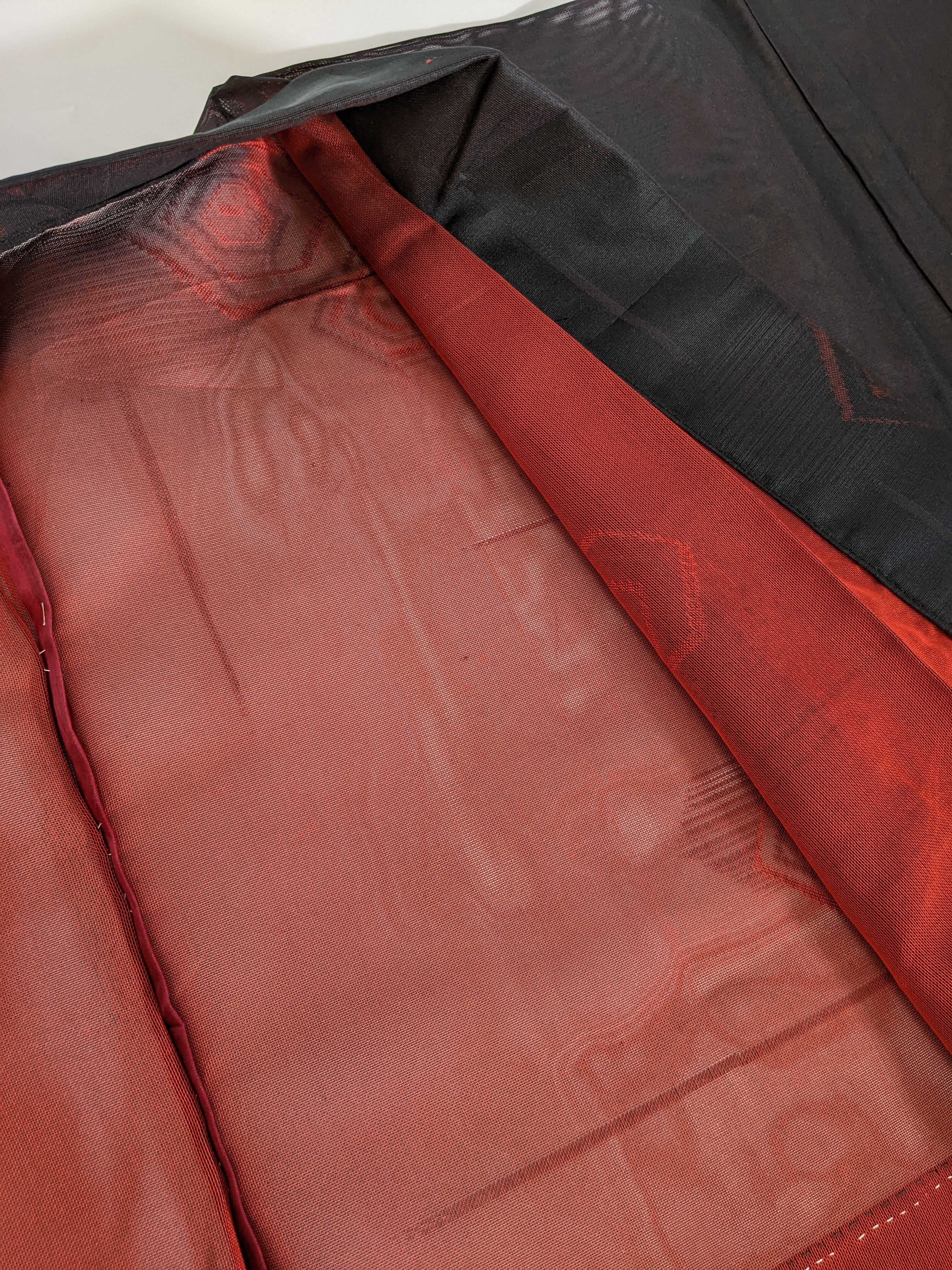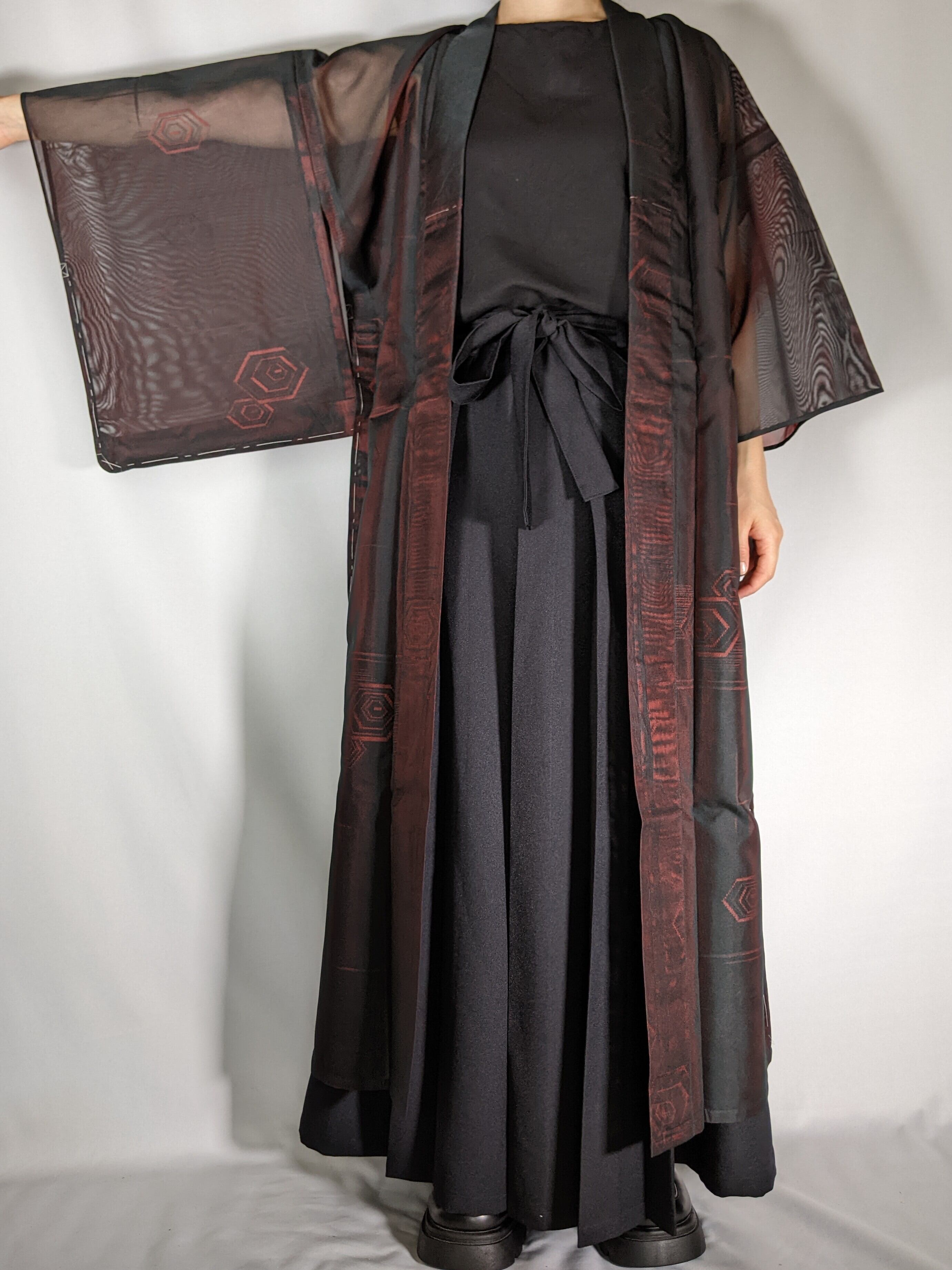【14214】 着物リメイク 夏物着物 透け感 黒 裏地赤 ロングコート sheer kimono remake long coat black red