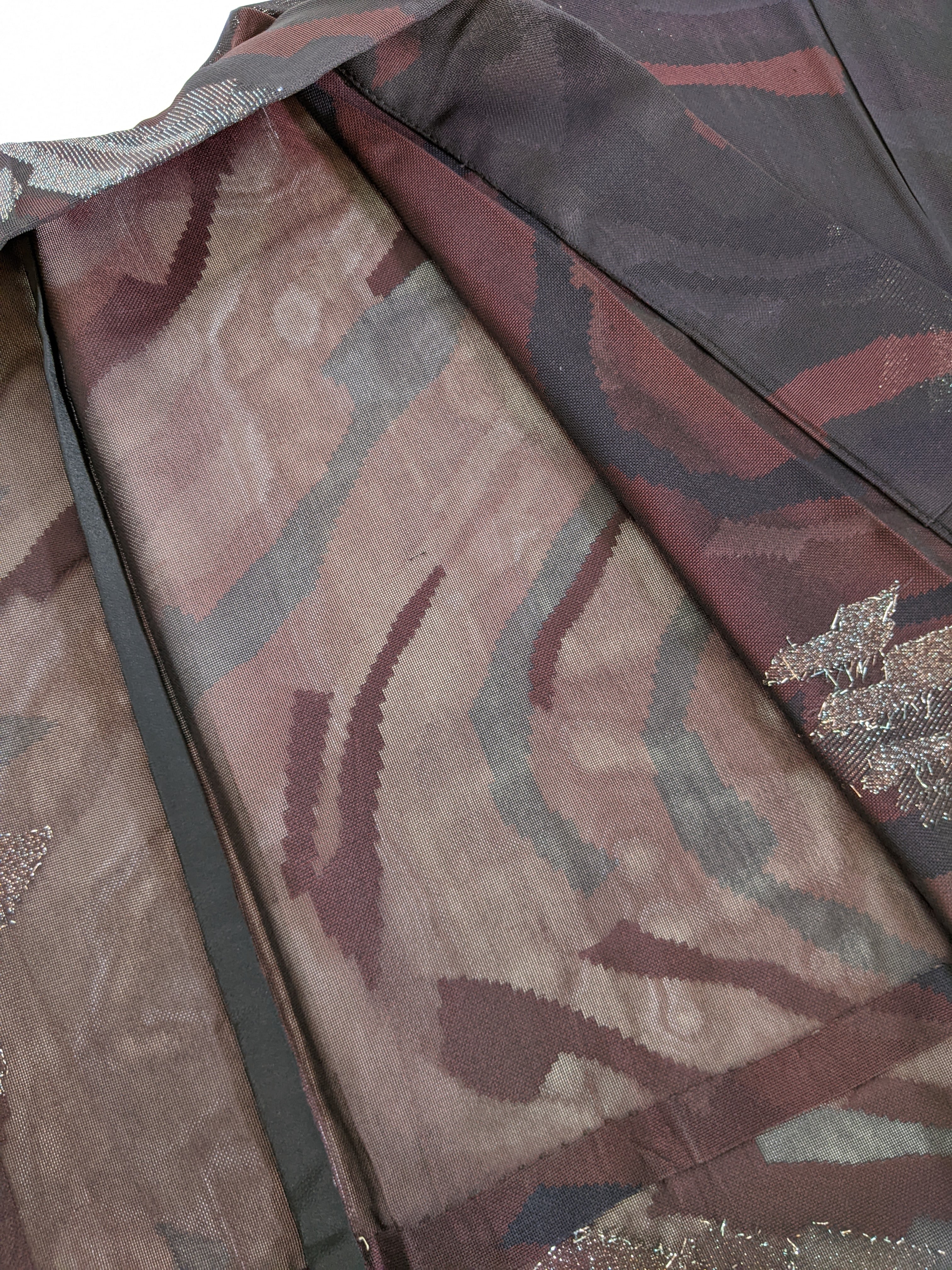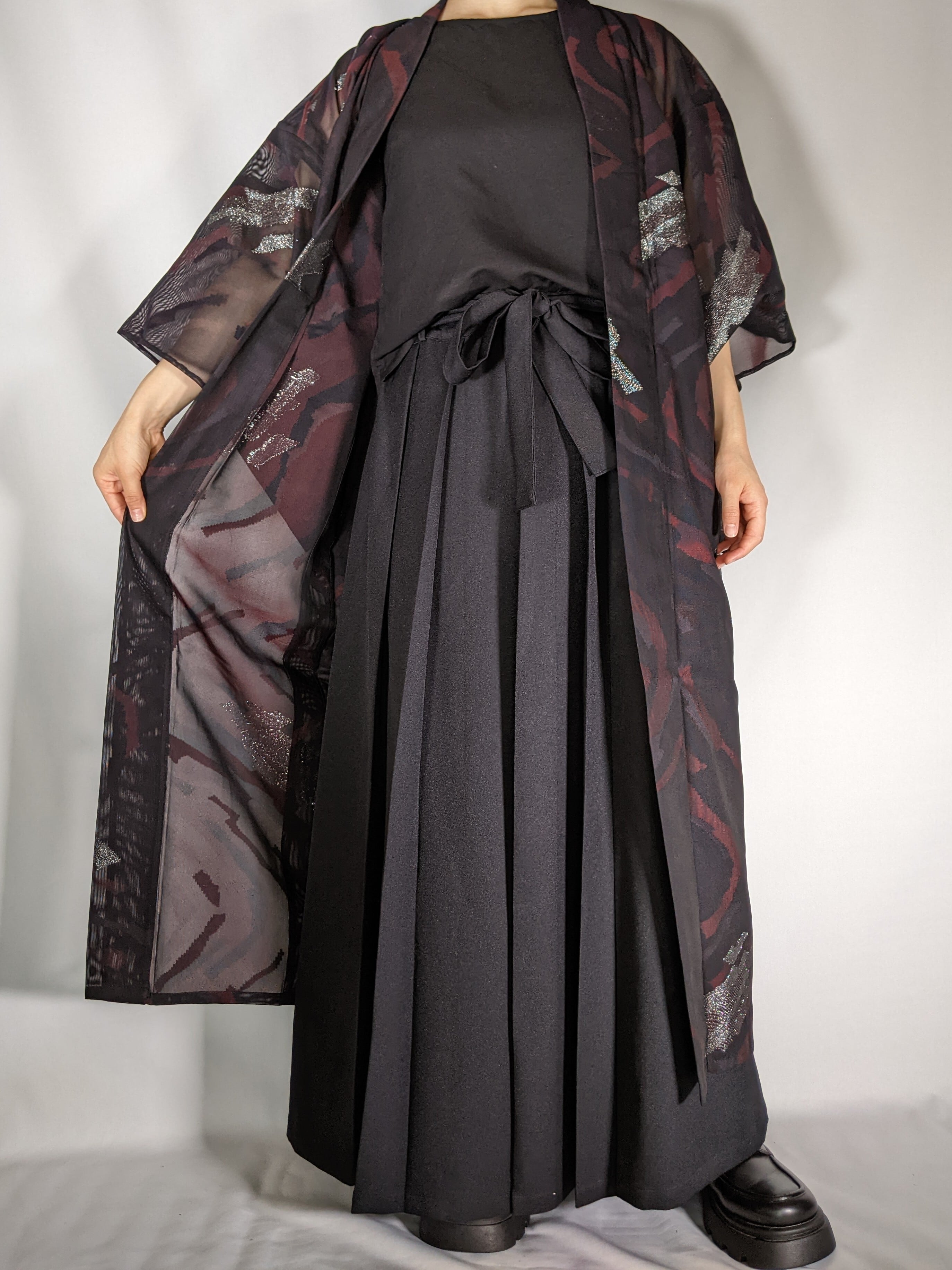 【14217】 着物リメイク 夏物着物 透け感 抽象模様 黒 赤 銀 ロングコート sheer kimono remake long coat