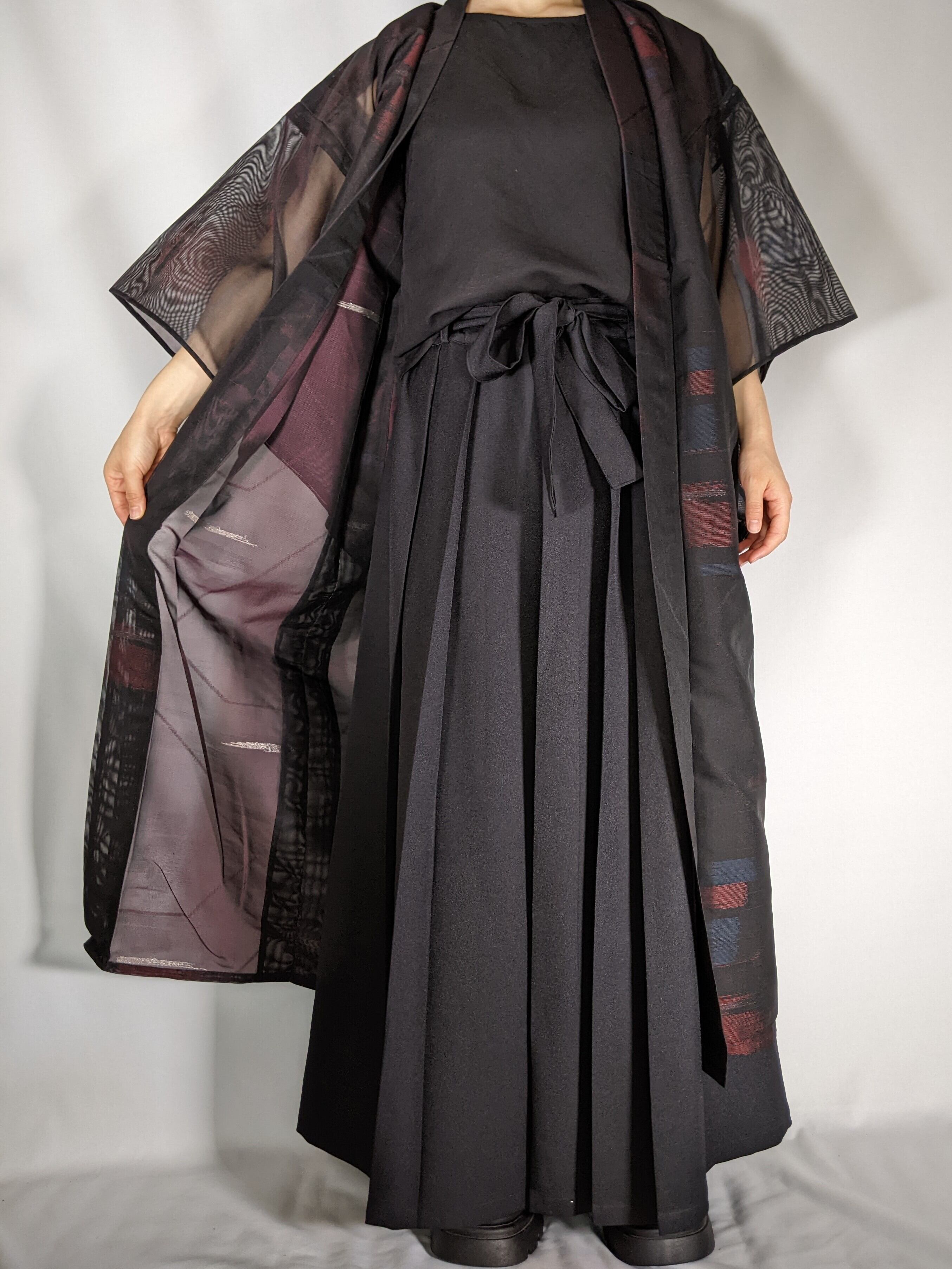 【14218】 着物リメイク 夏物着物 透け感 黒 赤 青 ロングコート sheer kimono remake long coat