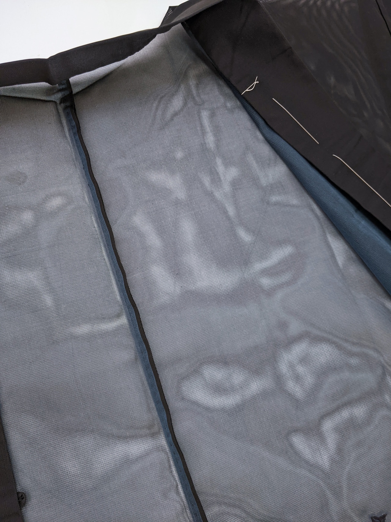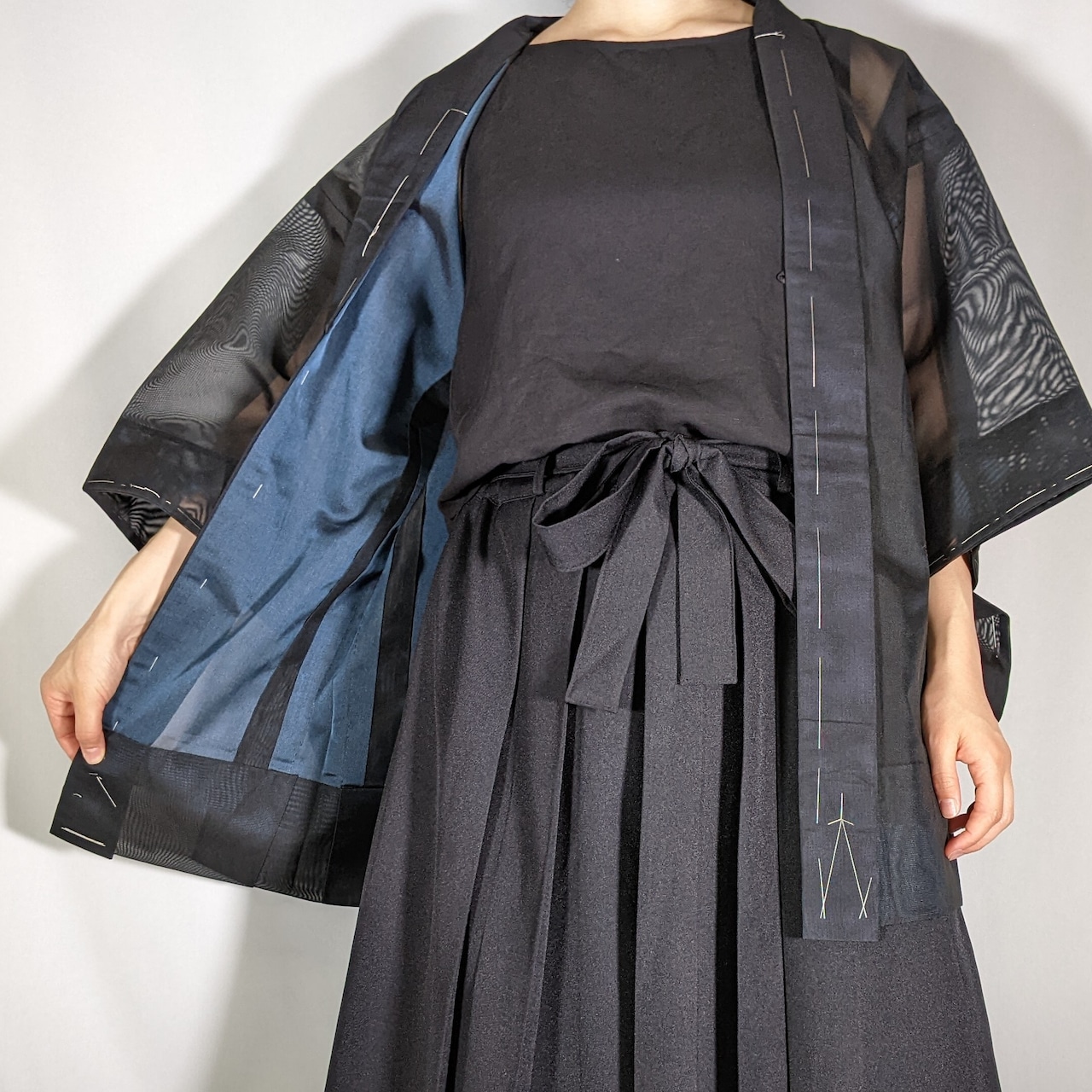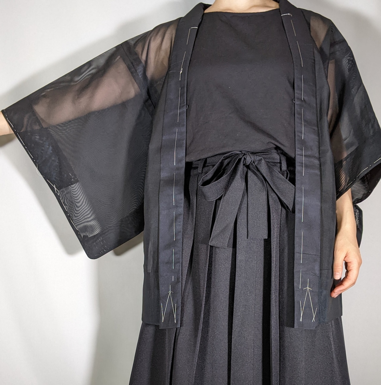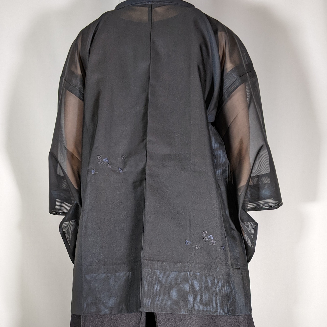 【14252】 ヴィンテージ 夏物羽織 黒 裏地青 刺繍 透け感 和洋折衷コーデ / Japanese vintage kimono haori jacket sheer for summer