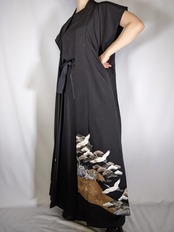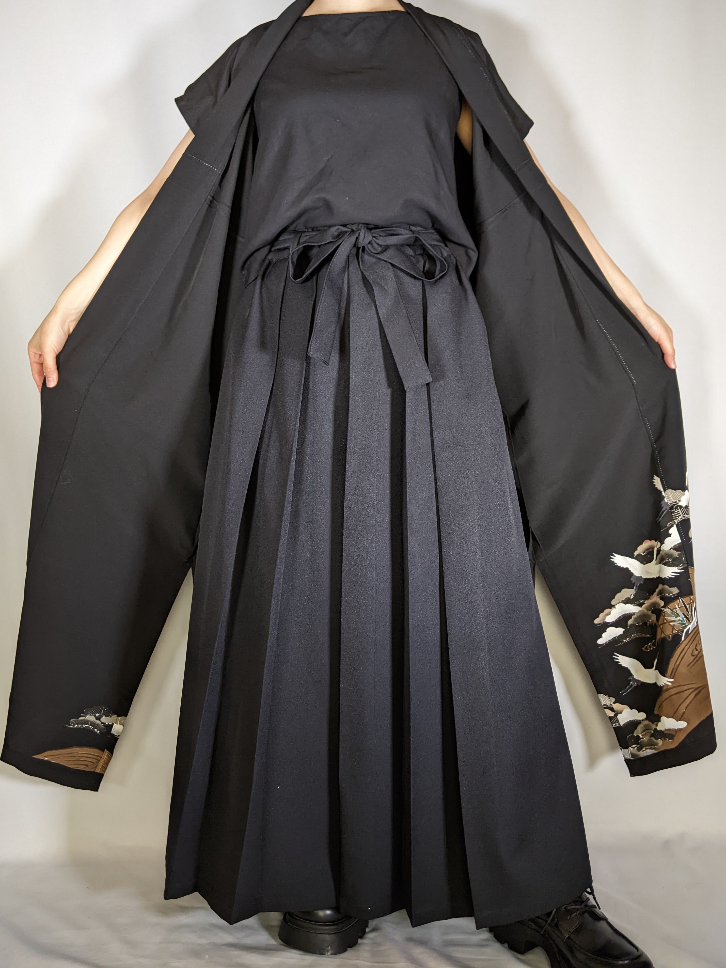 【14196】 陣羽織風 ロング羽織 + 巾着セット 着物リメイク 黒留袖 コート 鶴 松模様|Kimono Remake Long Haori ? Jinbaori Style + Drawstring Bag Set tomesode remake
