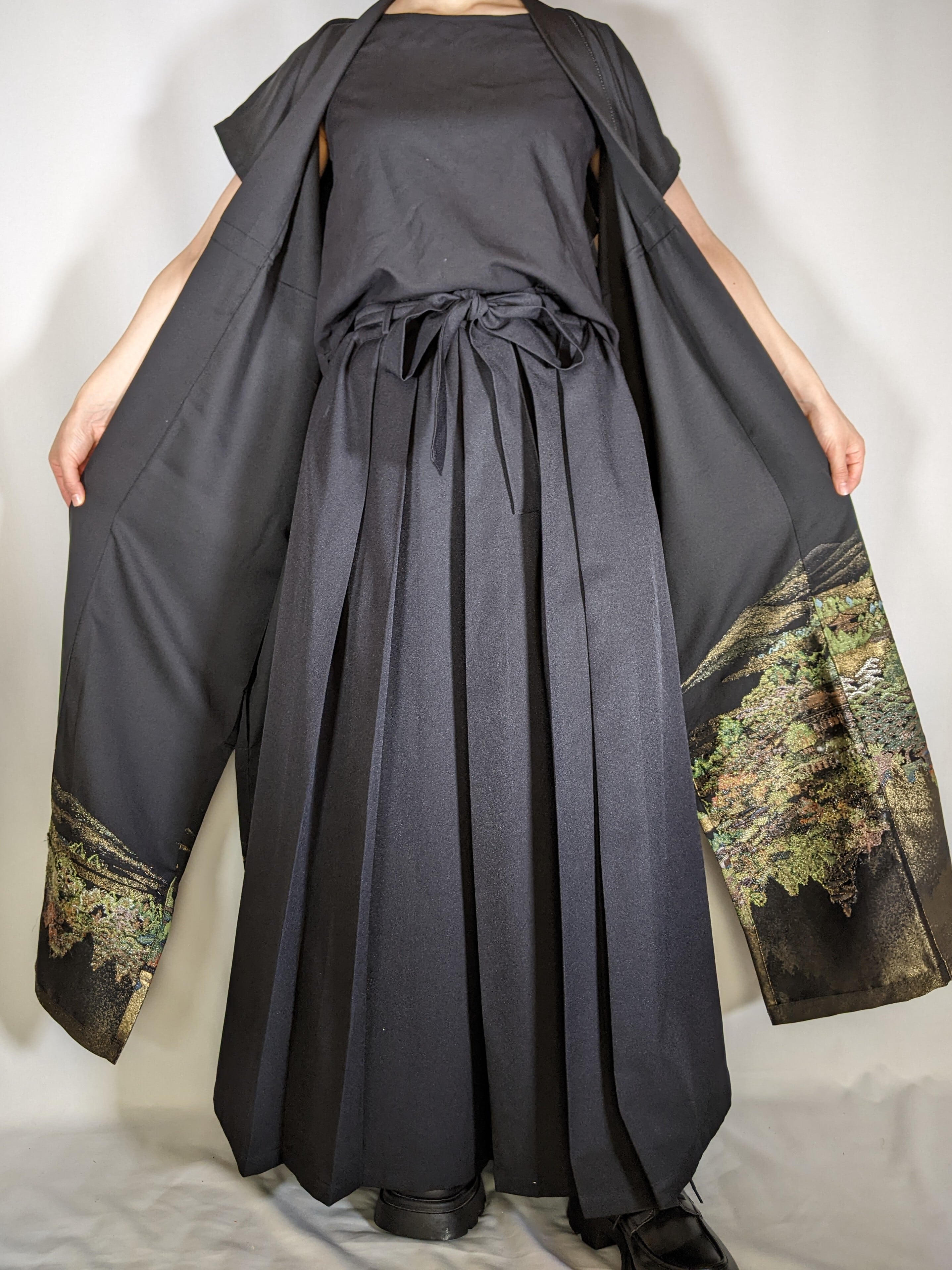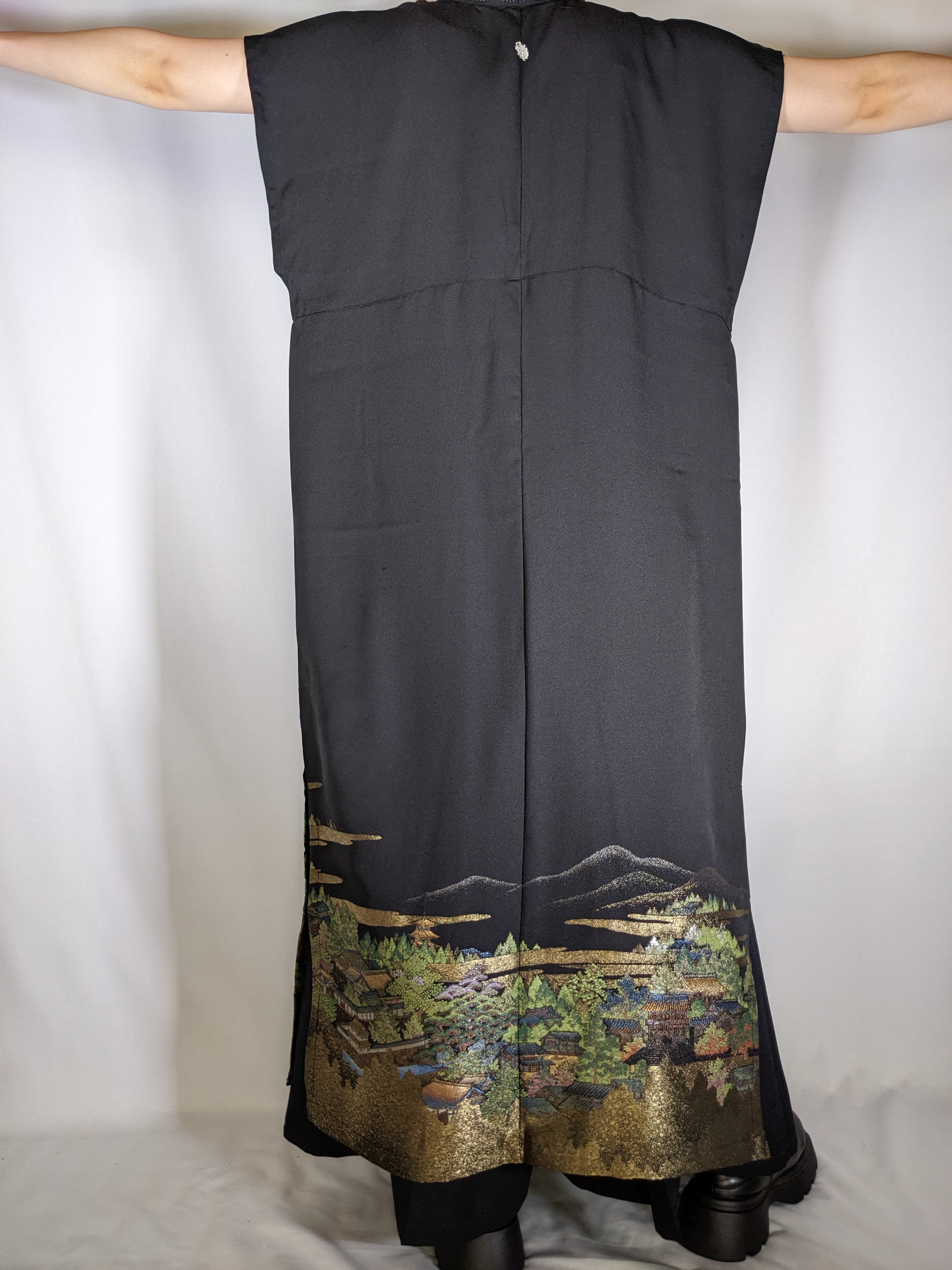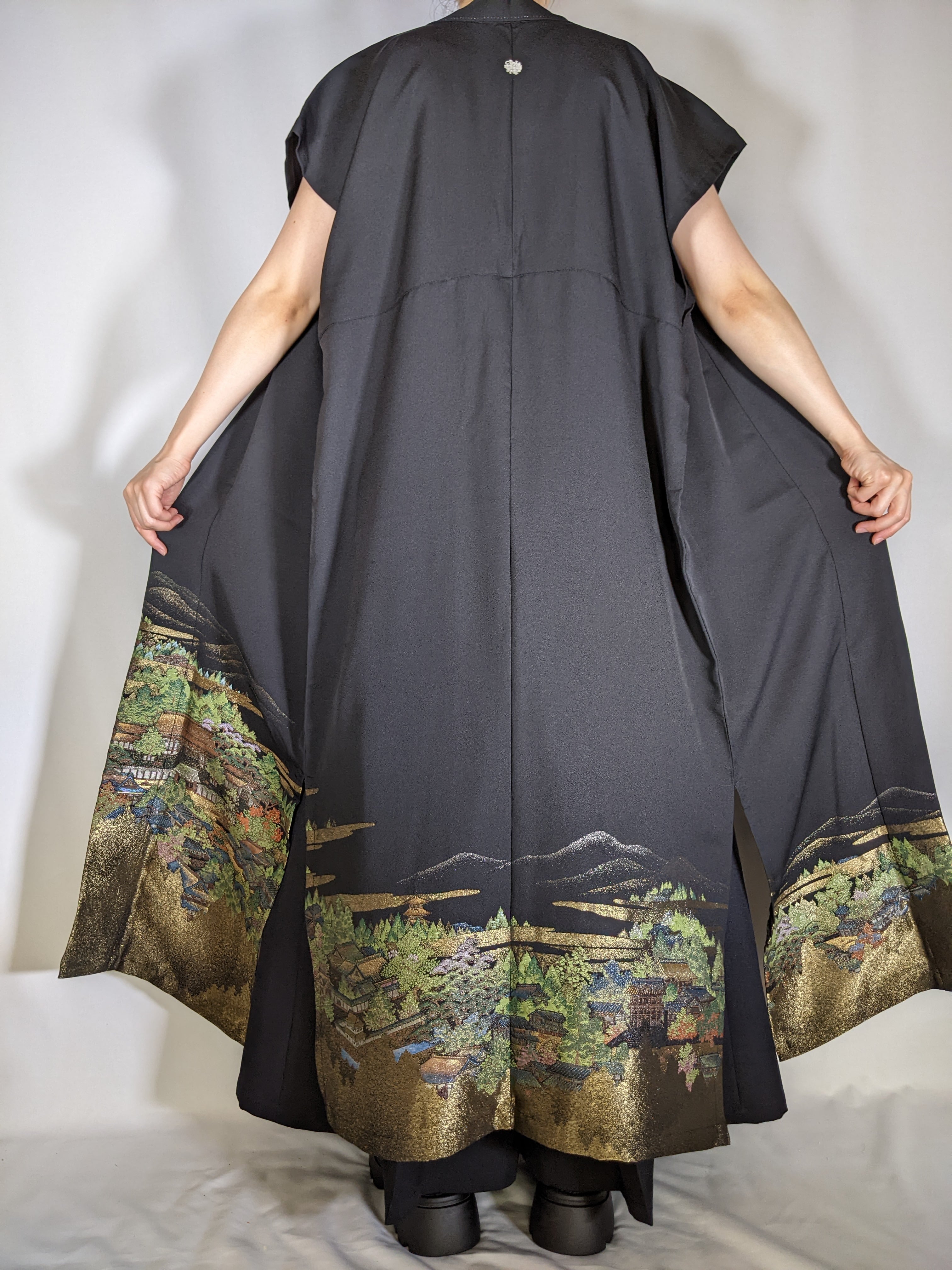 【14197】 陣羽織風 ロング羽織 + 巾着セット 着物リメイク 黒留袖 コート 金 風景模様|Kimono Remake Long Haori ? Jinbaori Style + Drawstring Bag Set tomesode remake