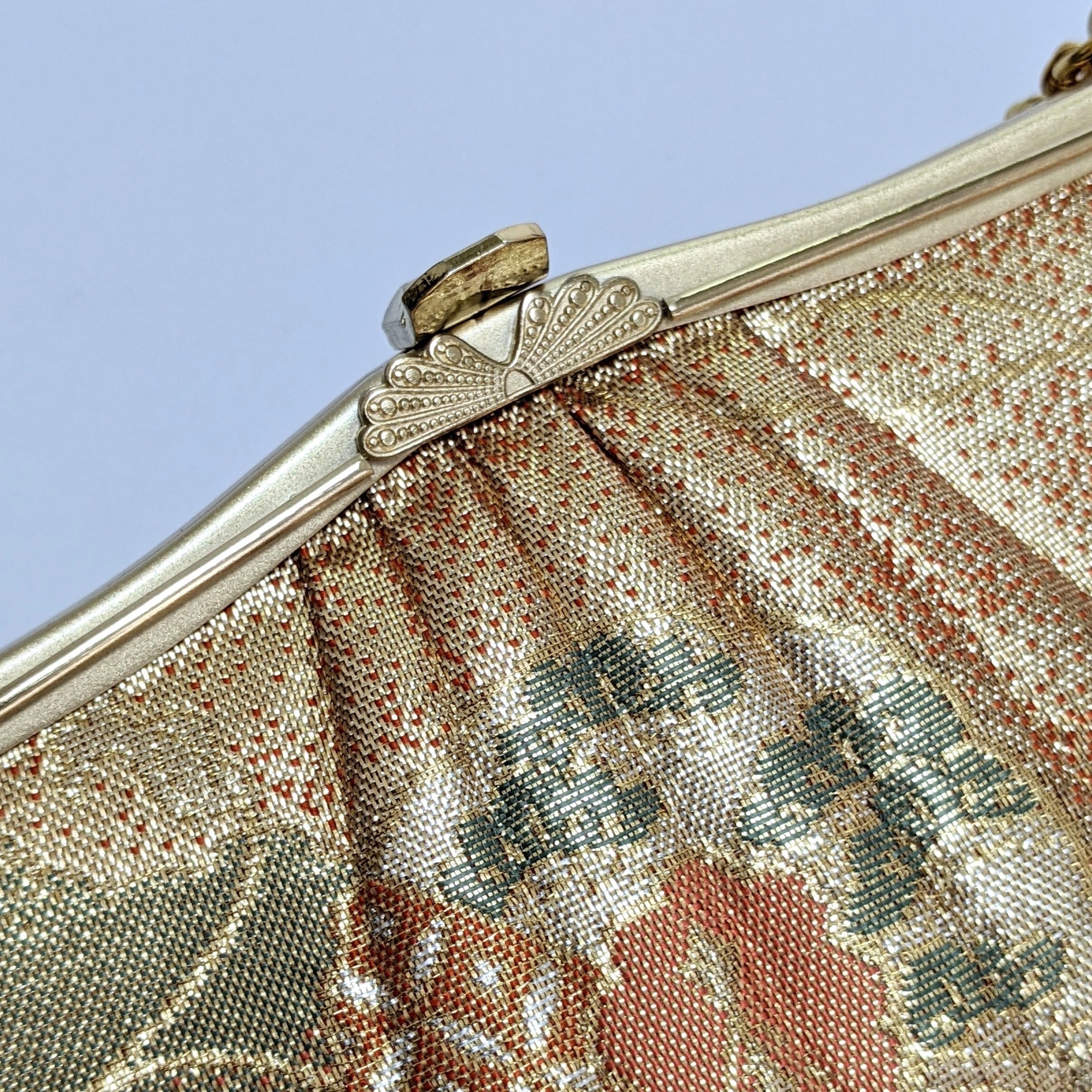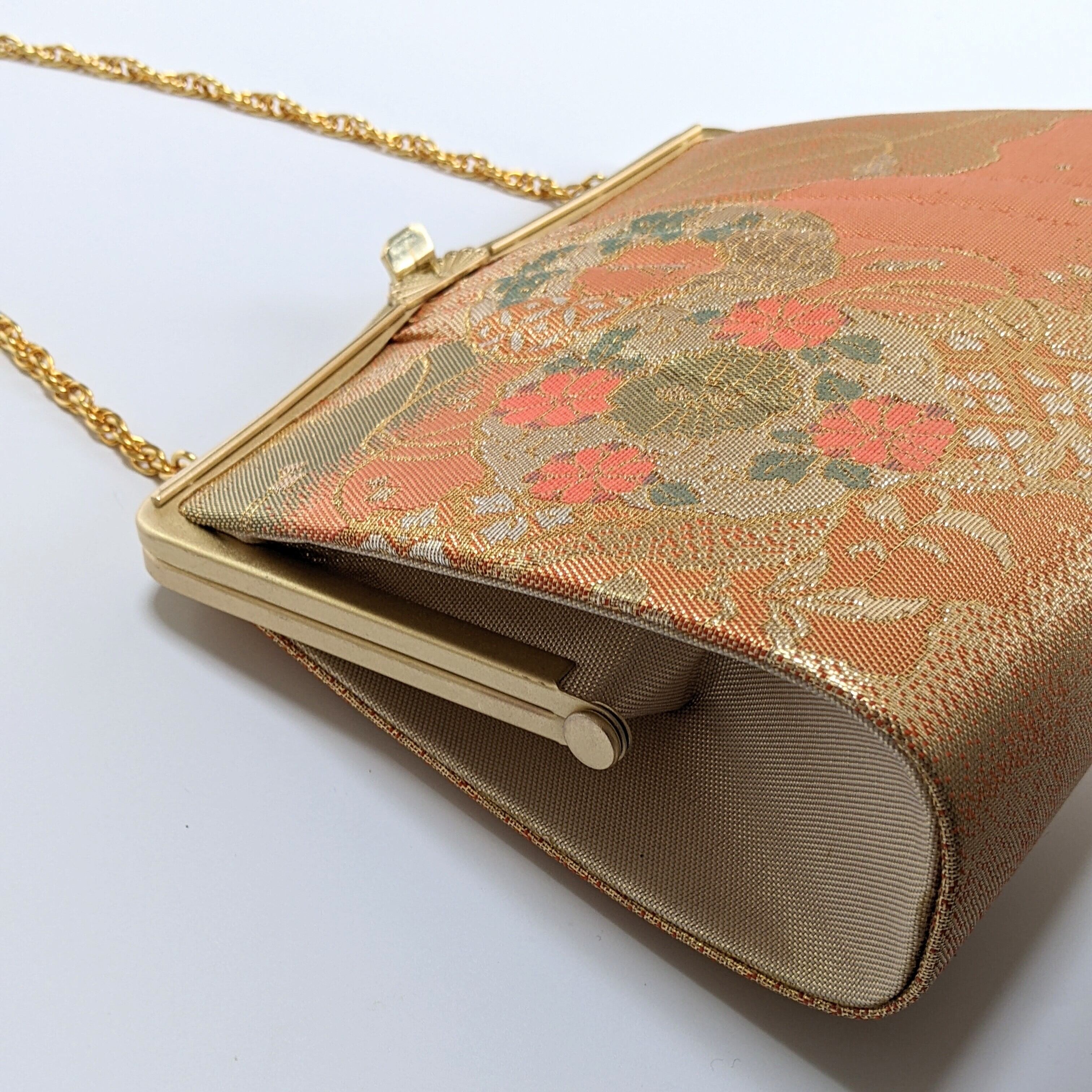 【14260】 ヴィンテージ 和装 ハンドバッグ チェーン 金 オレンジ 鏡裏文様 手鏡付き|Japanese Vintage Kimono Chain Bag