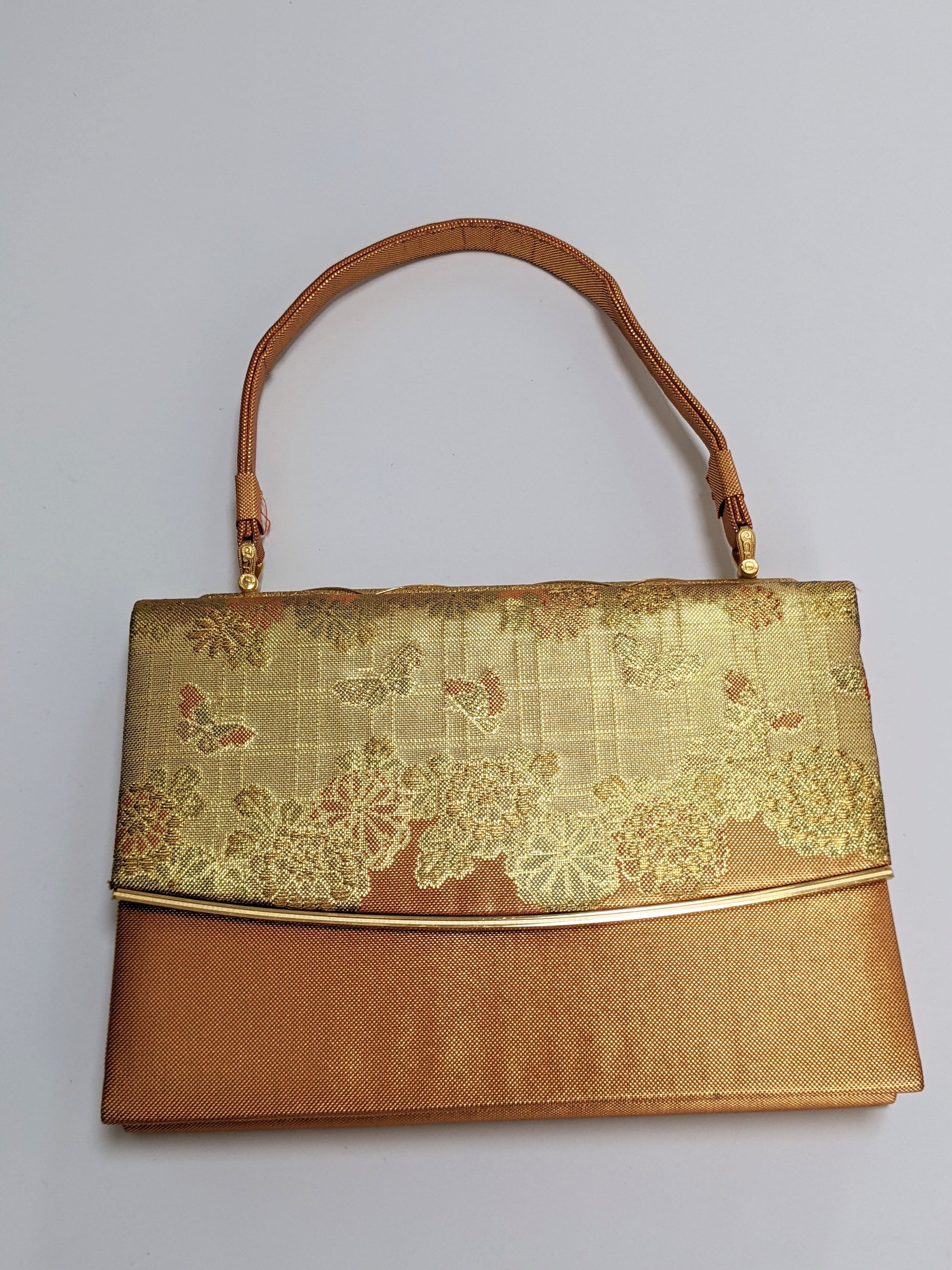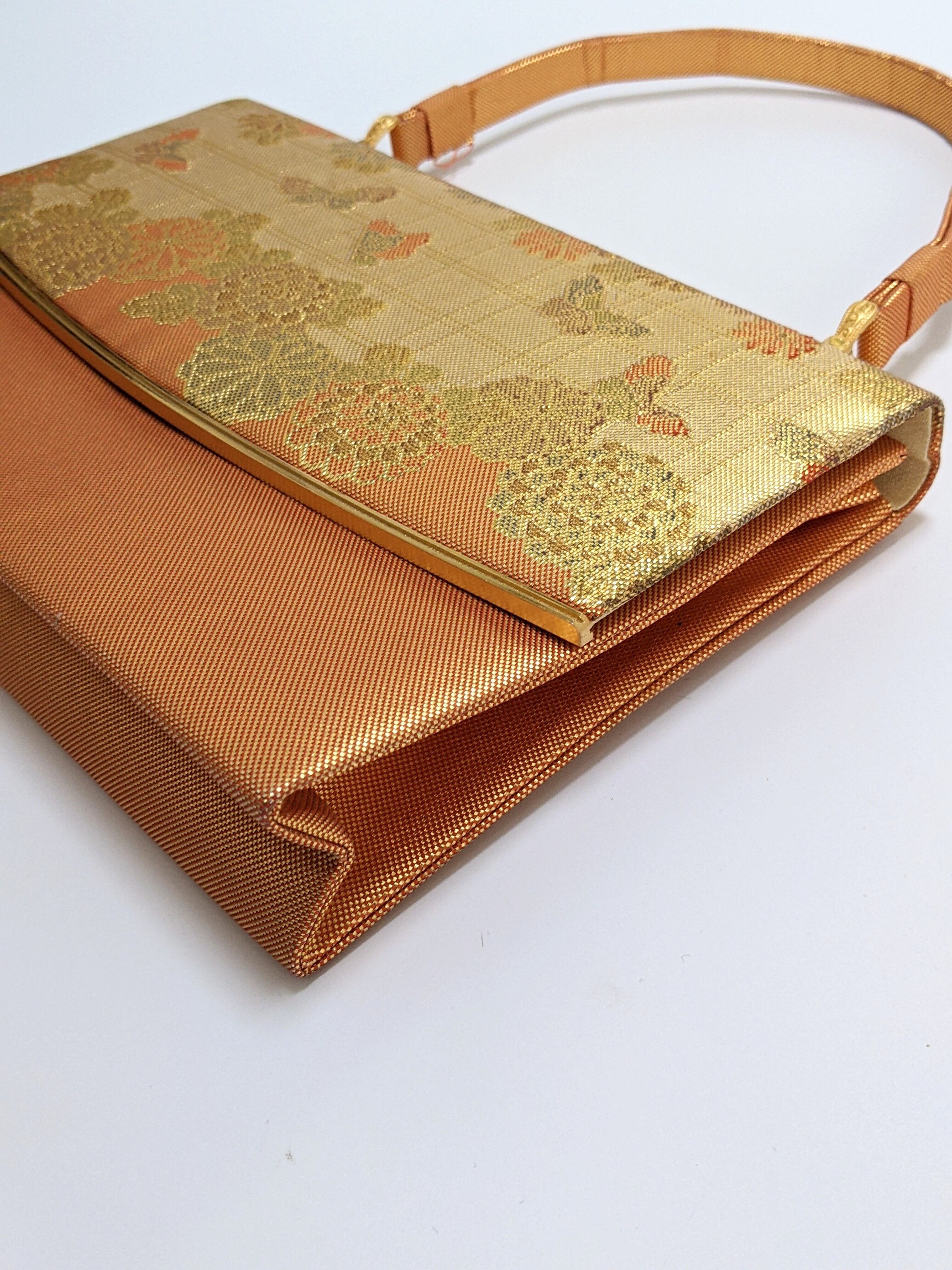 【14265】 ヴィンテージ 和装 ハンドバッグ チェーン 金 オレンジ 蝶々 菊模様|Japanese Vintage Kimono Chain Bag