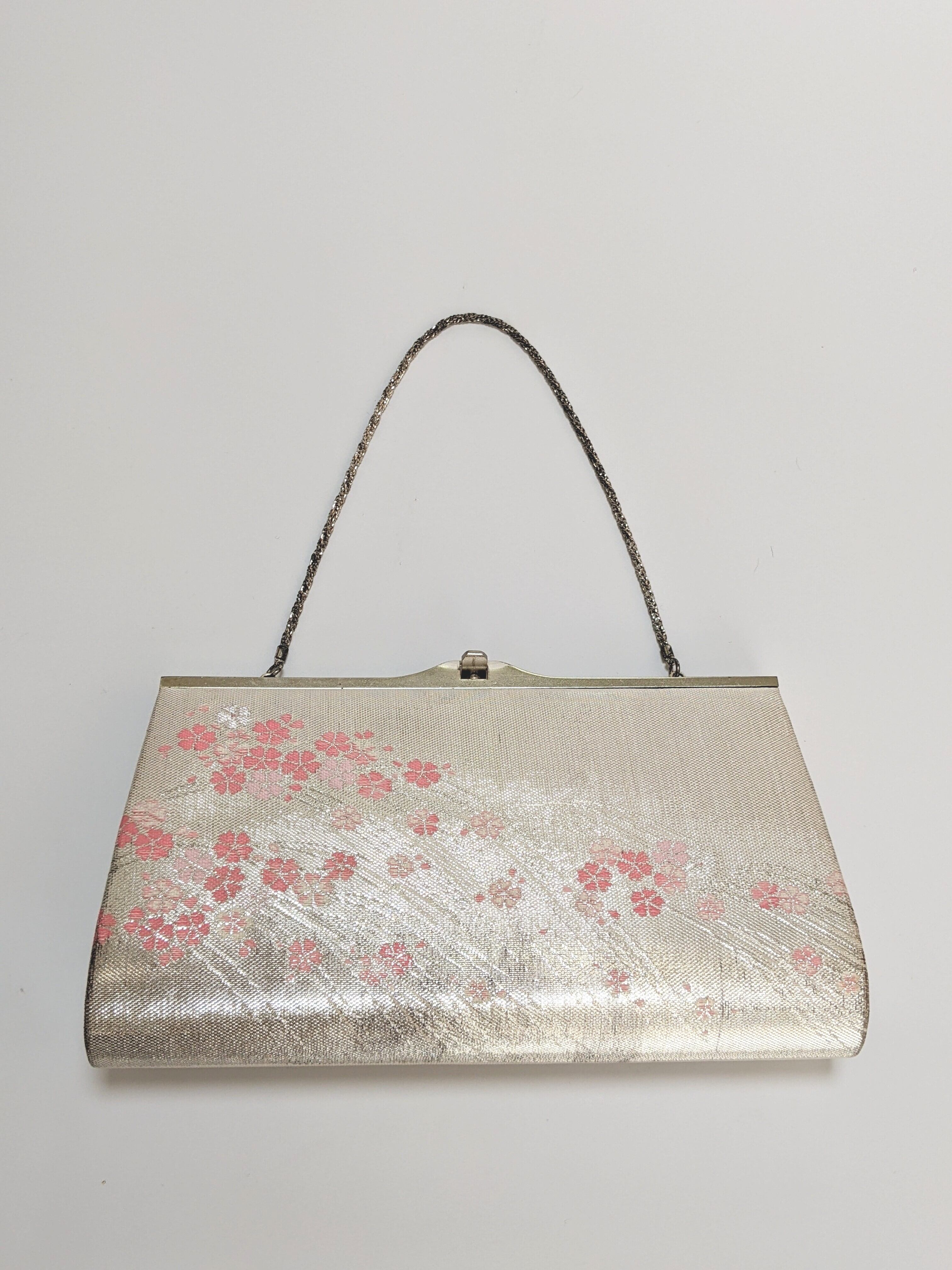 【14266】 ヴィンテージ 和装 ハンドバッグ チェーン シルバー ピンク 桜模様|Japanese Vintage Kimono Chain Bag