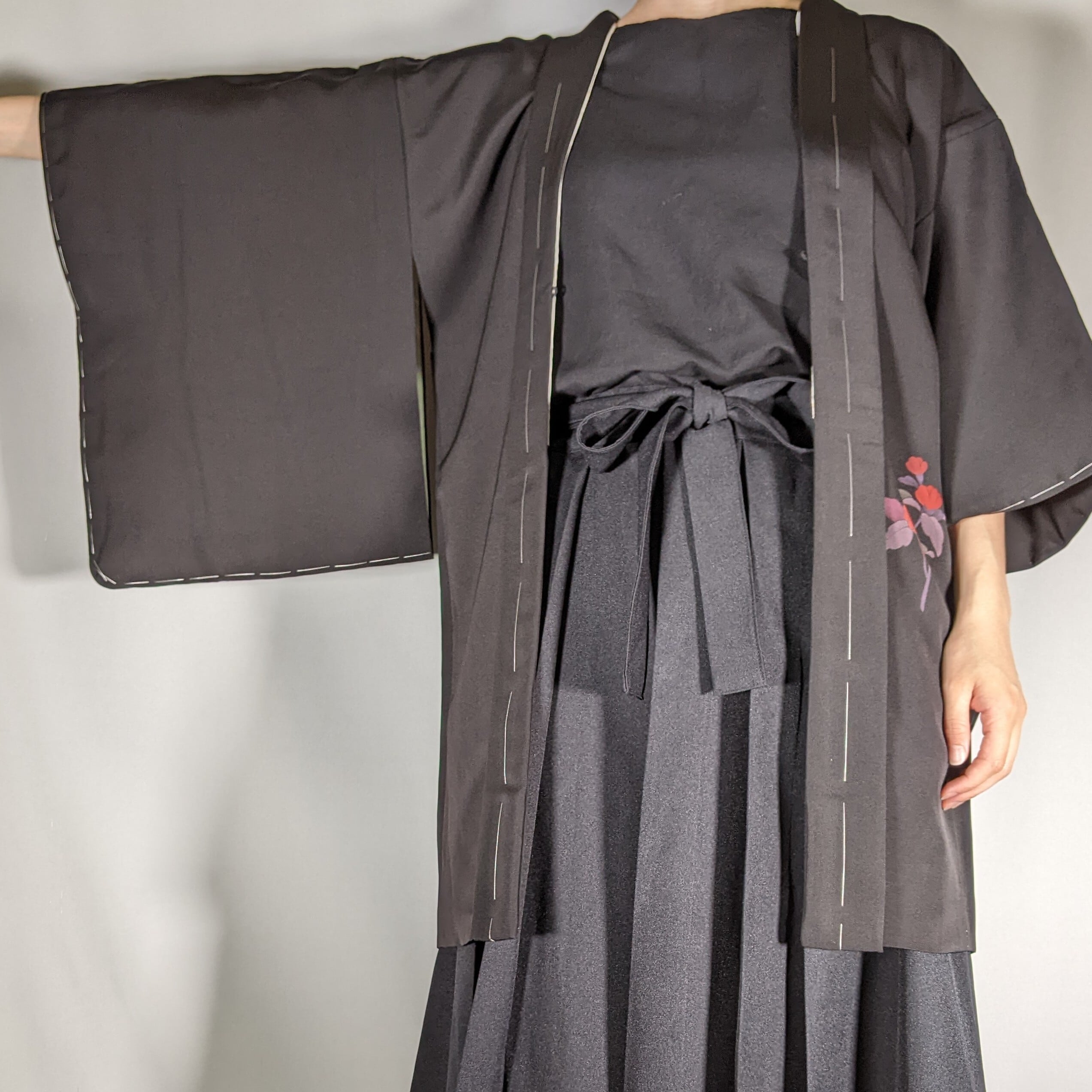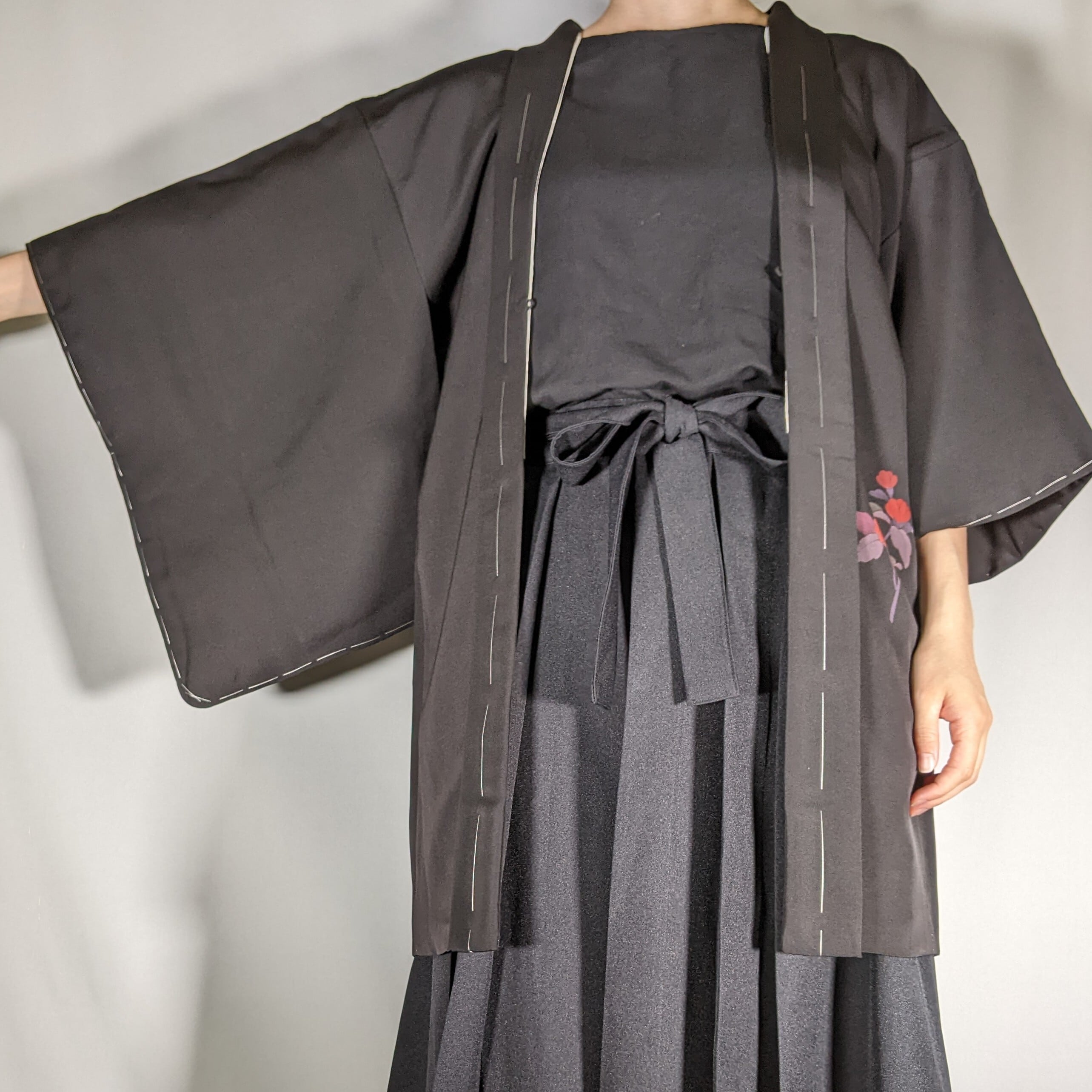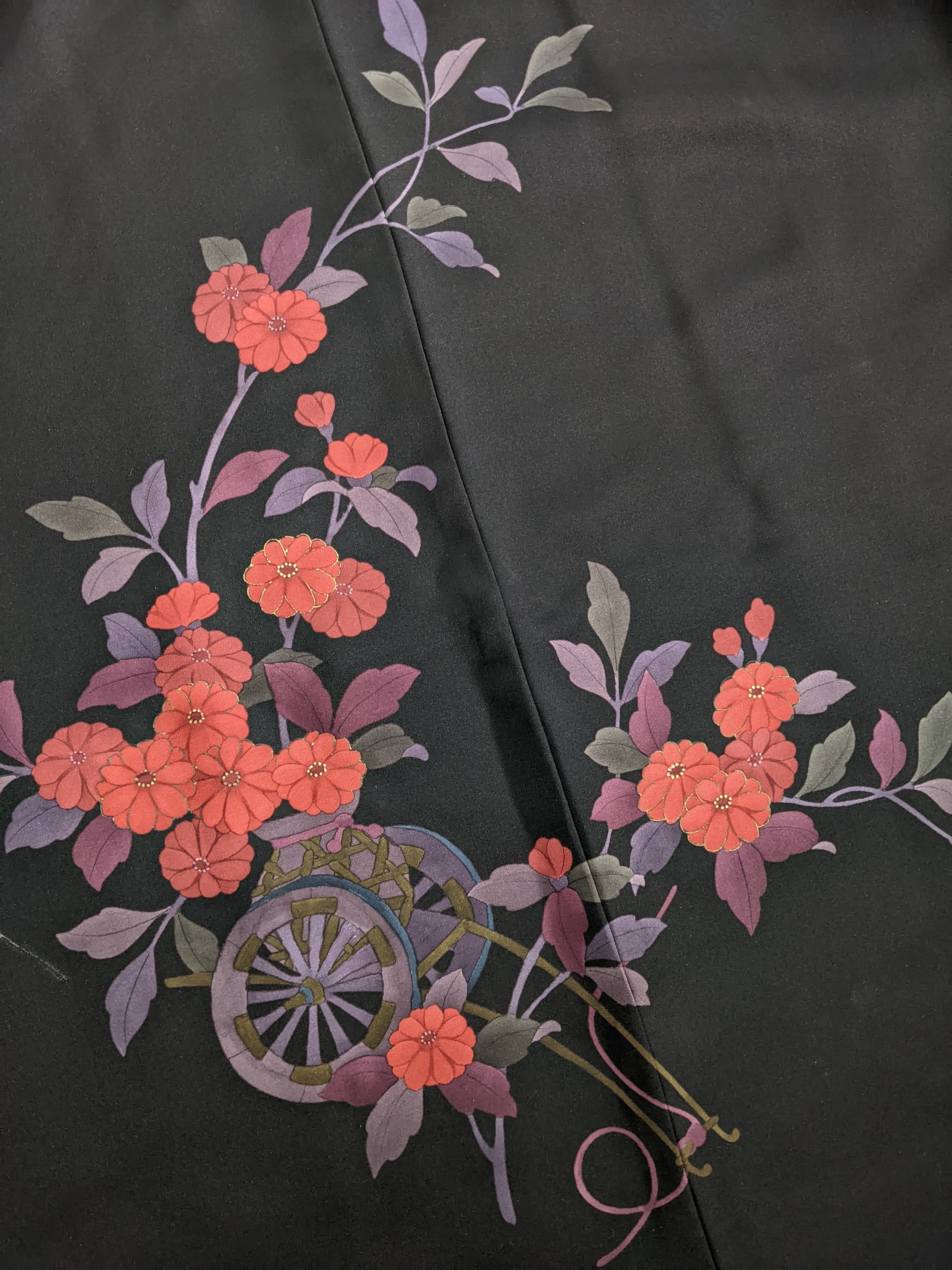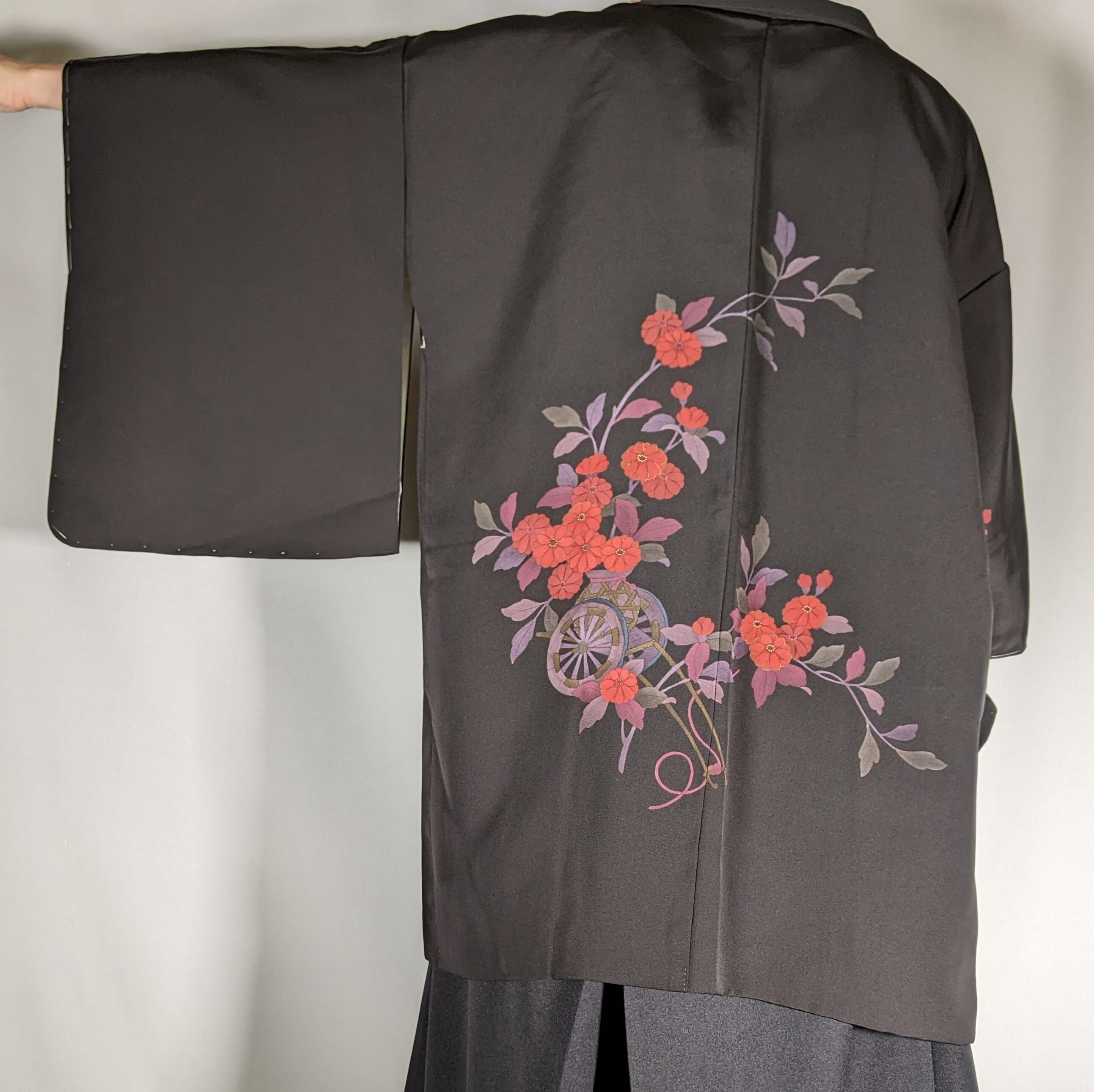 【14270】 ヴィンテージ 黒羽織 和洋折衷コーデ 花車模様/ Japanese vintage kimono black haori jacket