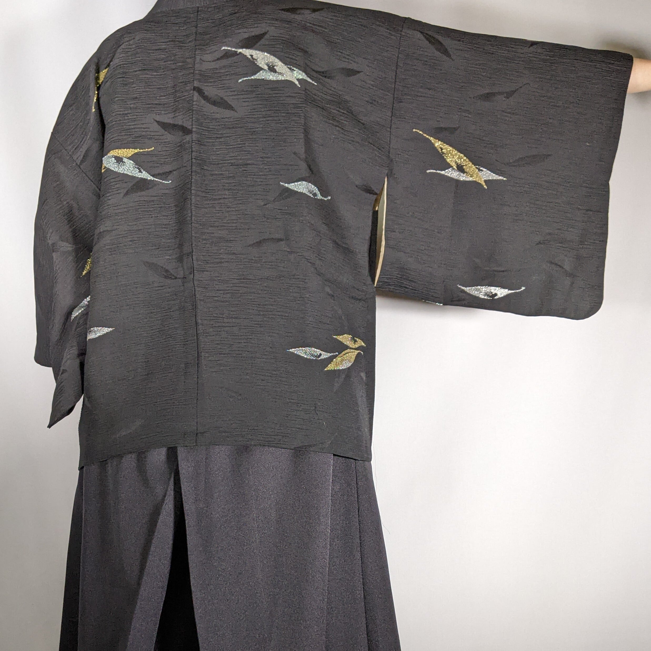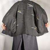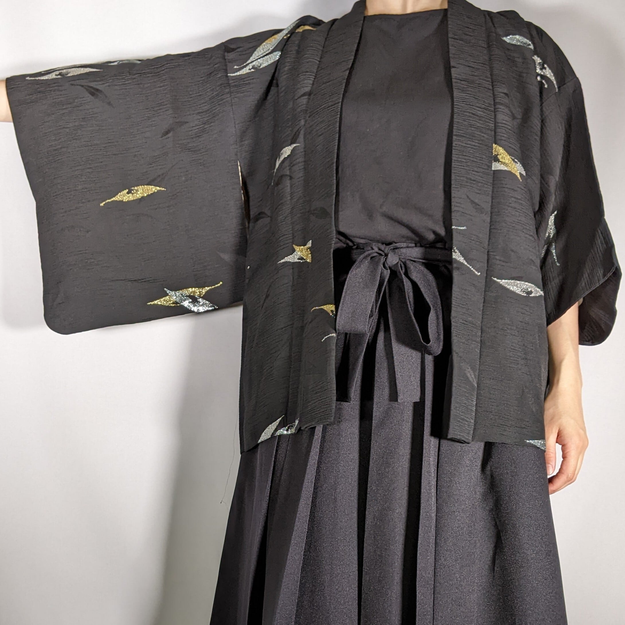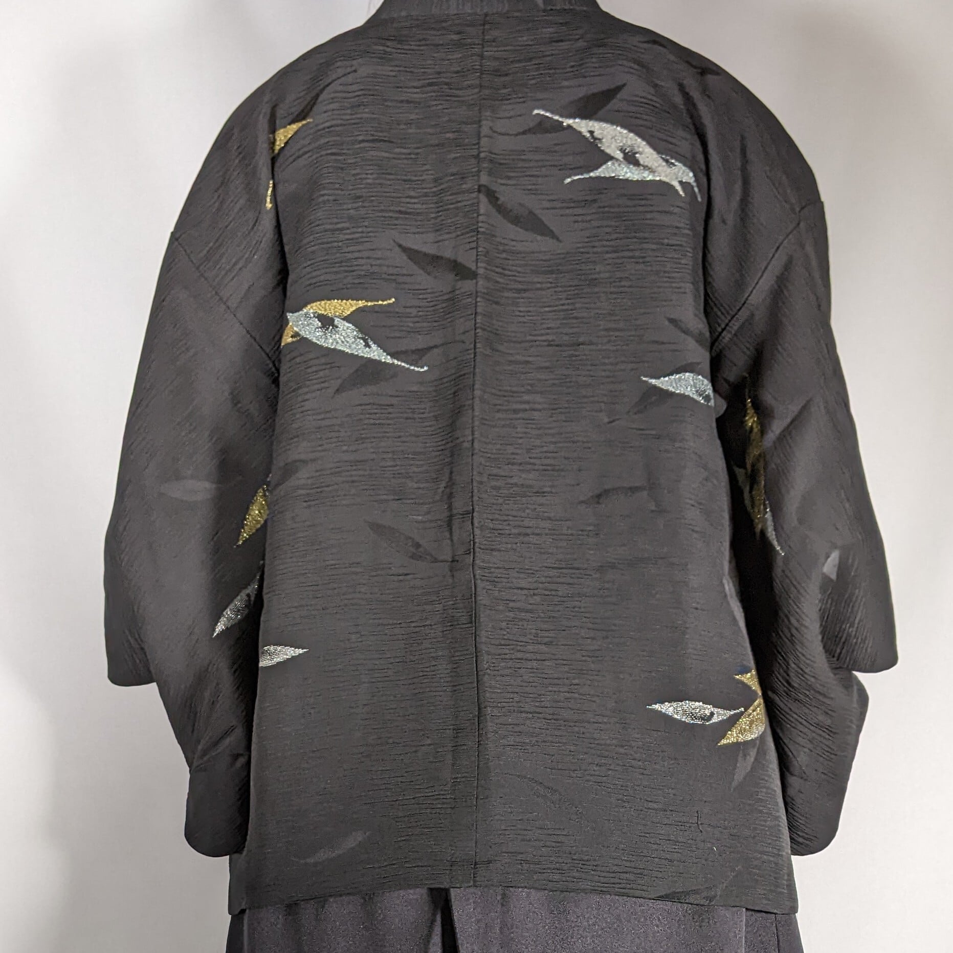 【14278】 ヴィンテージ 黒羽織 織り出し模様 葉 金 銀 和洋折衷コーデ / Japanese vintage kimono black haori jacket
