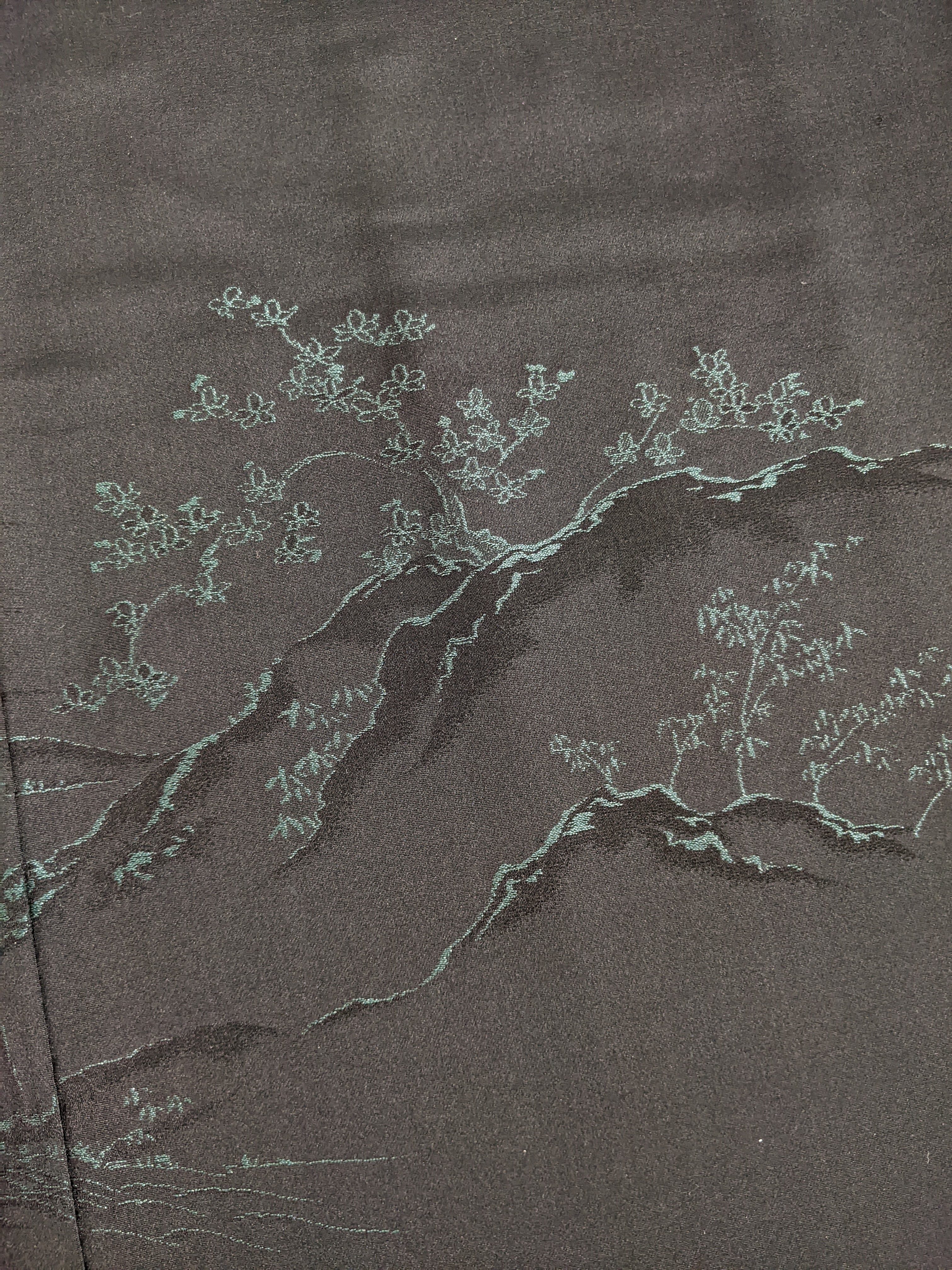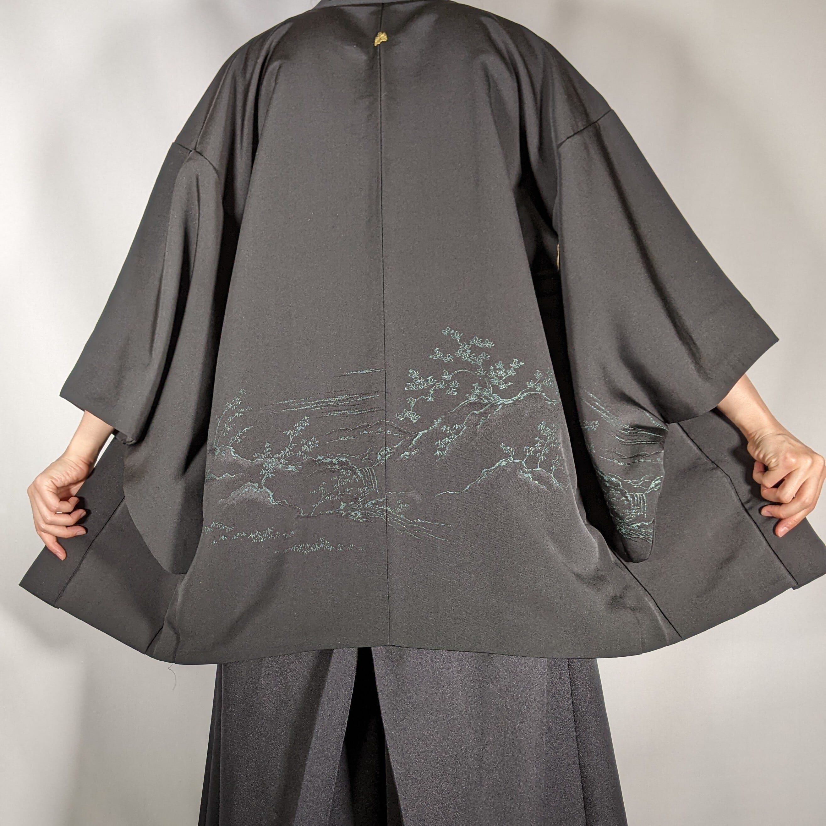 【14299】 ヴィンテージ 黒羽織 緑 風景模様 和洋折衷コーデ / Japanese vintage kimono black haori jacket