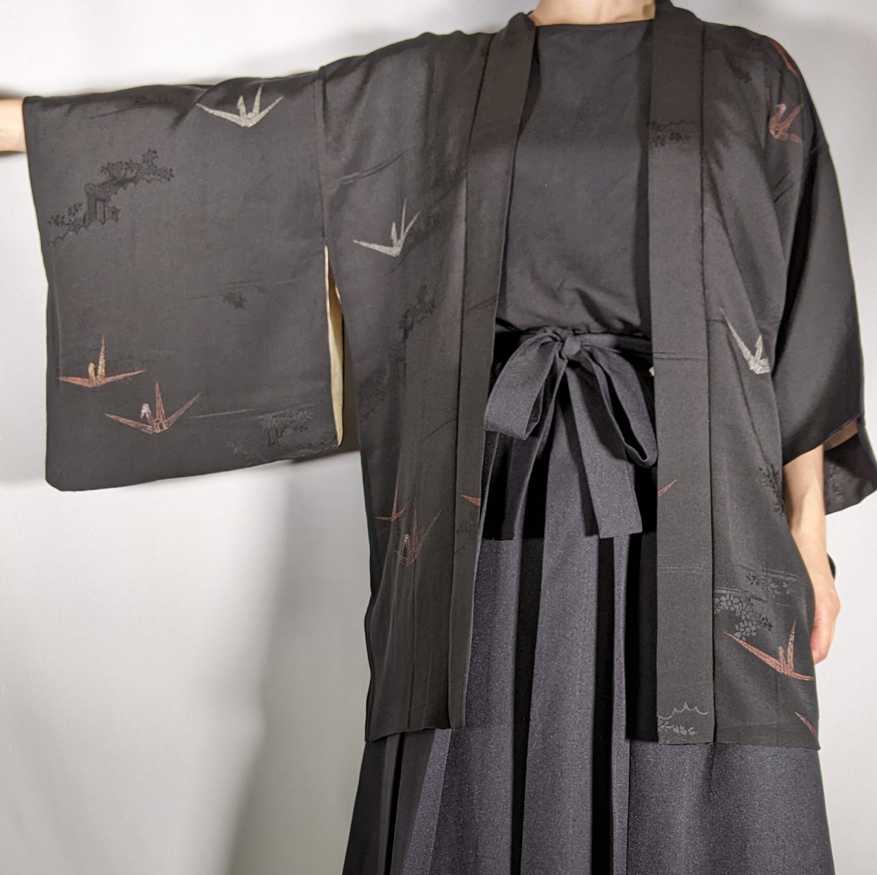 【14301】 ヴィンテージ 黒羽織 折り鶴模様 和洋折衷コーデ / Japanese vintage kimono black haori jacket