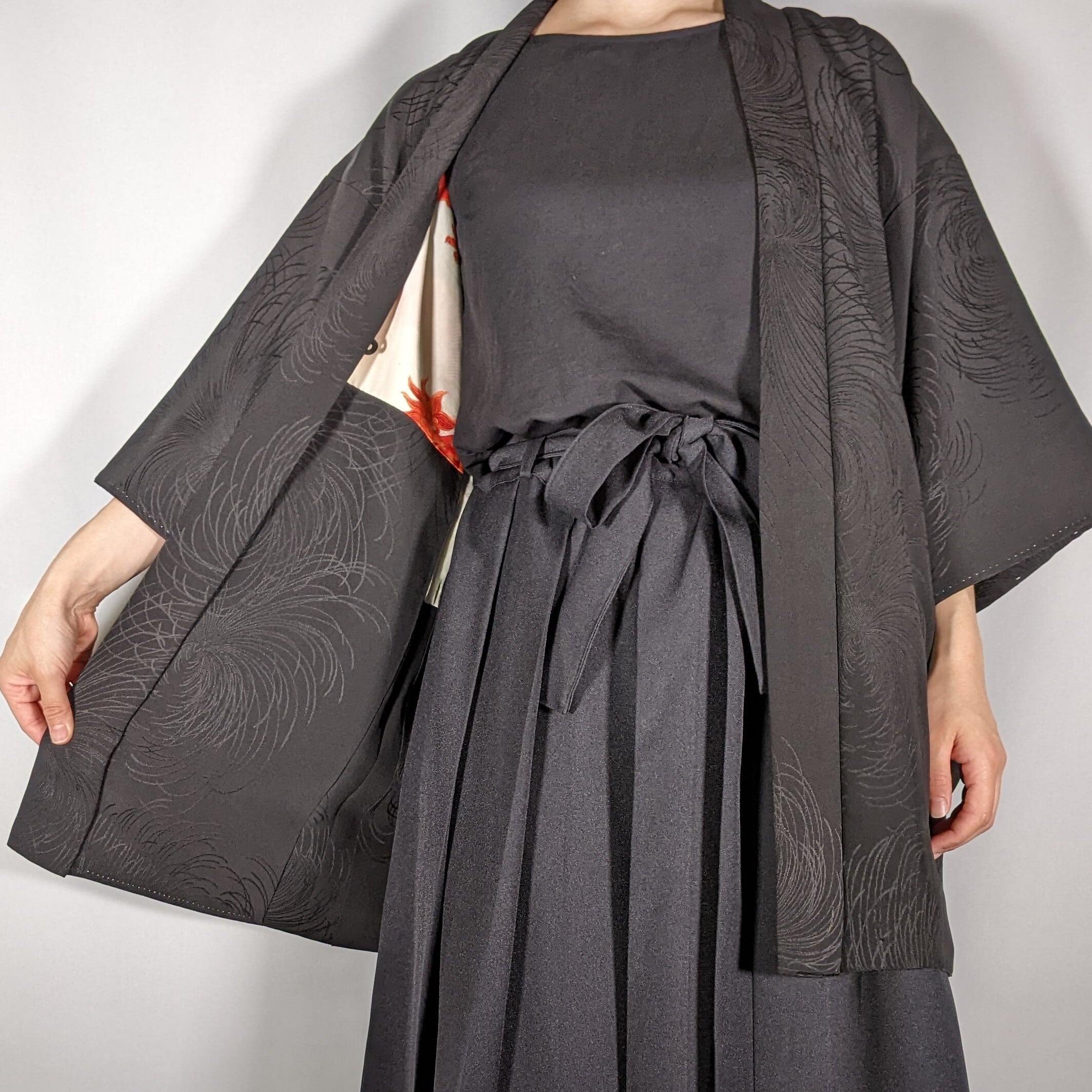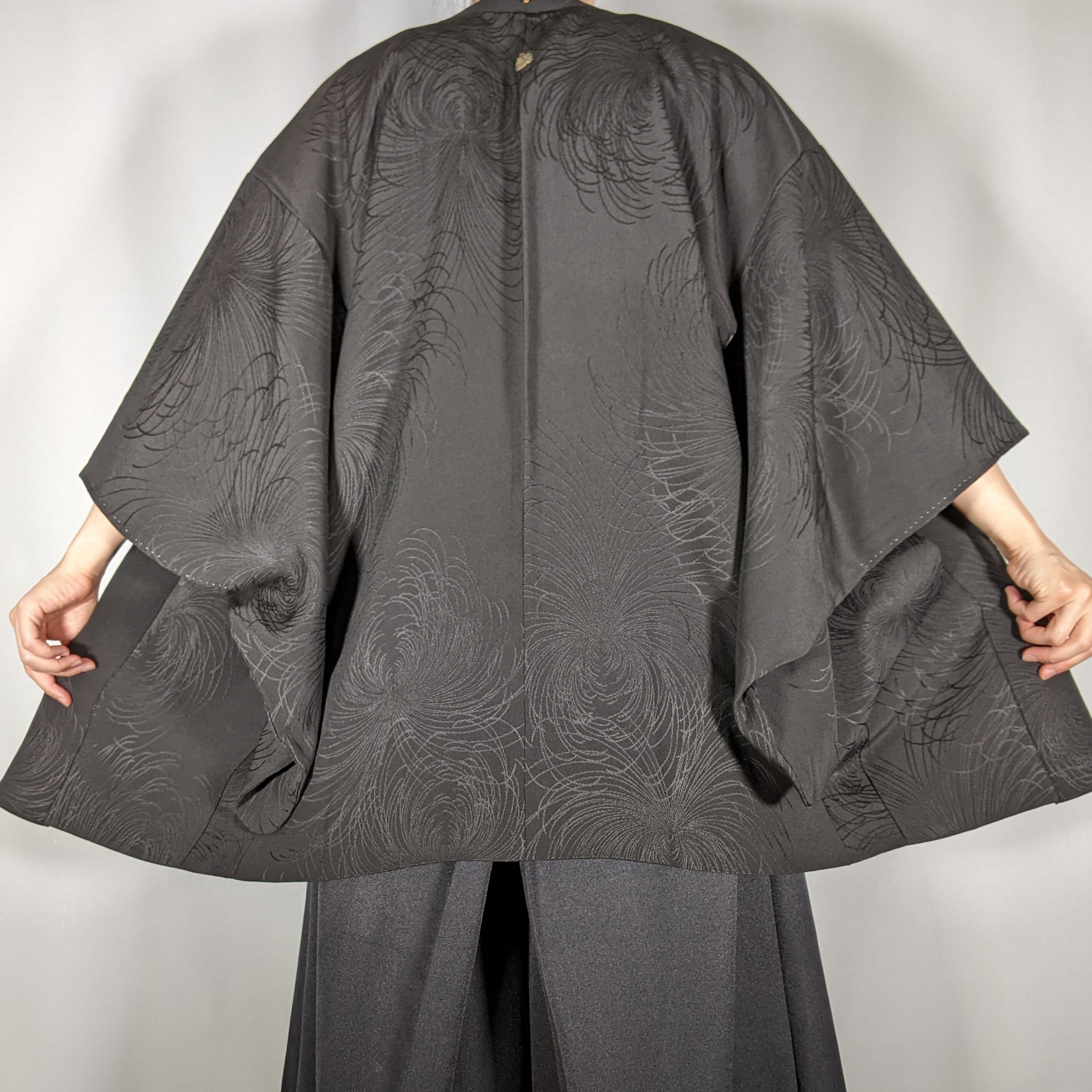 【14306】 ヴィンテージ 黒羽織 地模様 糸菊模様 和洋折衷コーデ / Japanese vintage kimono black haori jacket