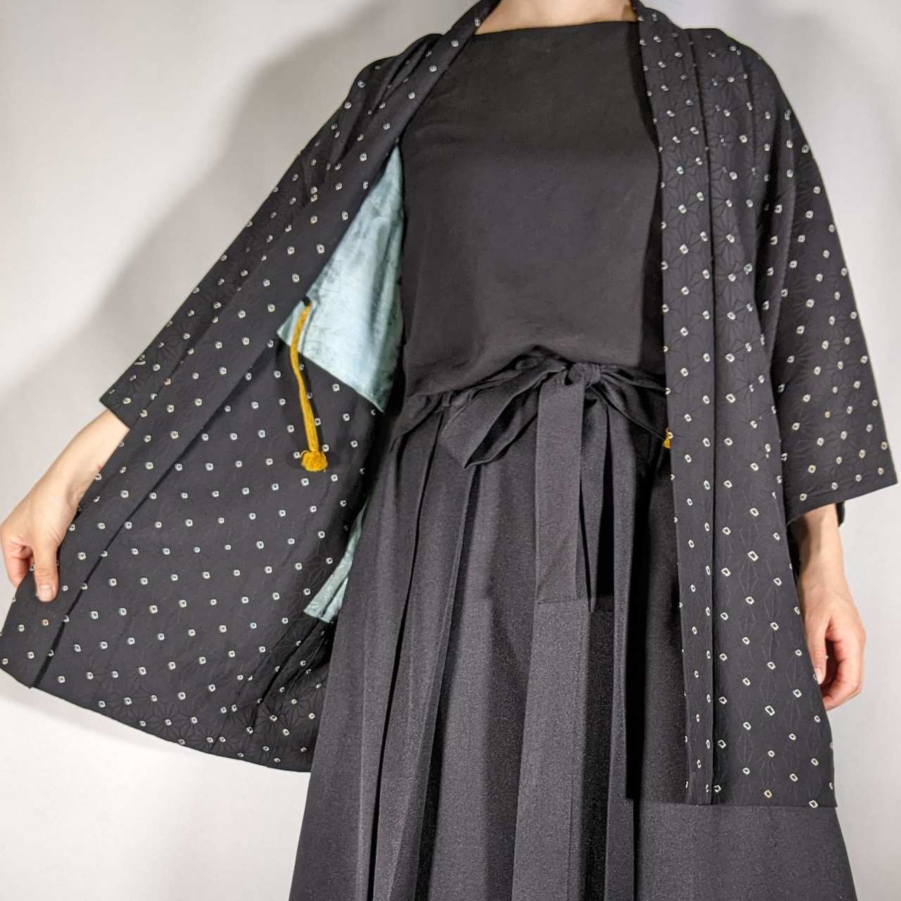 【14319】 ヴィンテージ 黒羽織 水色 和洋折衷コーデ / Japanese vintage kimono black haori jacket
