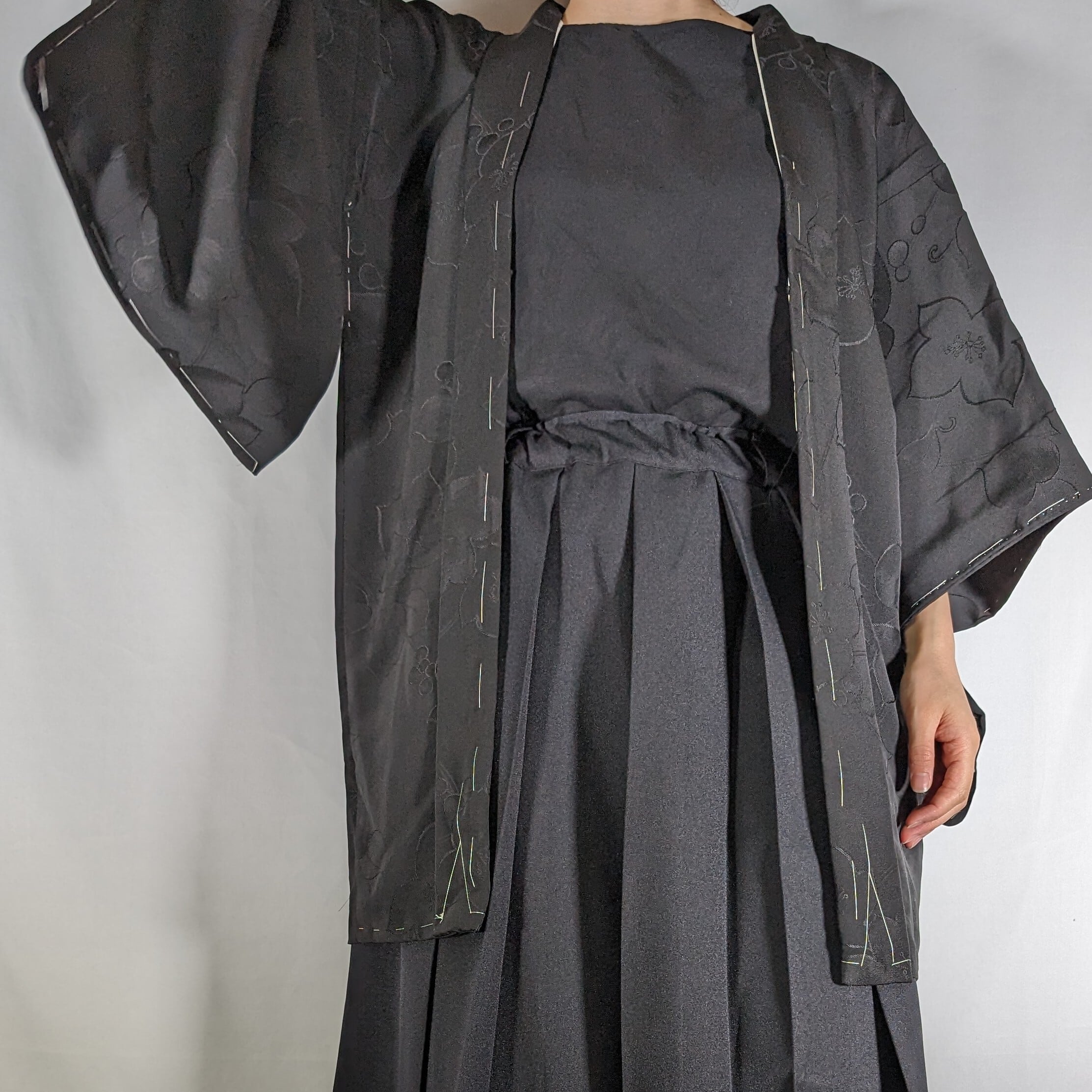 【14395】 ヴィンテージ 黒羽織 地模様 和洋折衷コーデ / Japanese vintage kimono black haori jacket