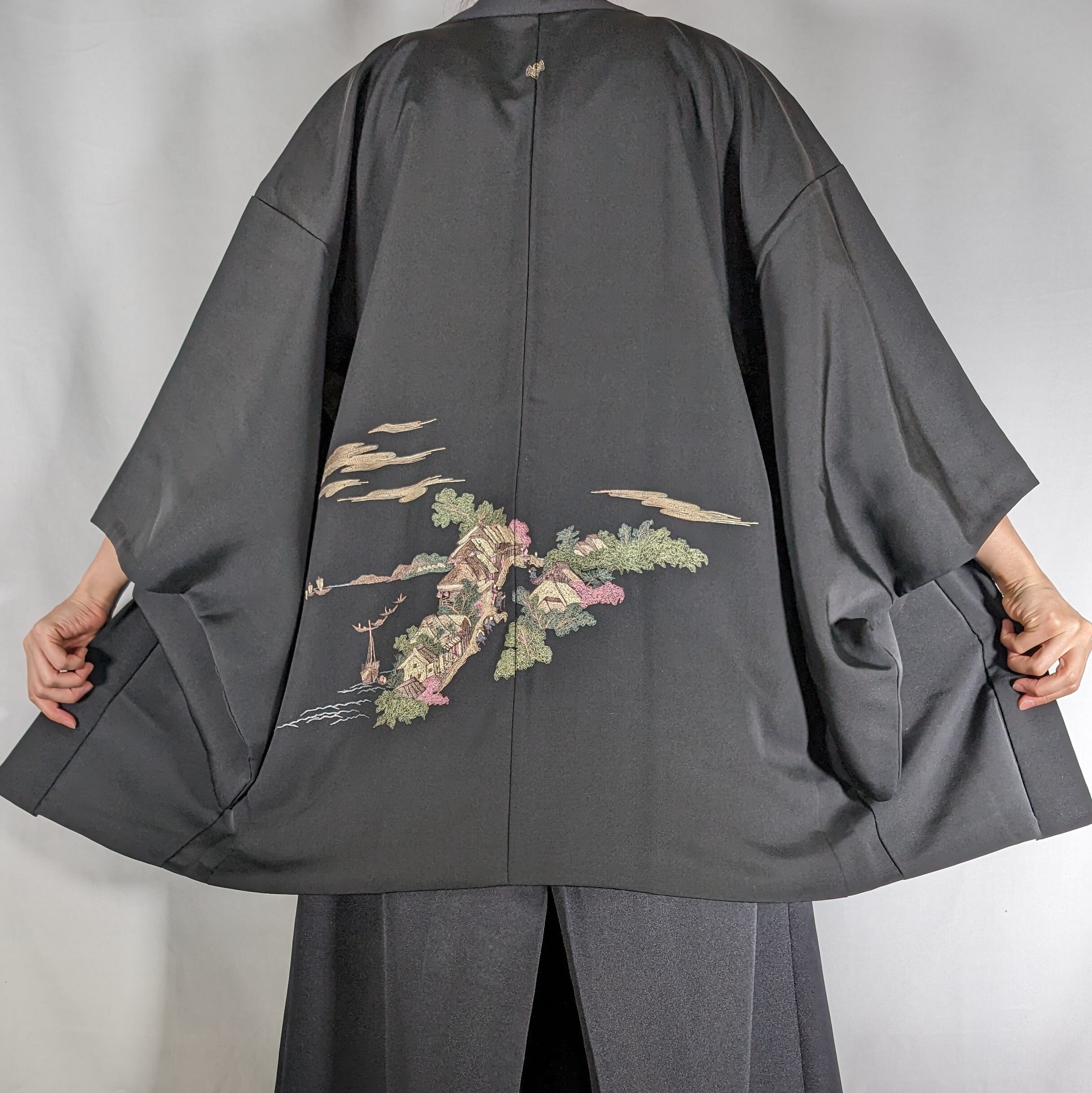 【14401】 ヴィンテージ 黒羽織 刺繍 風景模様 和洋折衷コーデ / Japanese vintage kimono black haori jacket