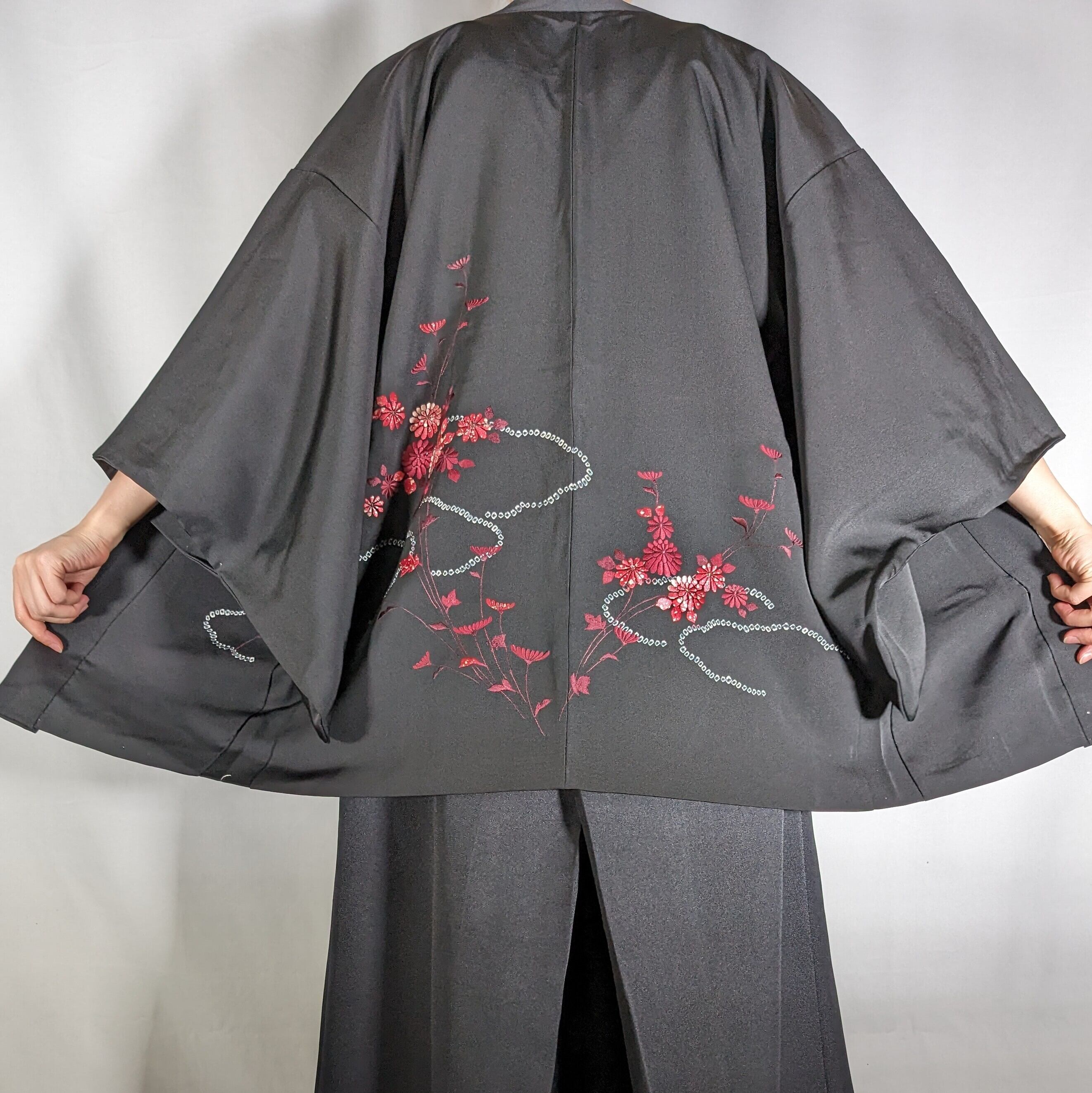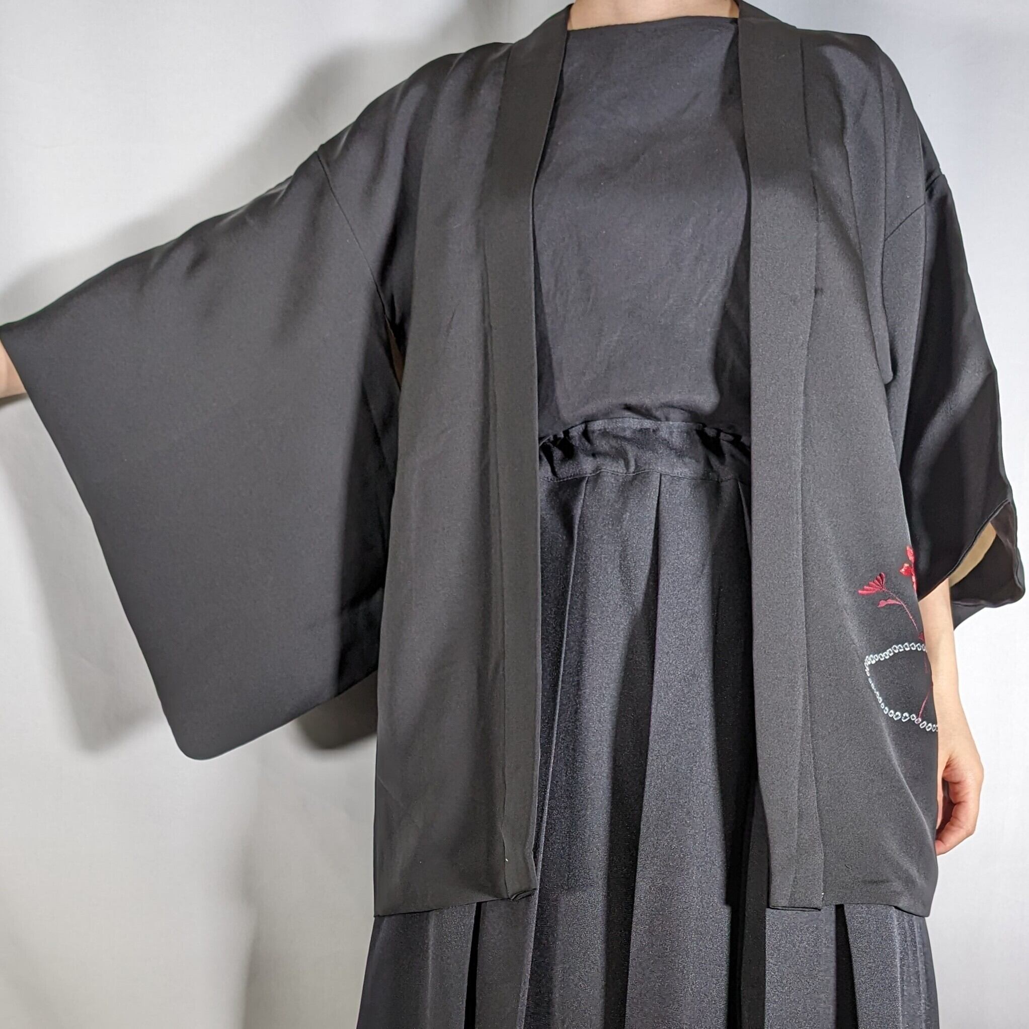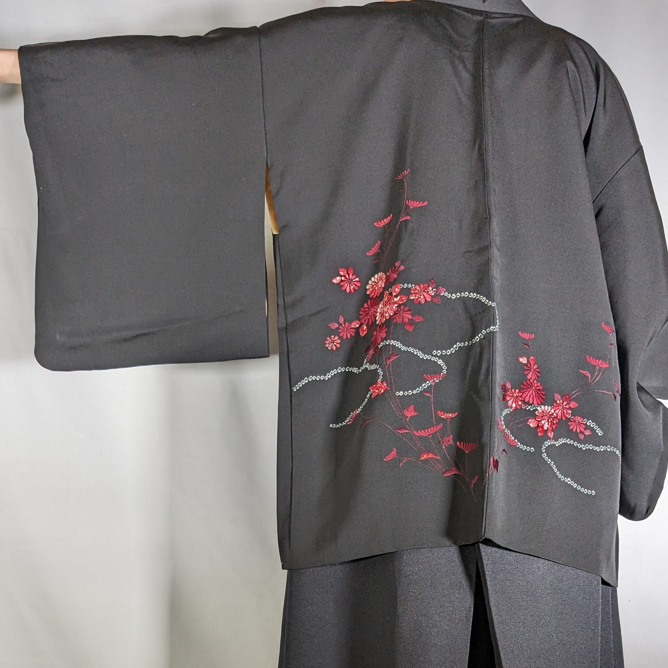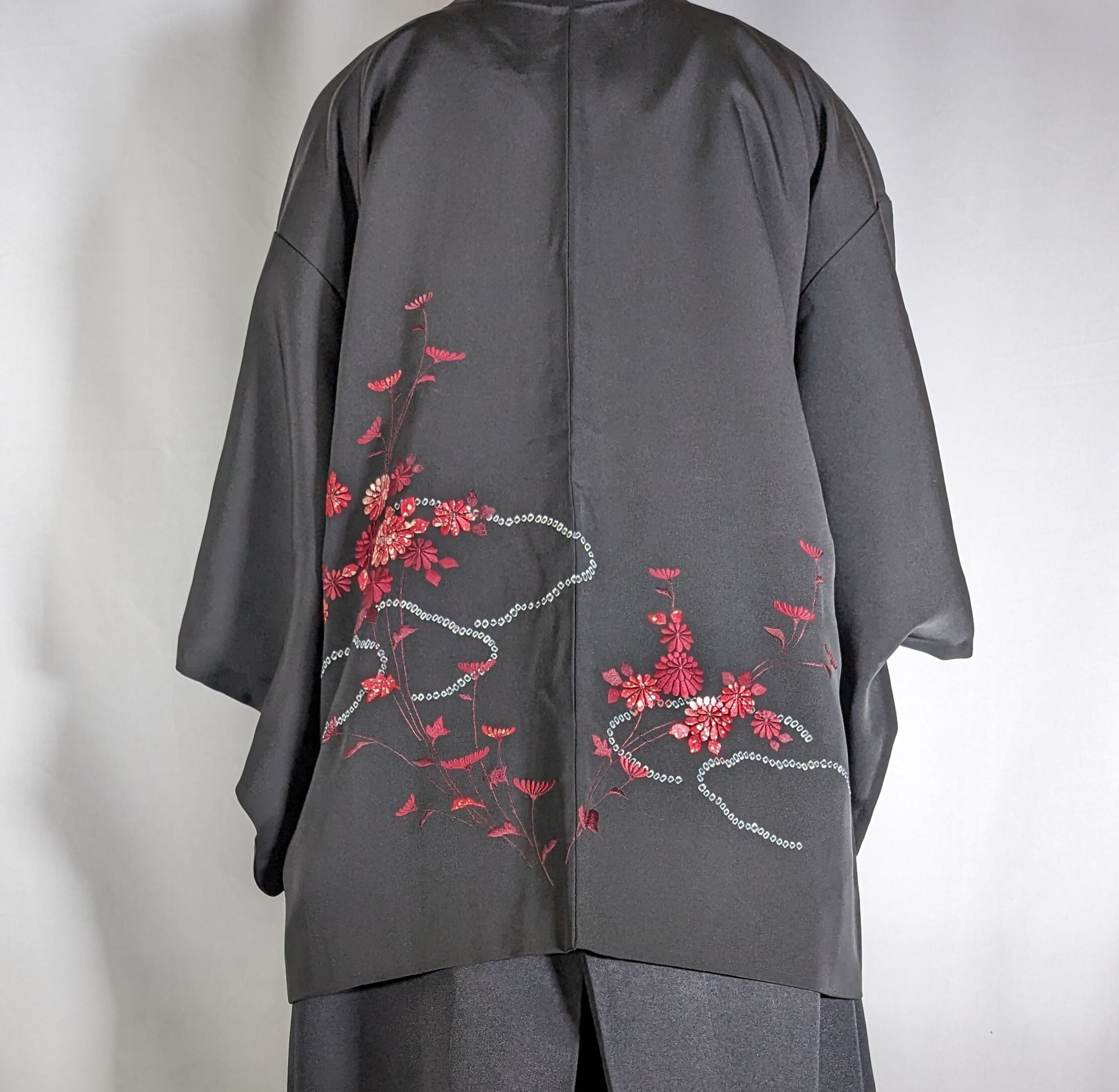 【14430】 ヴィンテージ 黒羽織 刺繍 菊 ピンク 和洋折衷コーデ / Japanese vintage kimono black haori jacket