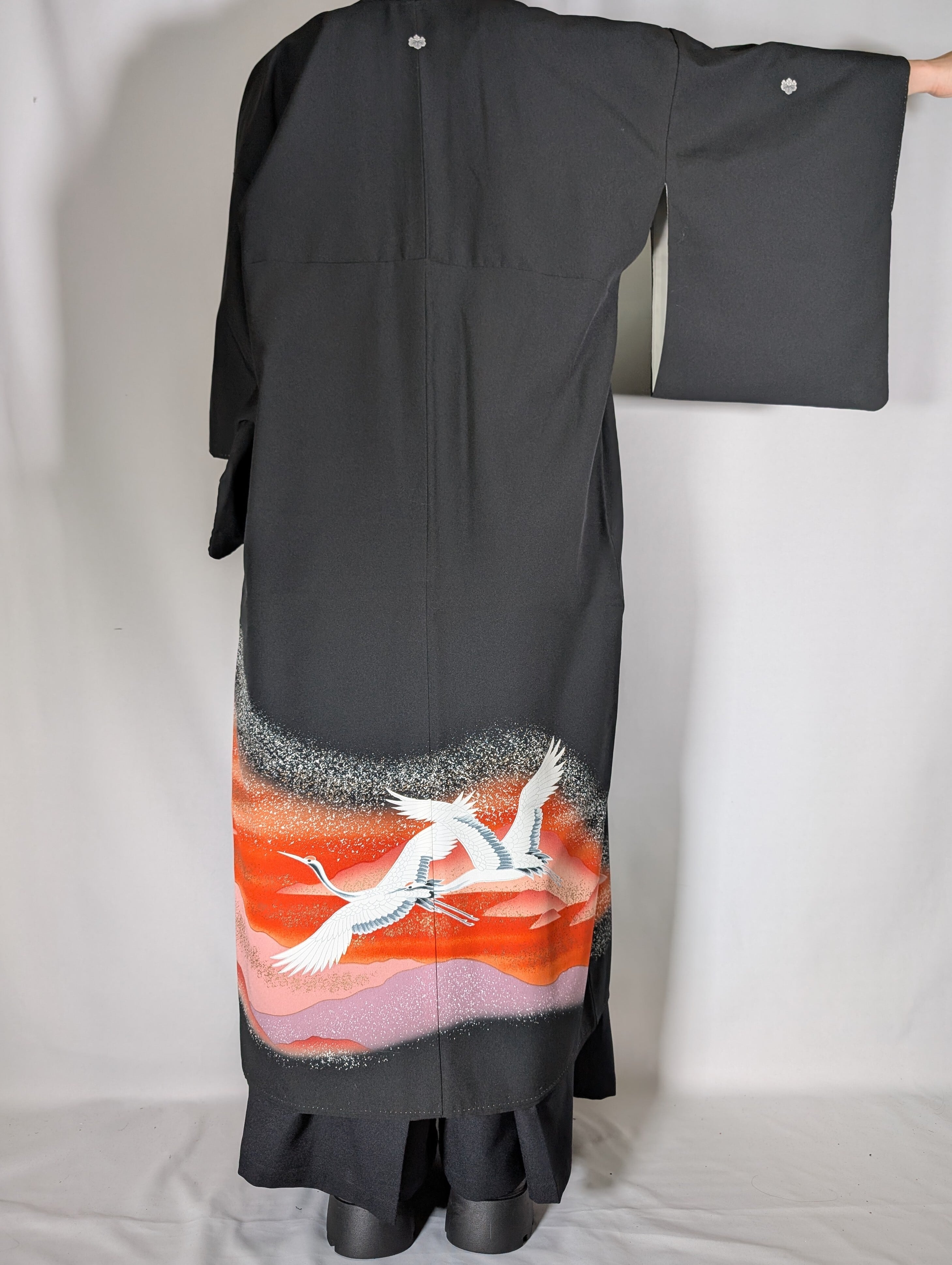 【14468】 着物リメイク 黒留袖 赤 鶴模様 ロングコート kimono tomesode remake long coat black