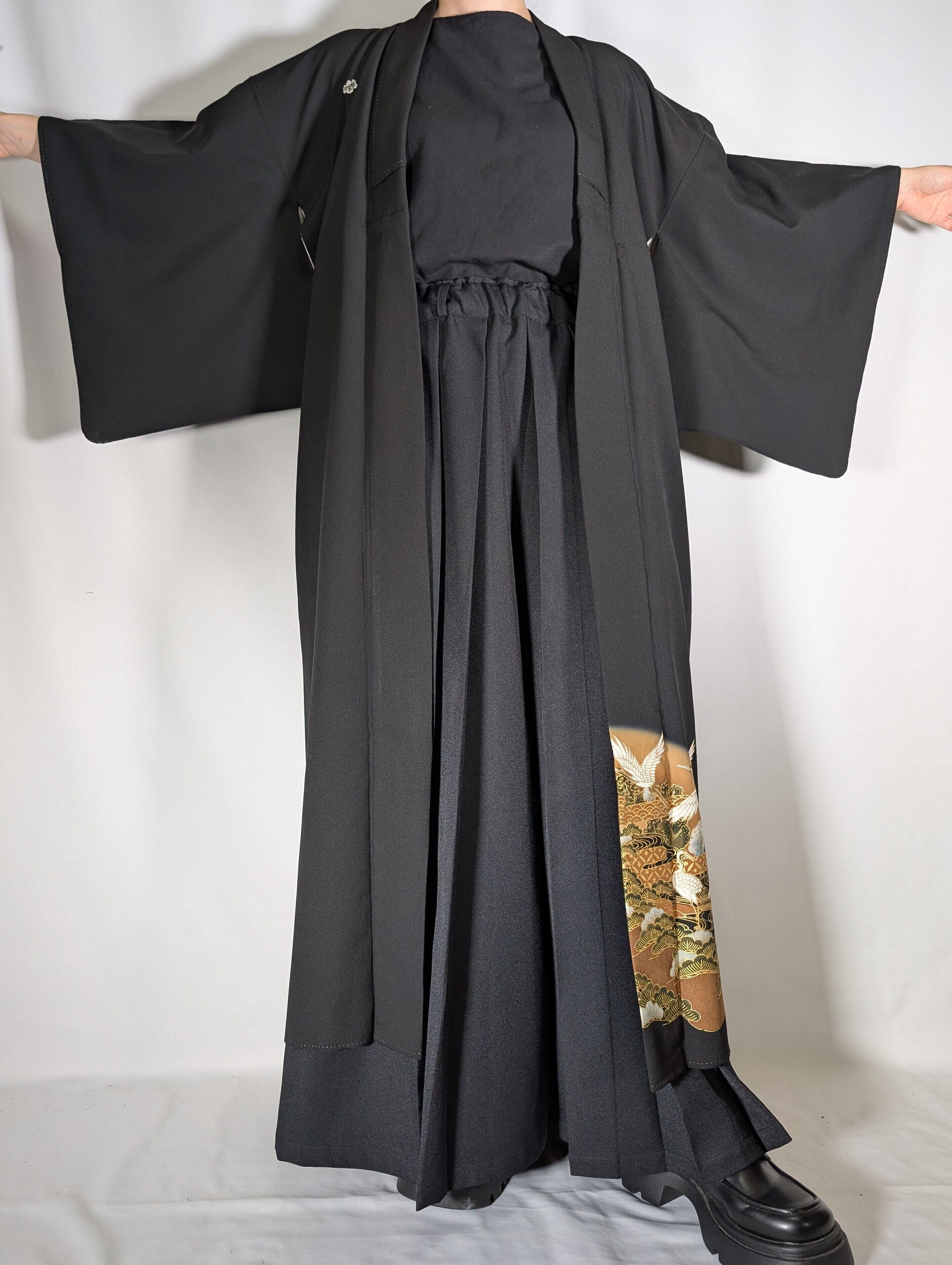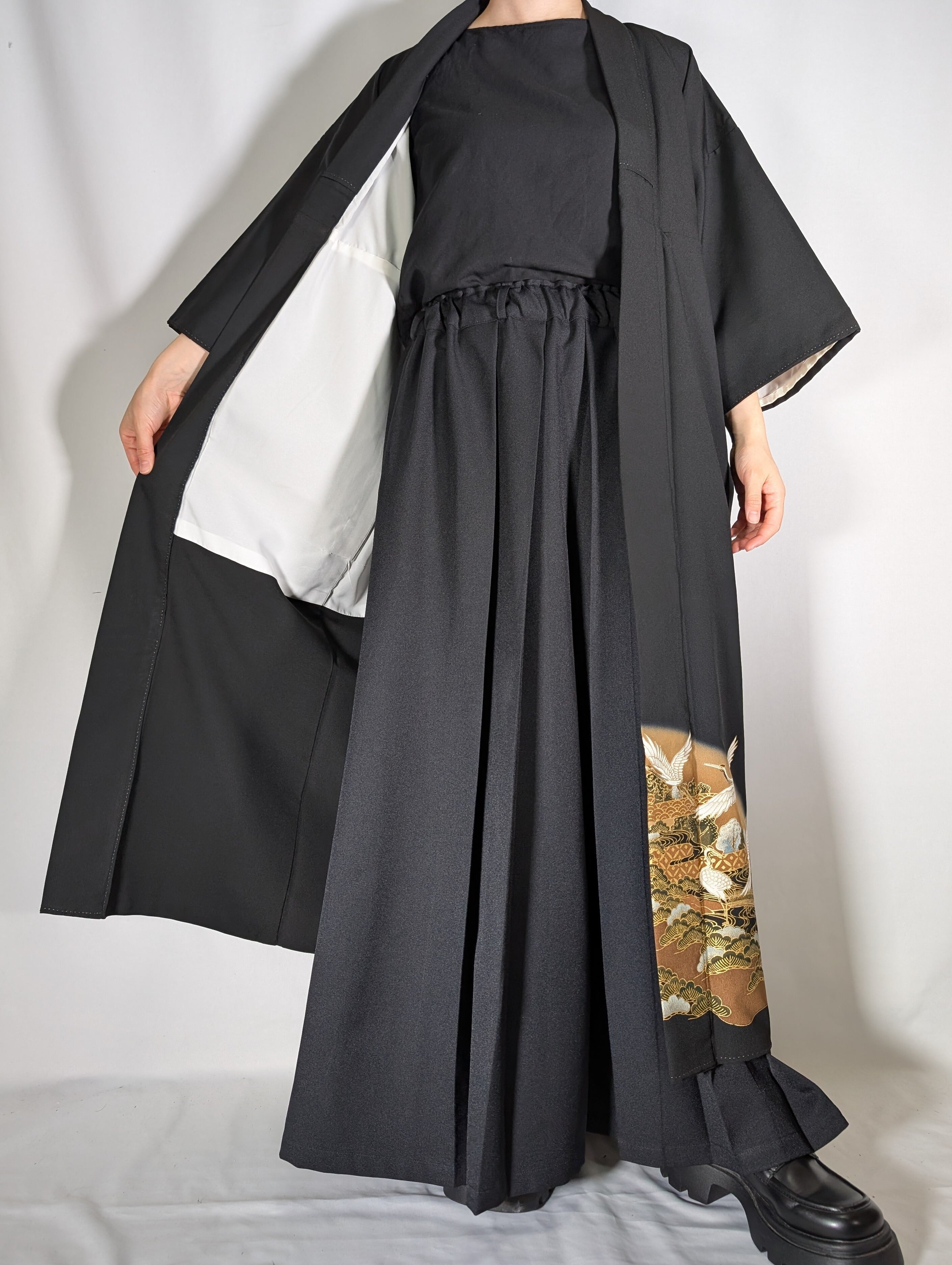 【14469】 着物リメイク 黒留袖 鶴 金 茶 風景模様 ロングコート kimono tomesode remake long coat black