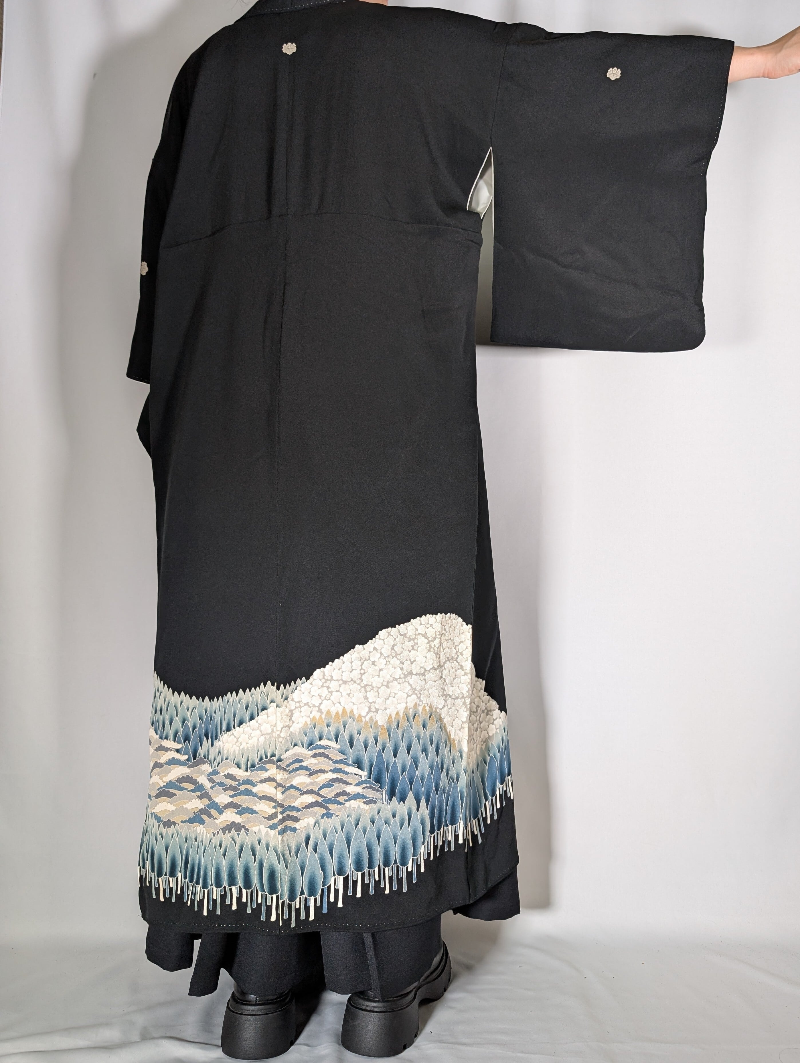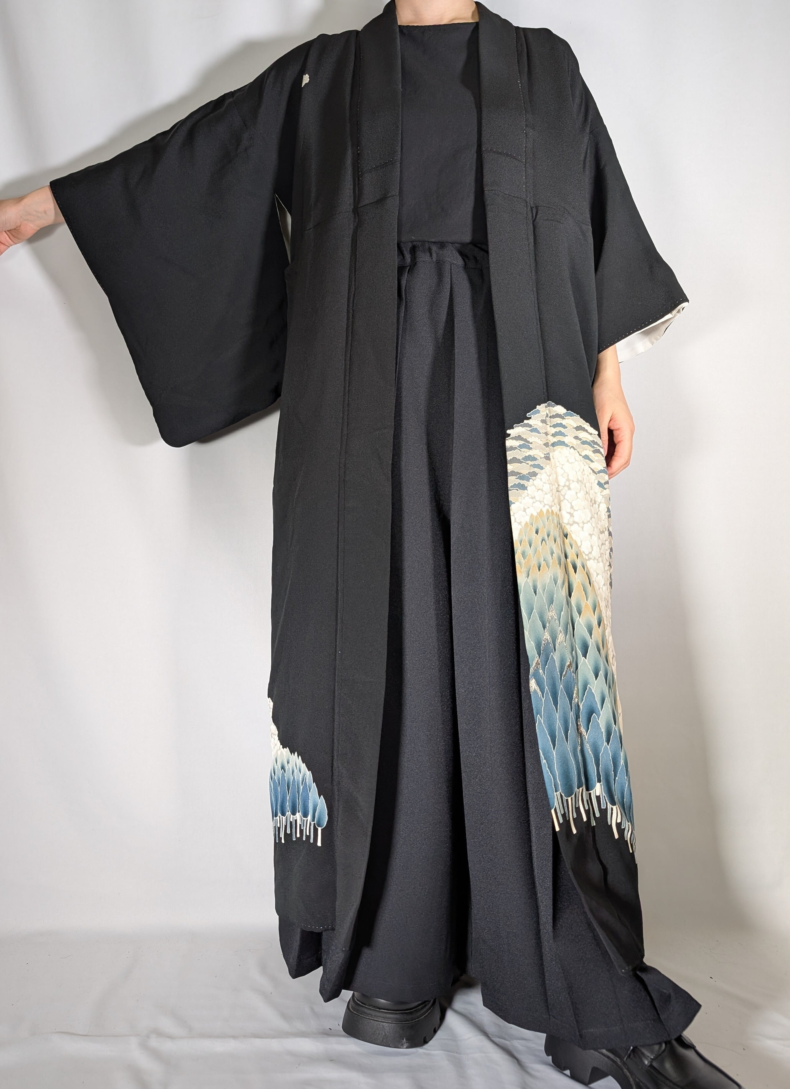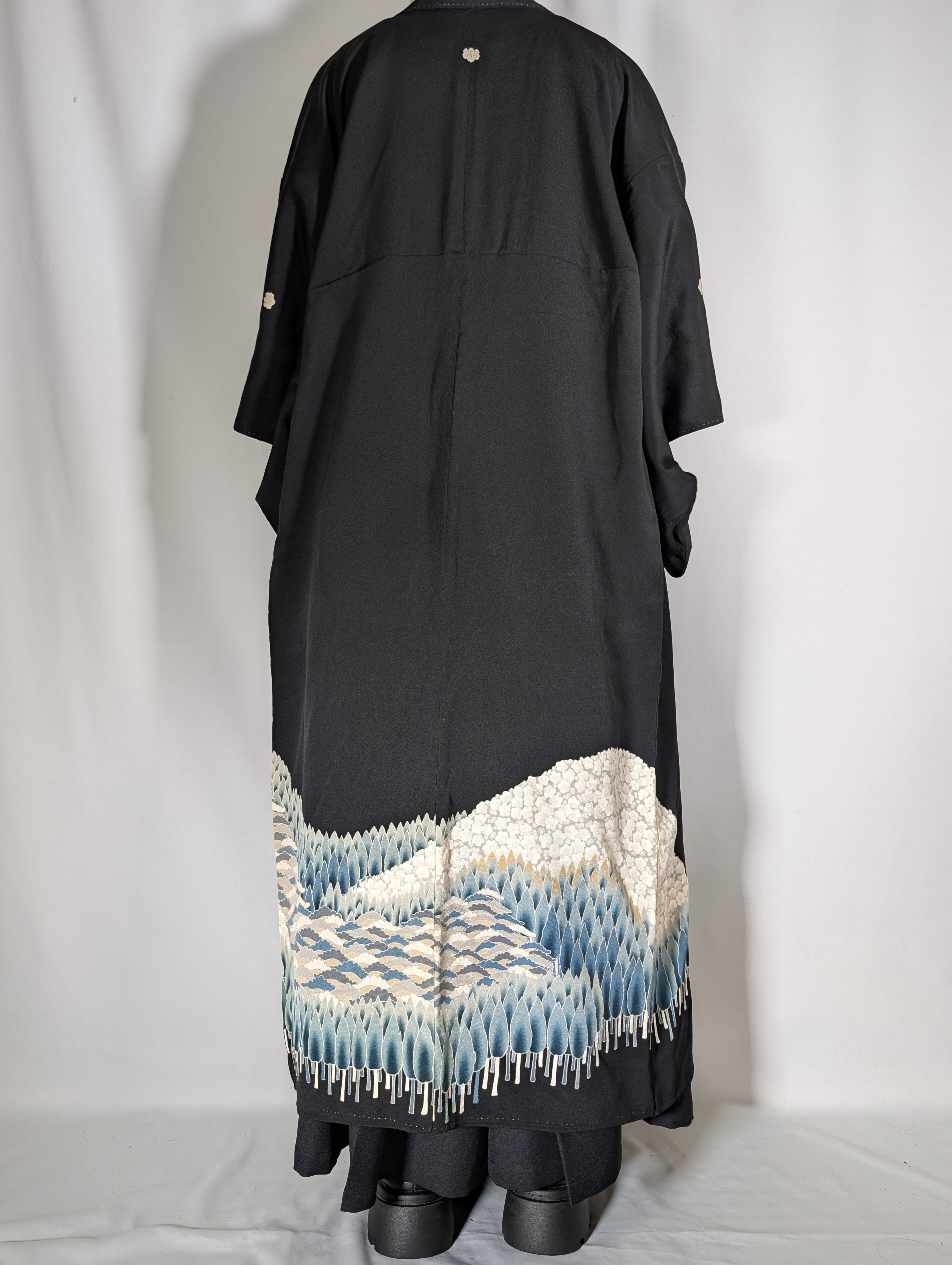 【14471】 着物リメイク 黒留袖 風景模様 ロングコート kimono tomesode remake long coat black