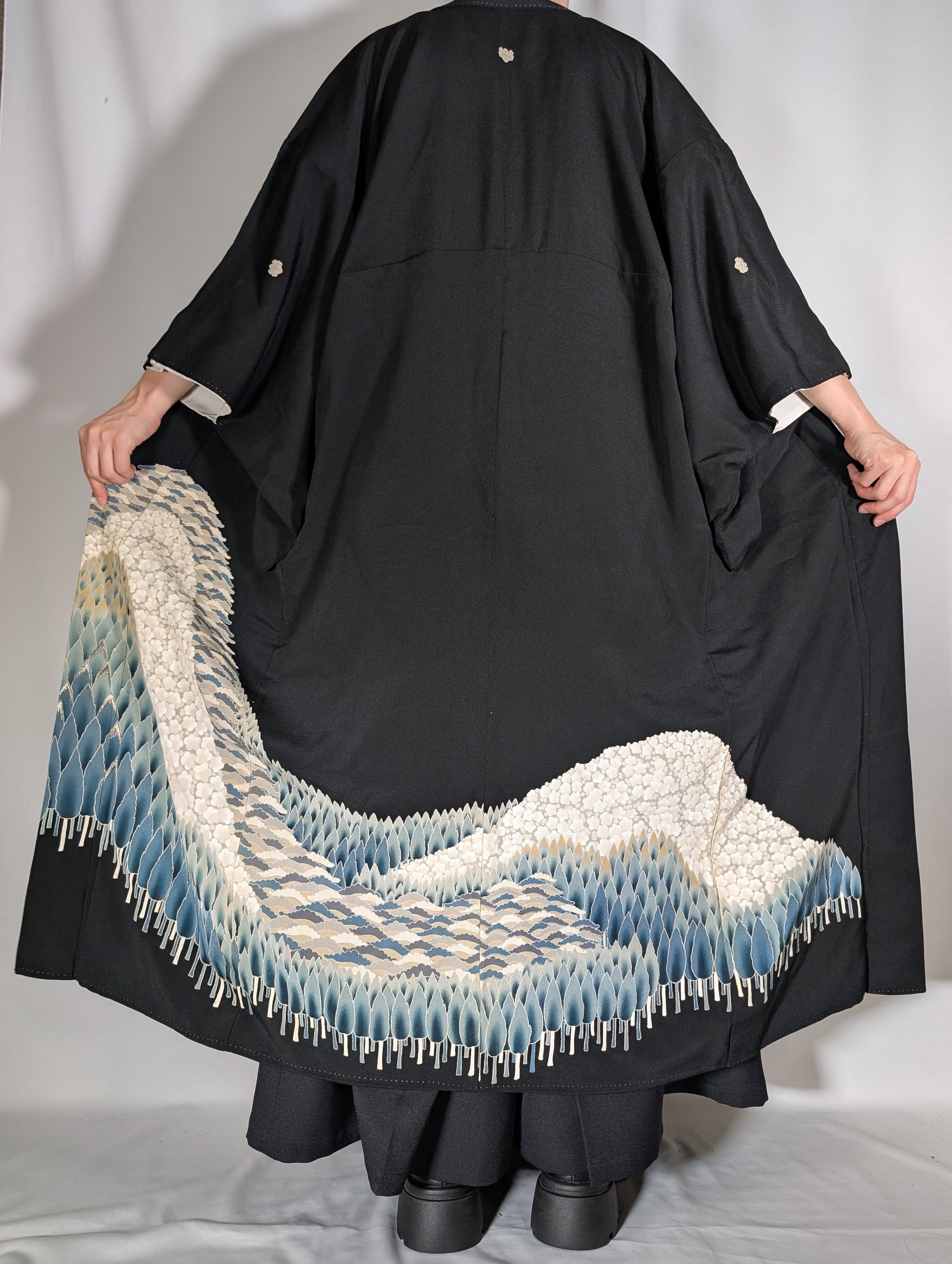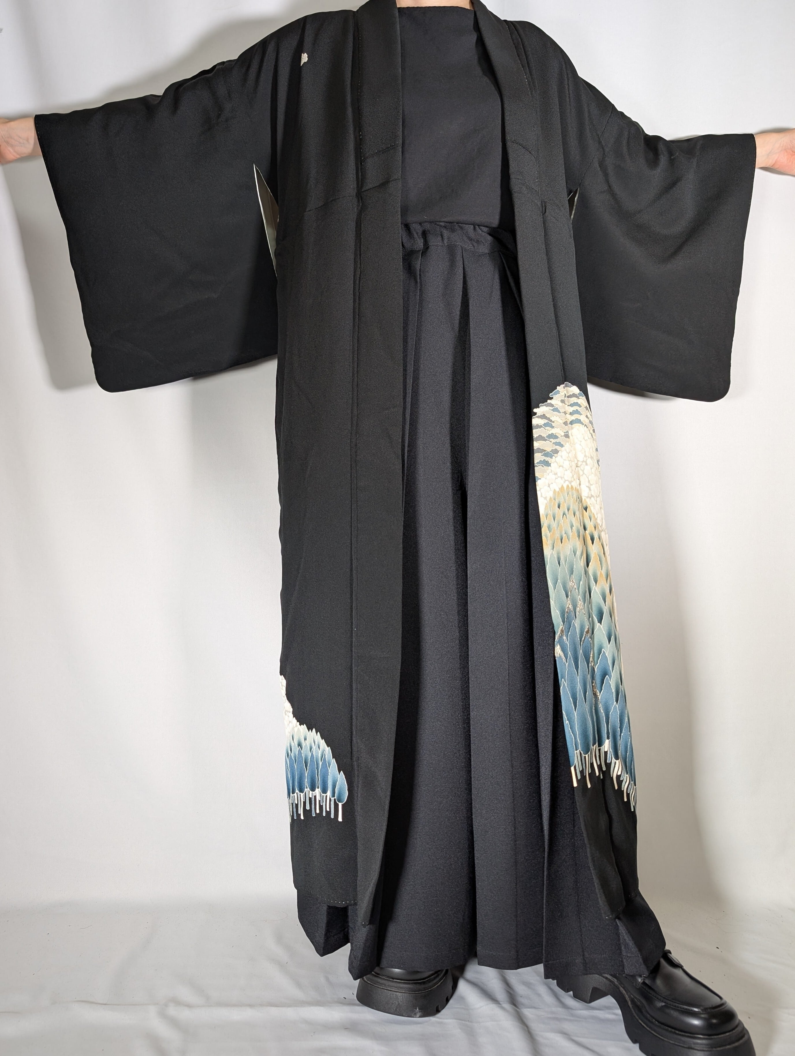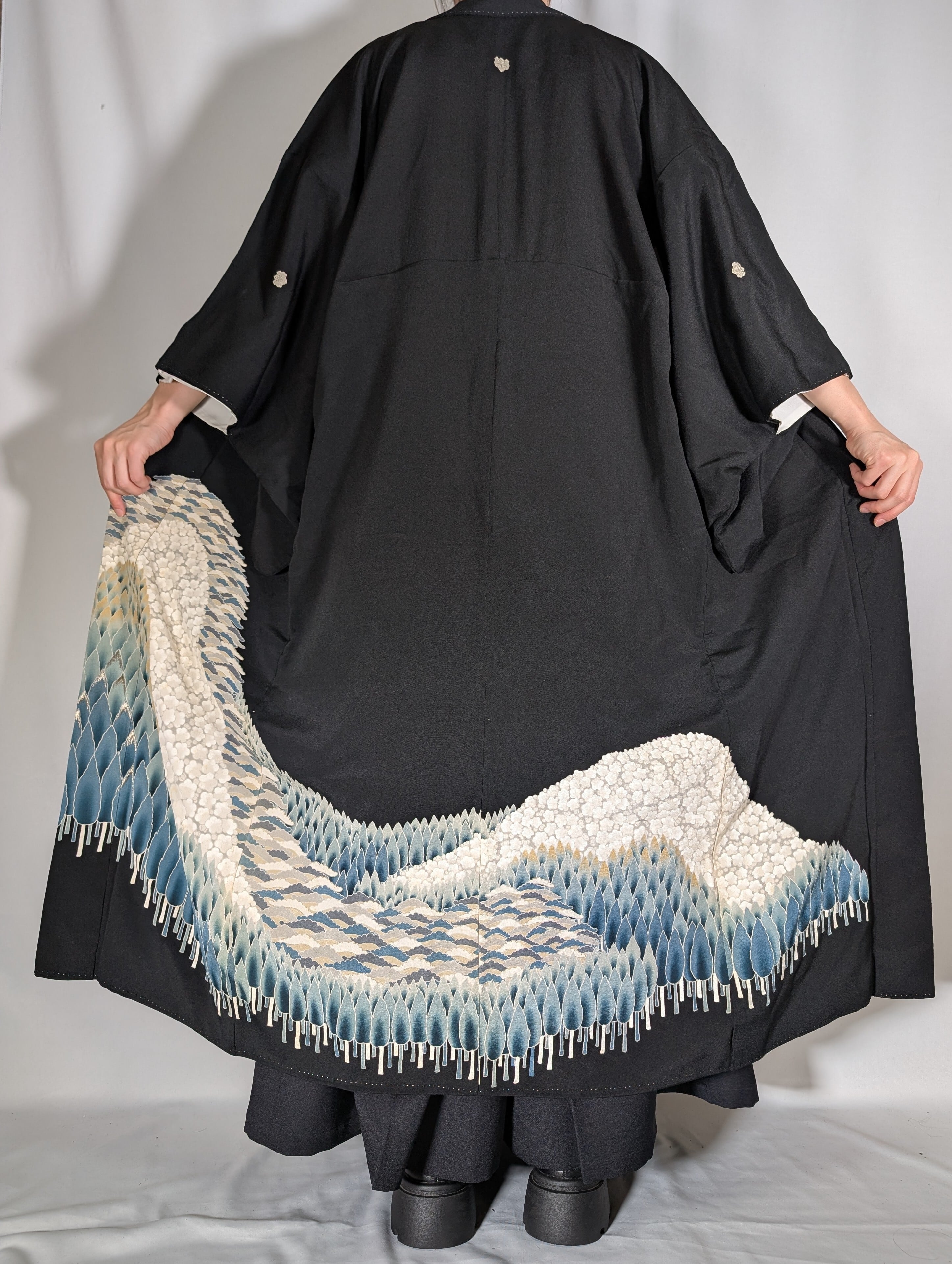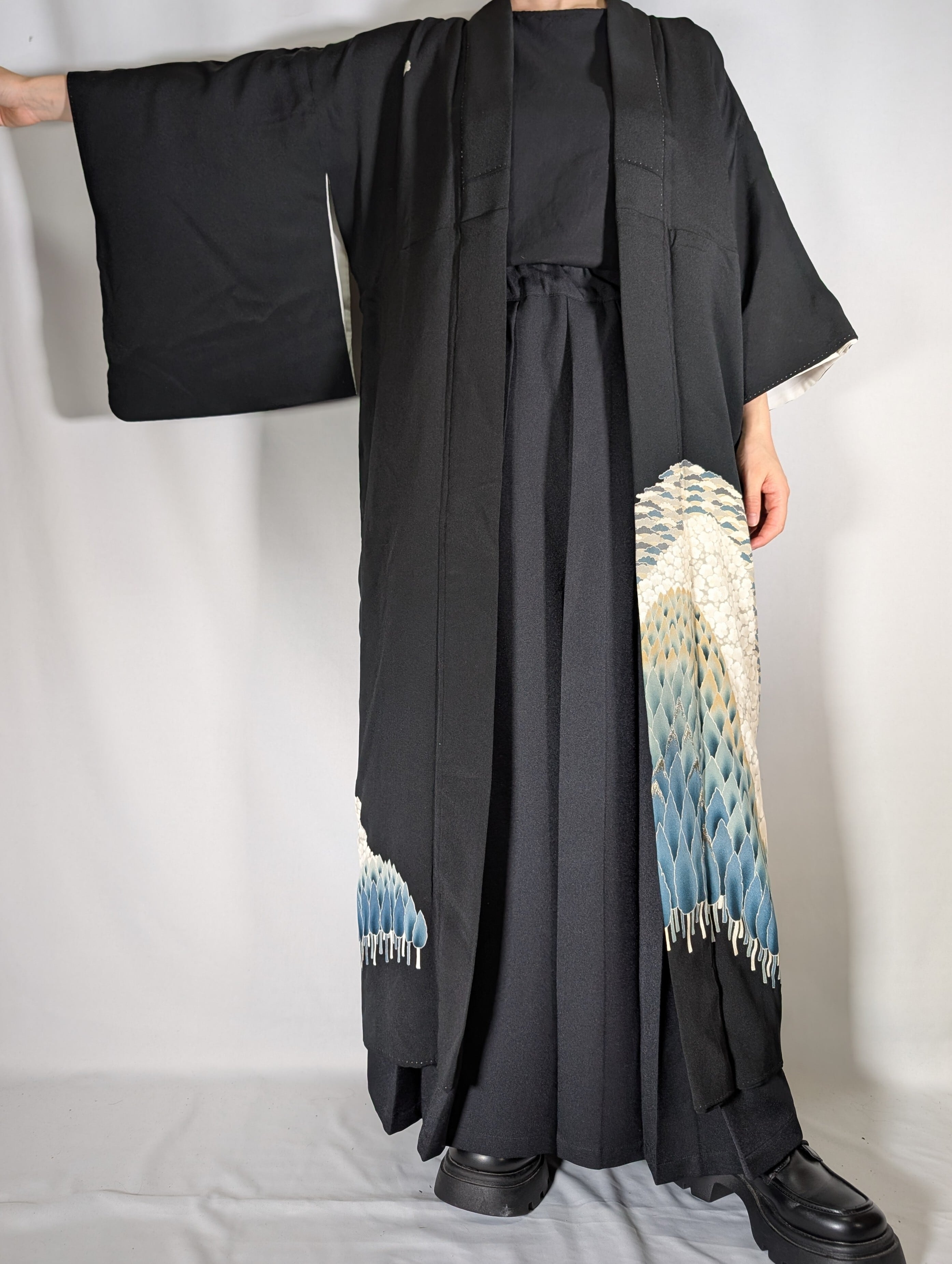 【14471】 着物リメイク 黒留袖 風景模様 ロングコート kimono tomesode remake long coat black