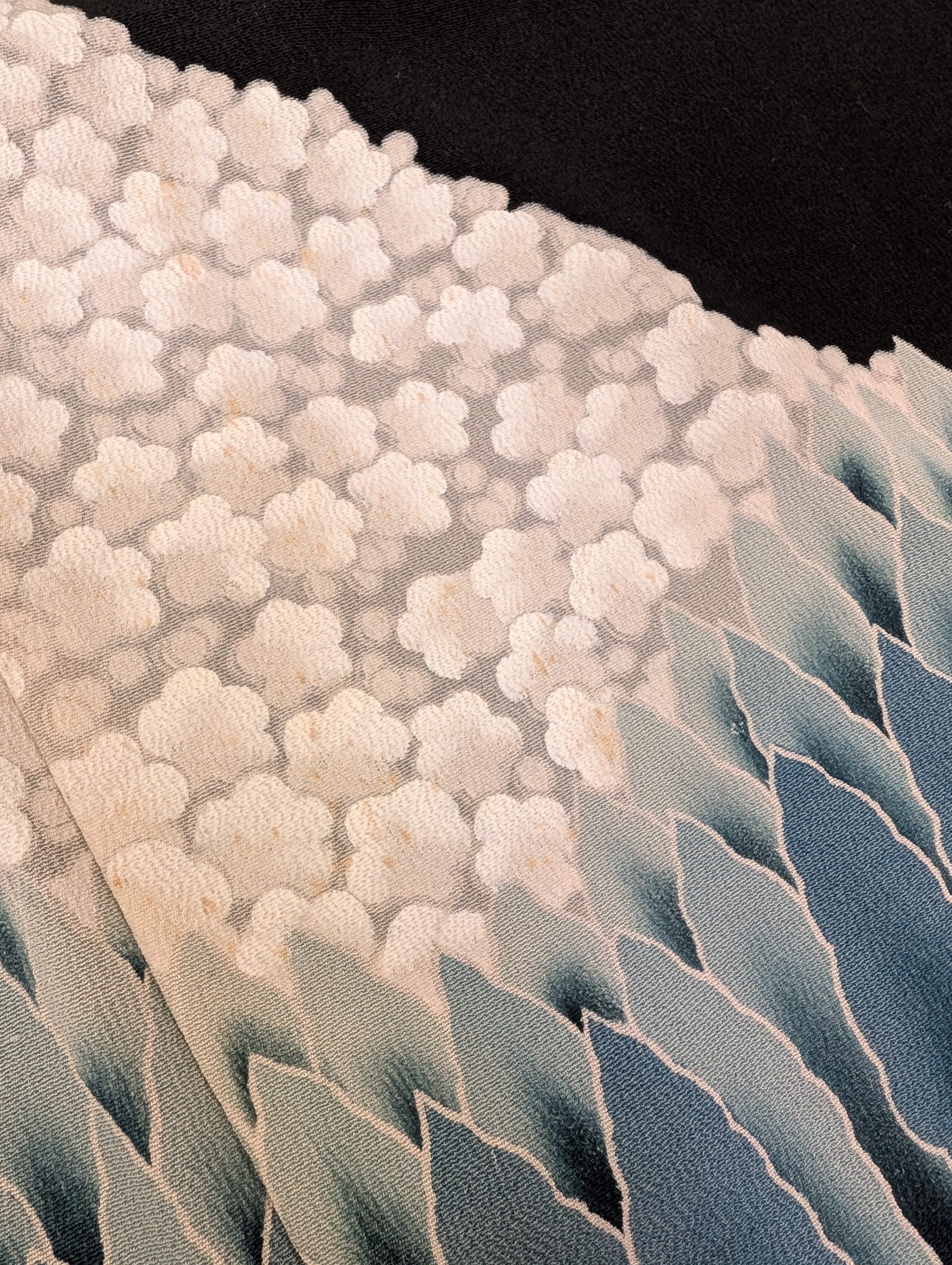 デザインは普段のコーデに馴染みやすいように、襟(えり)部分はストレートに、また、派手で豪華な裾(すそ)模様はカットせず全て残しています。