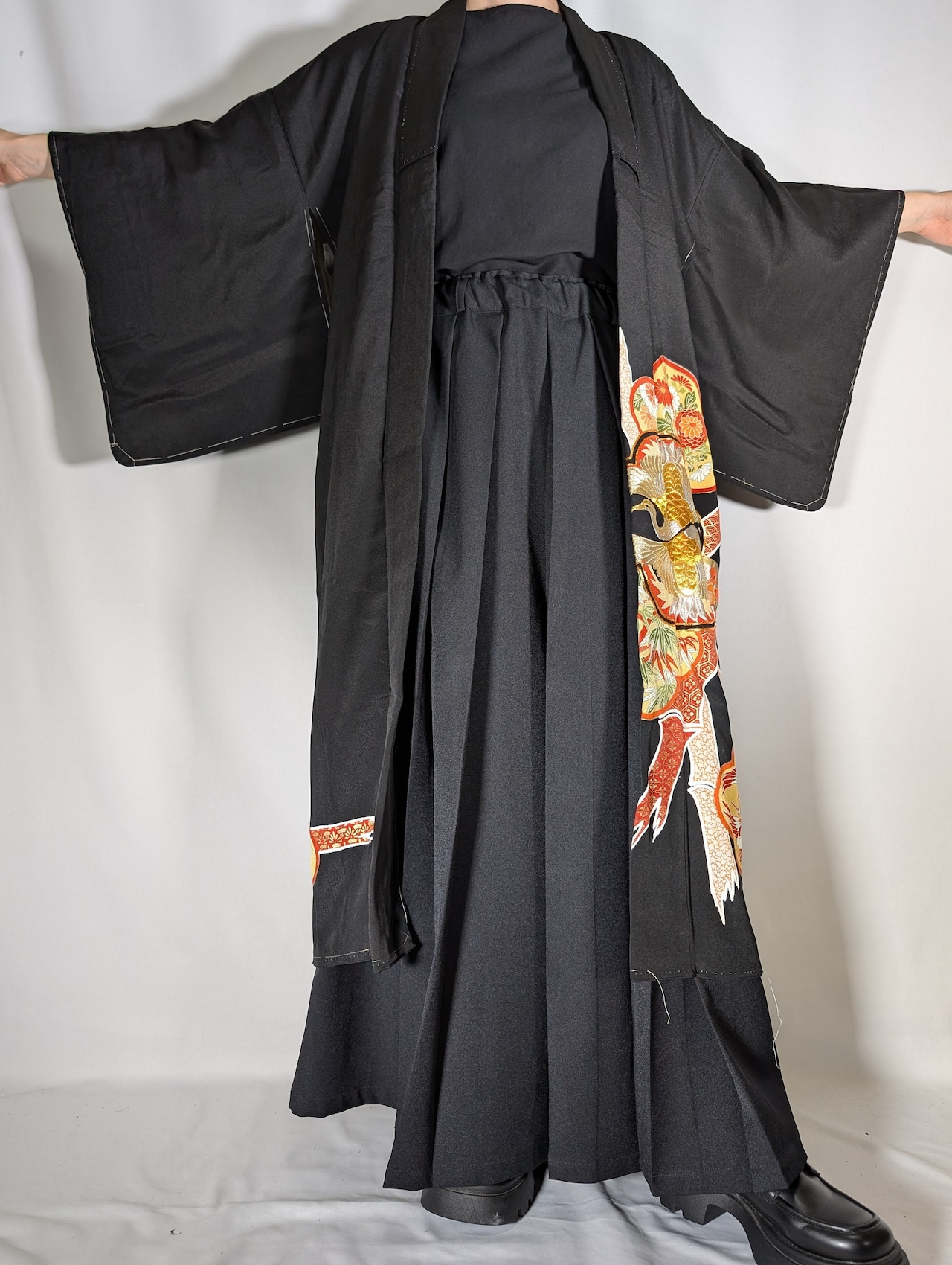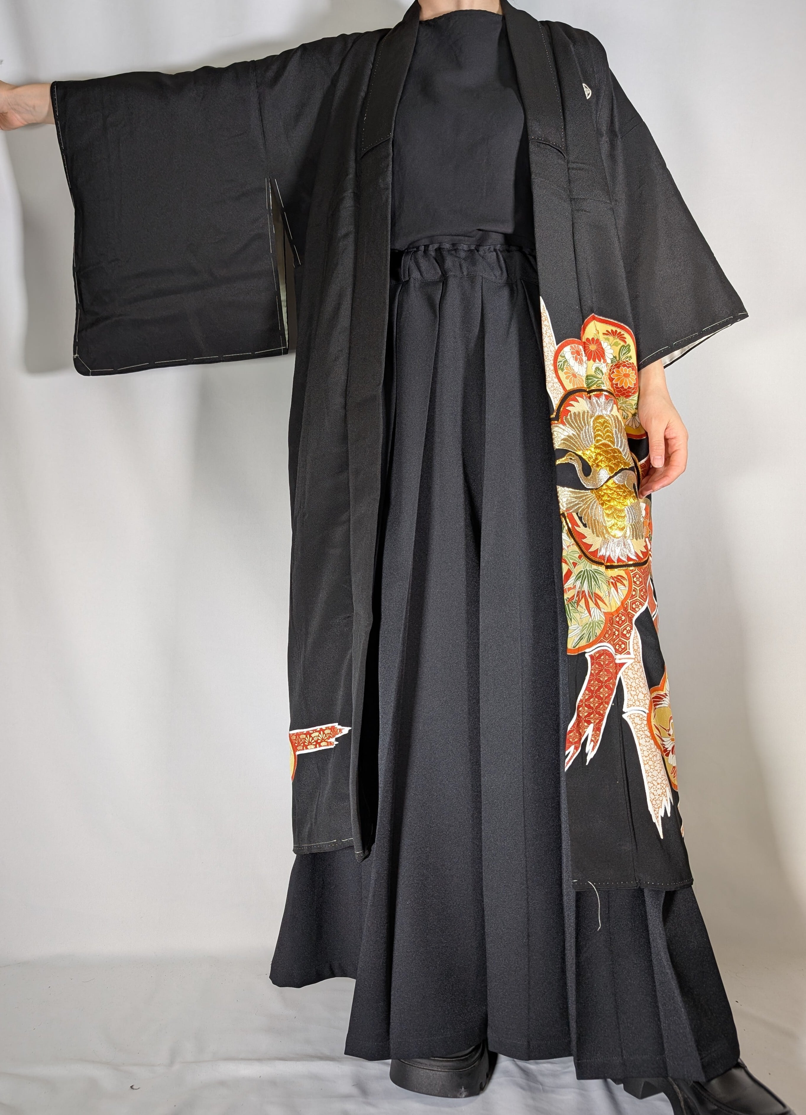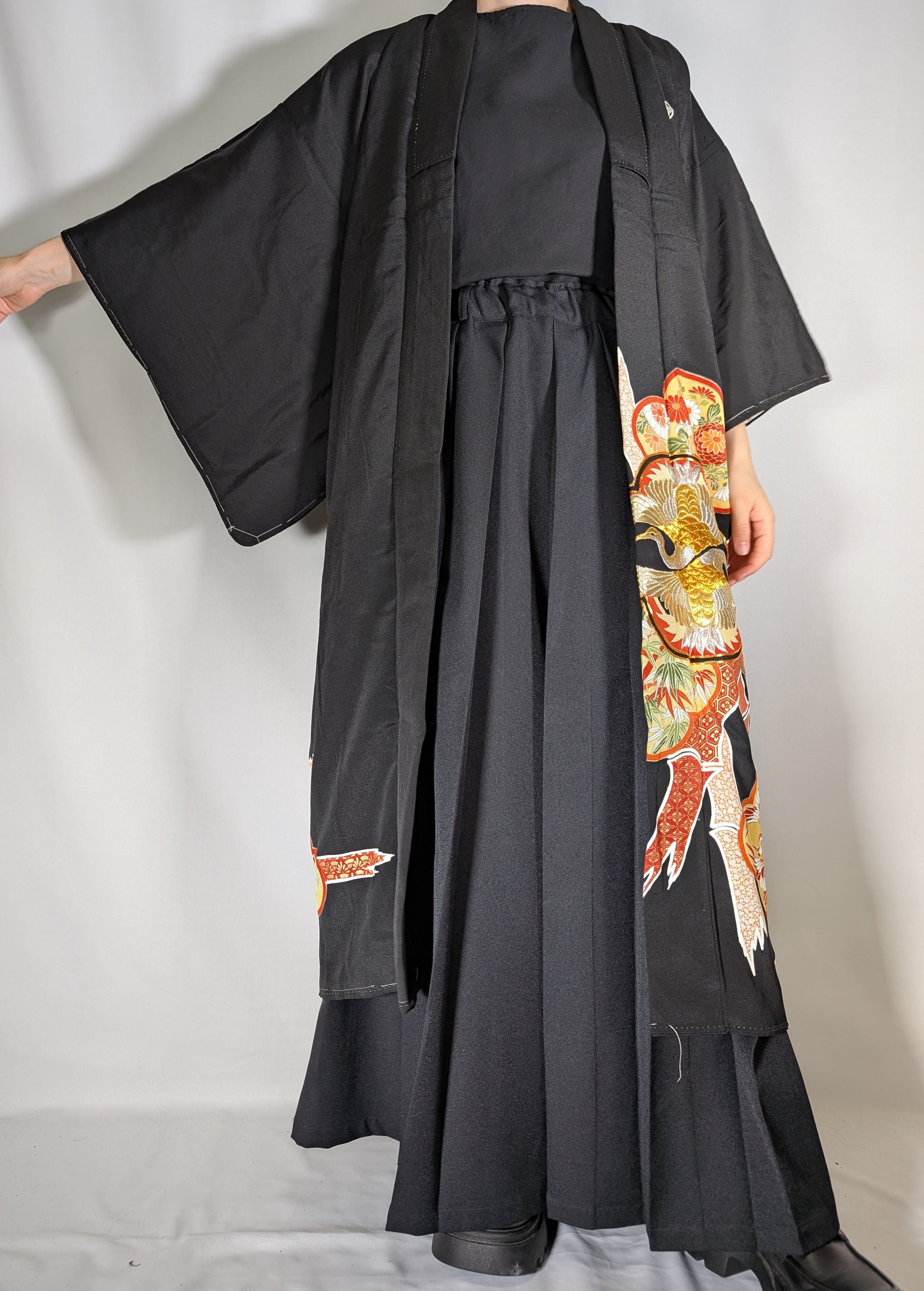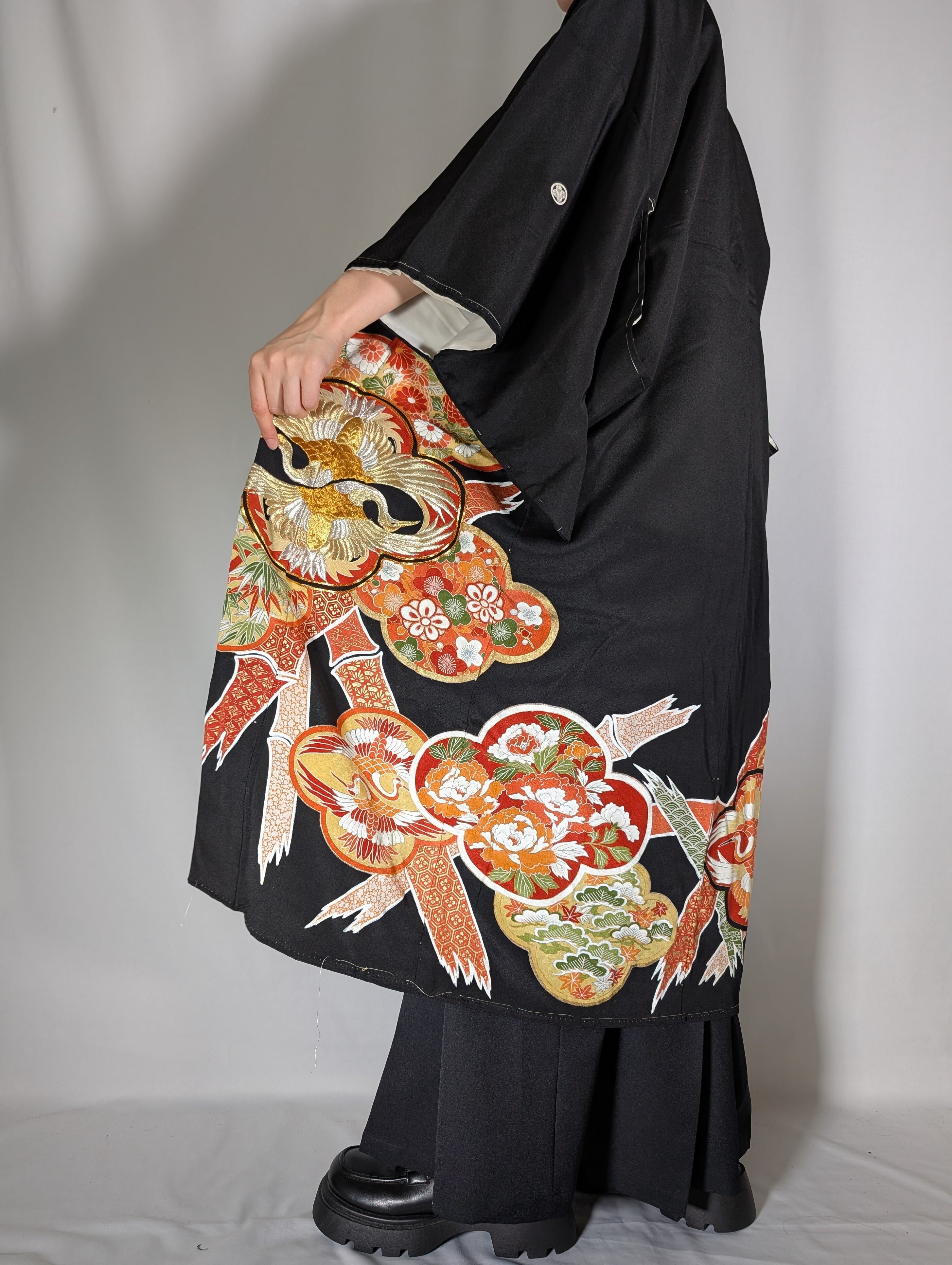 【14474】 着物リメイク 黒留袖 刺繍 鶴 牡丹 オレンジ 金 ロングコート kimono tomesode remake long coat black