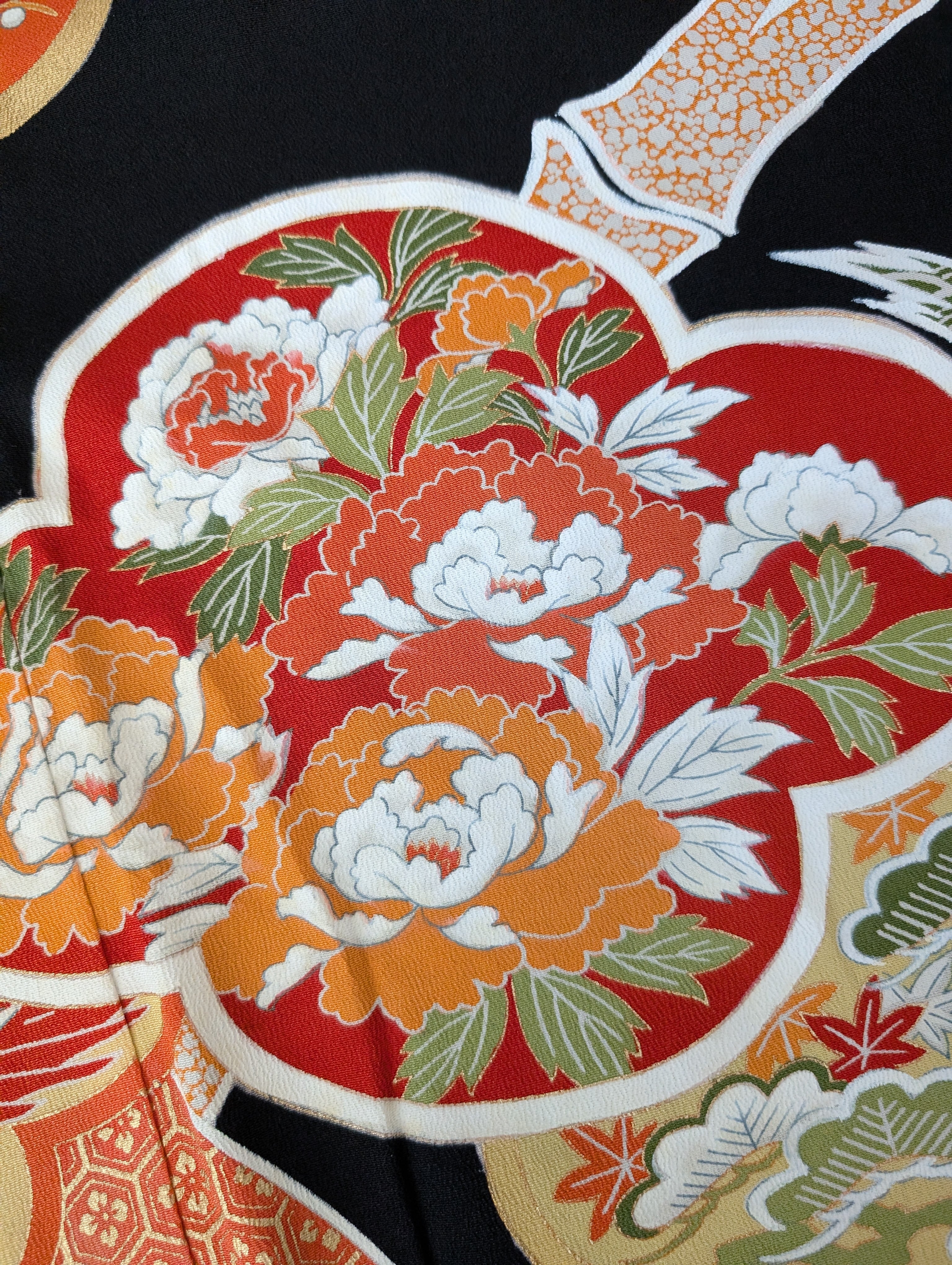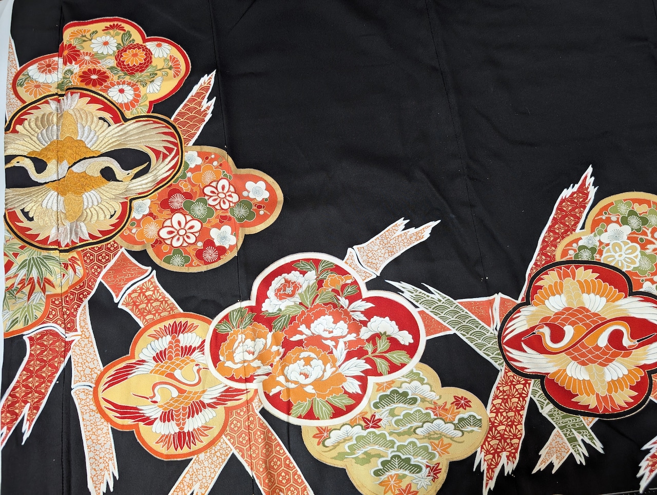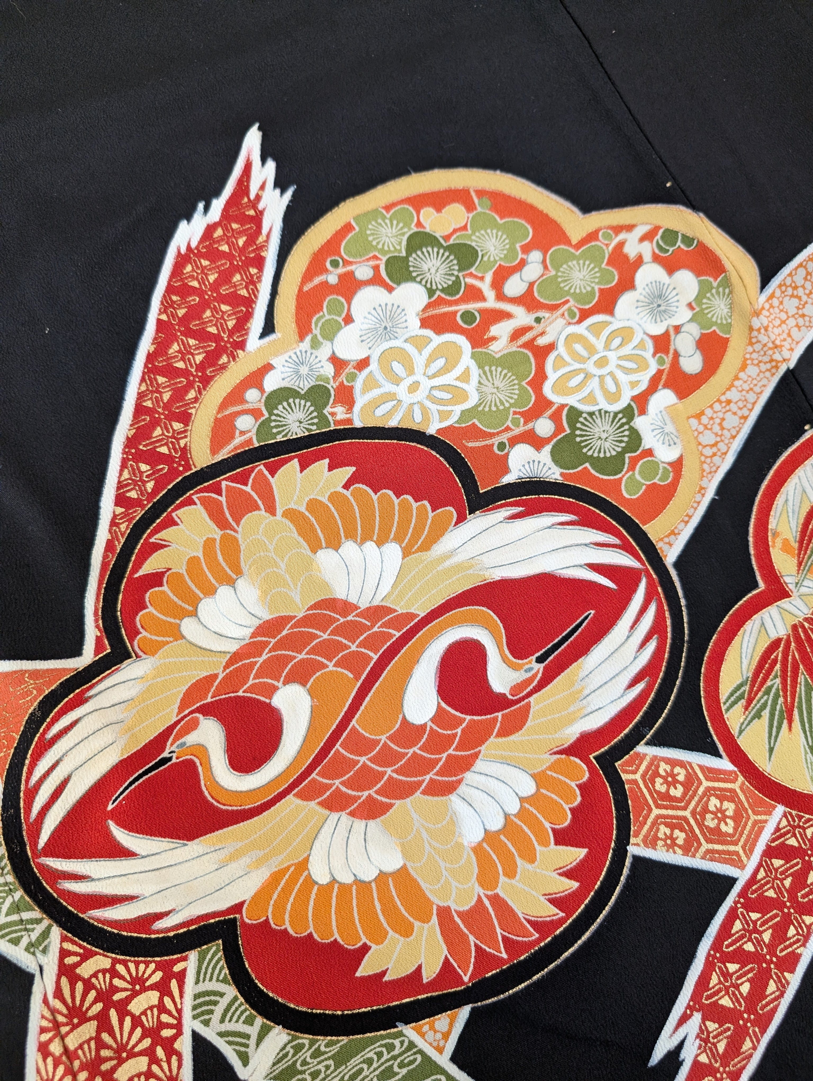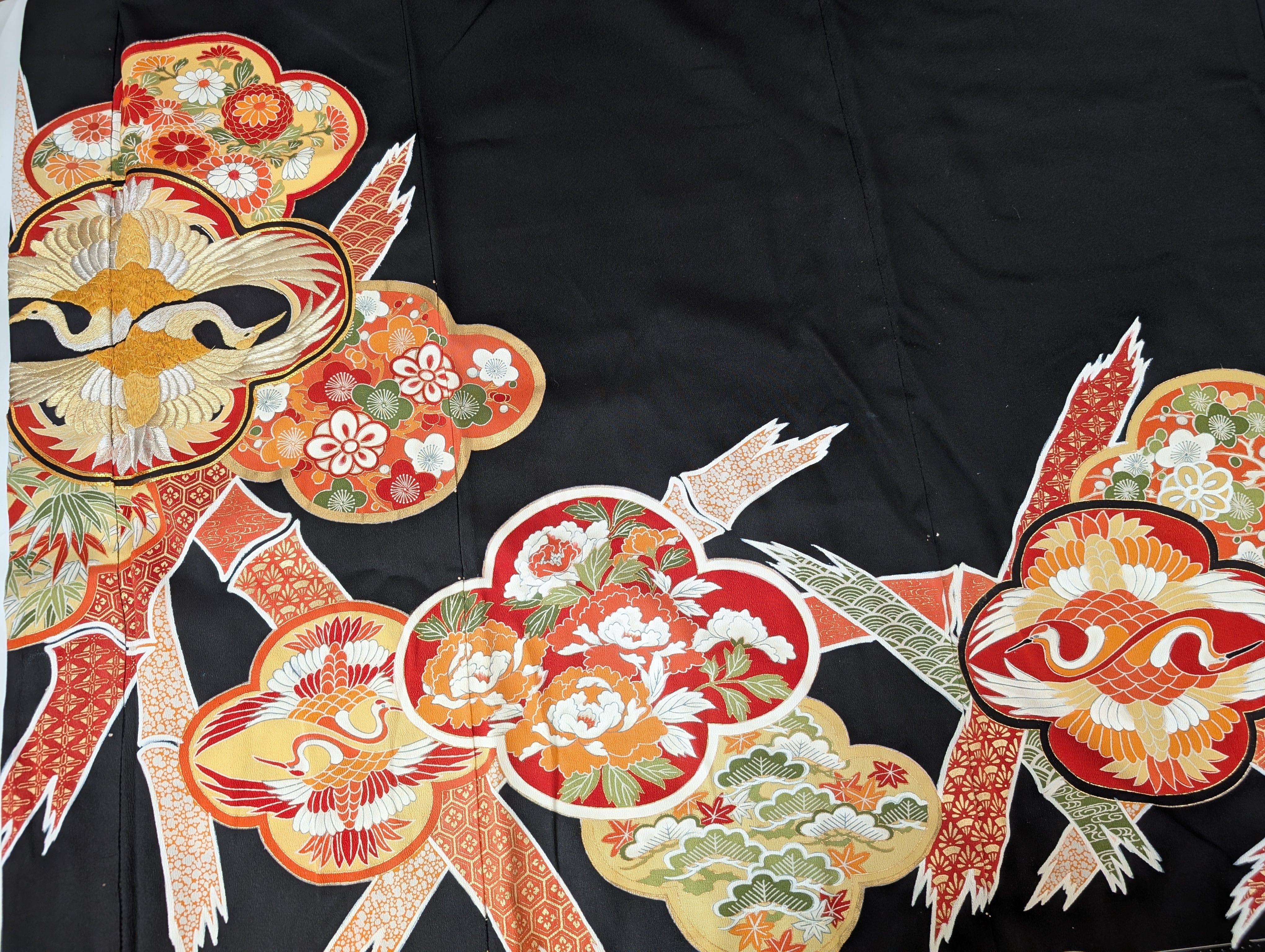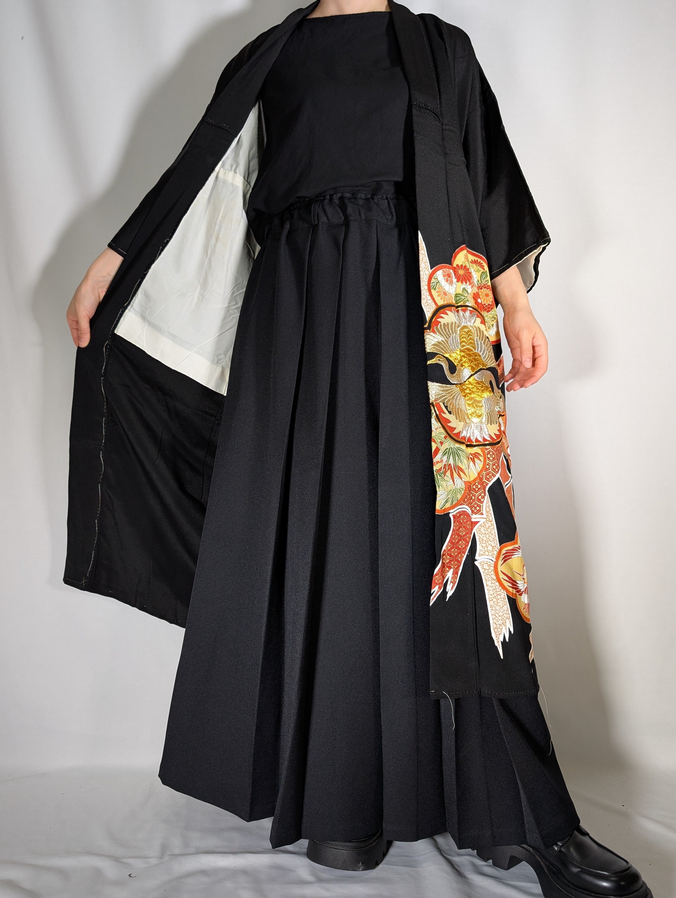 【14474】 着物リメイク 黒留袖 刺繍 鶴 牡丹 オレンジ 金 ロングコート kimono tomesode remake long coat black