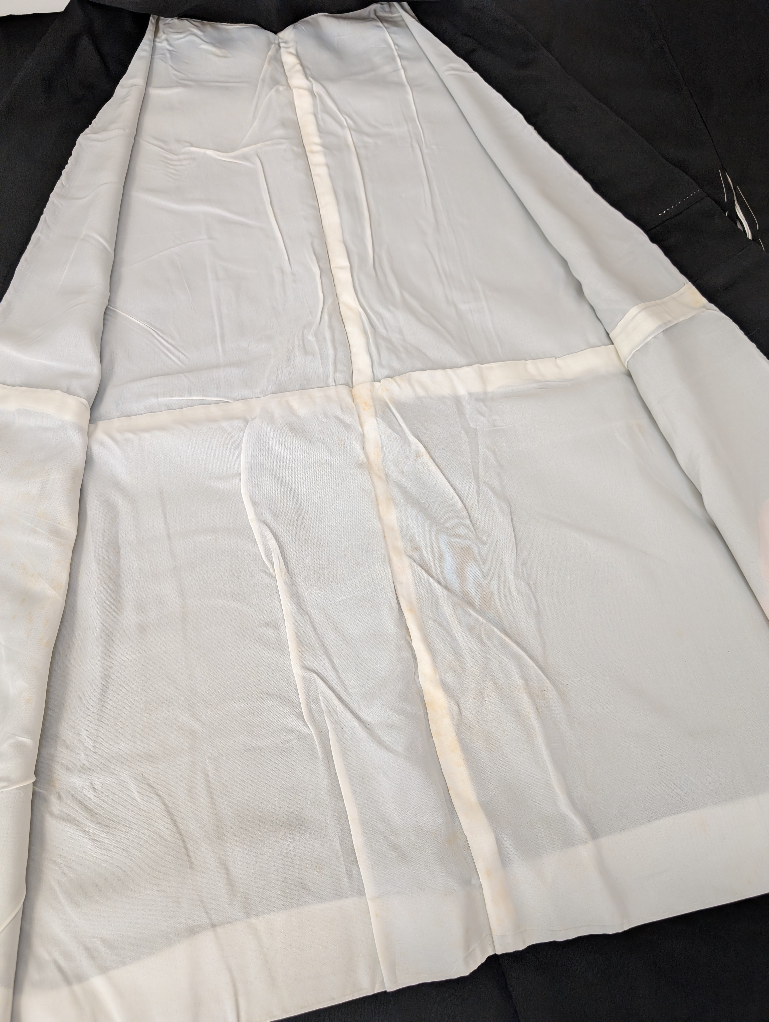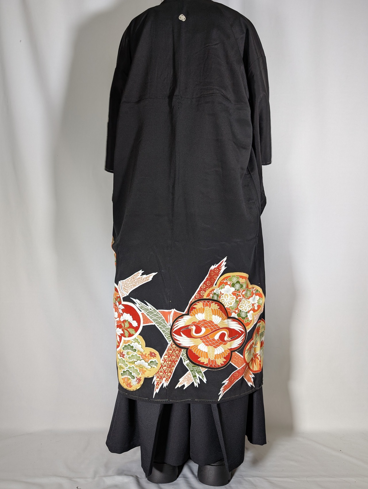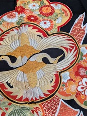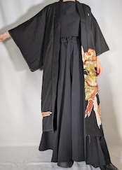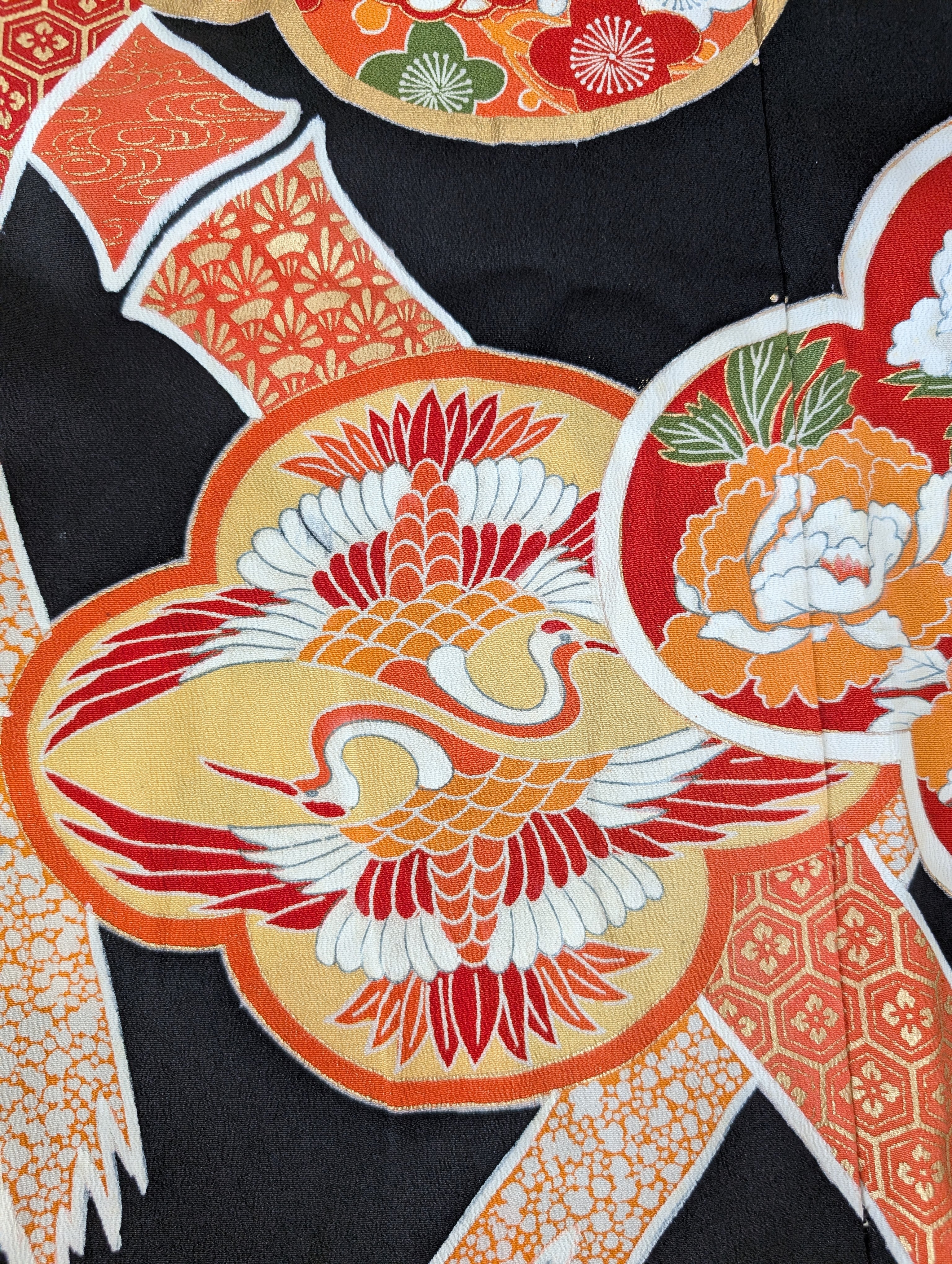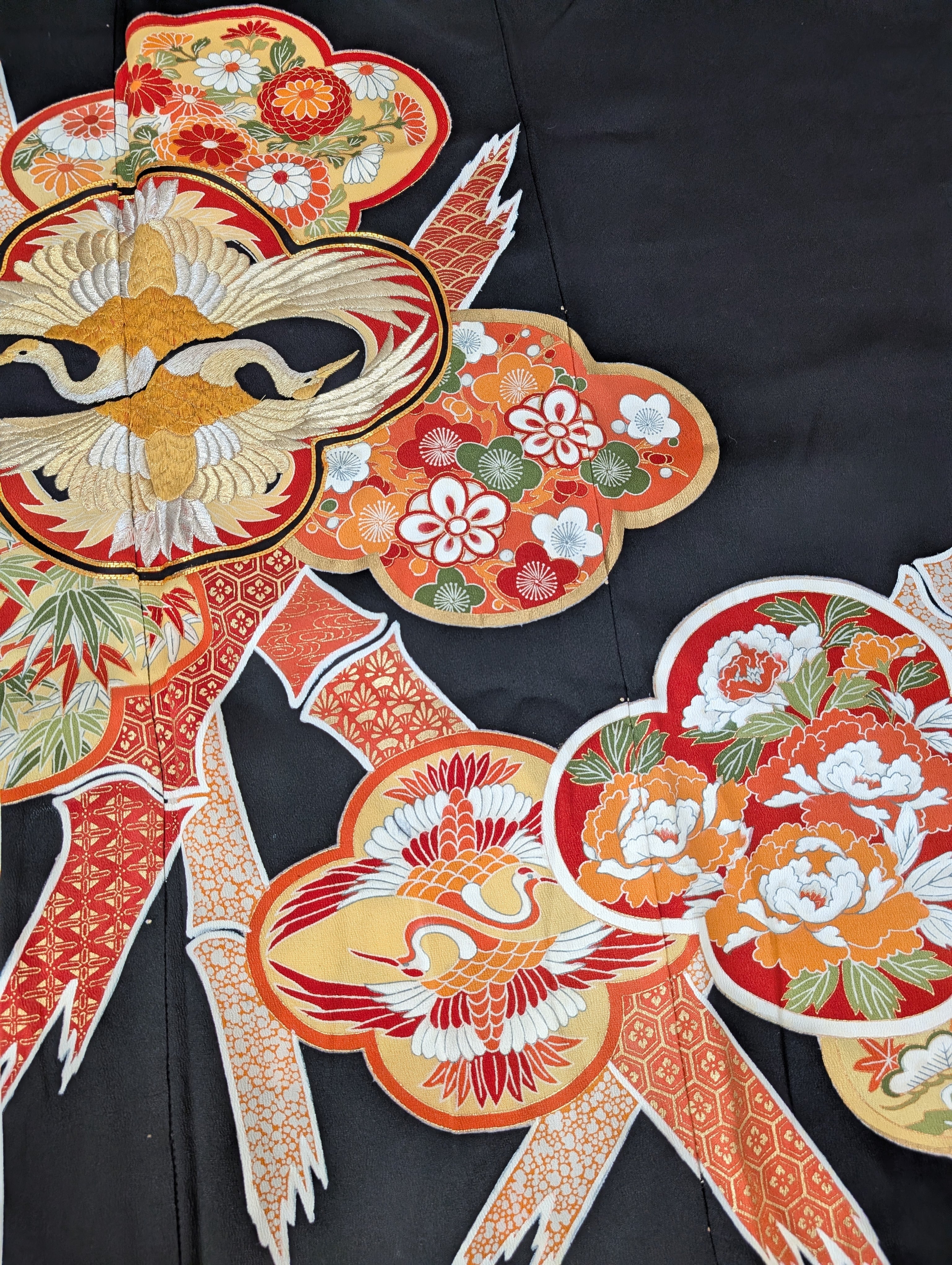 【14474】 着物リメイク 黒留袖 刺繍 鶴 牡丹 オレンジ 金 ロングコート kimono tomesode remake long coat black