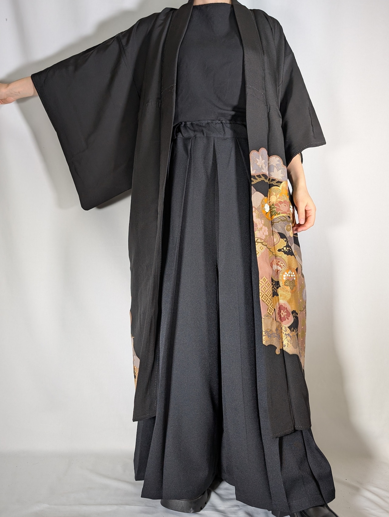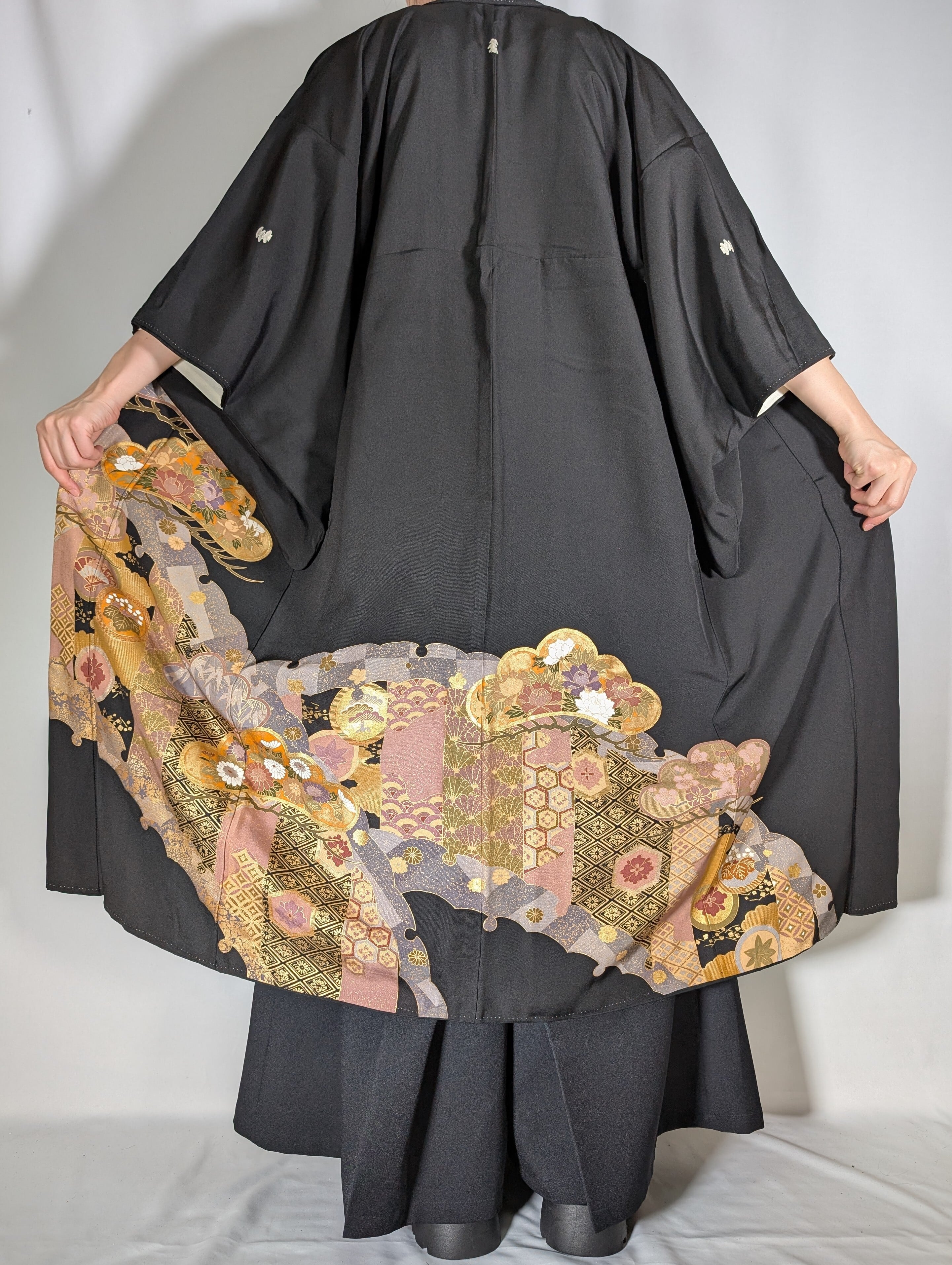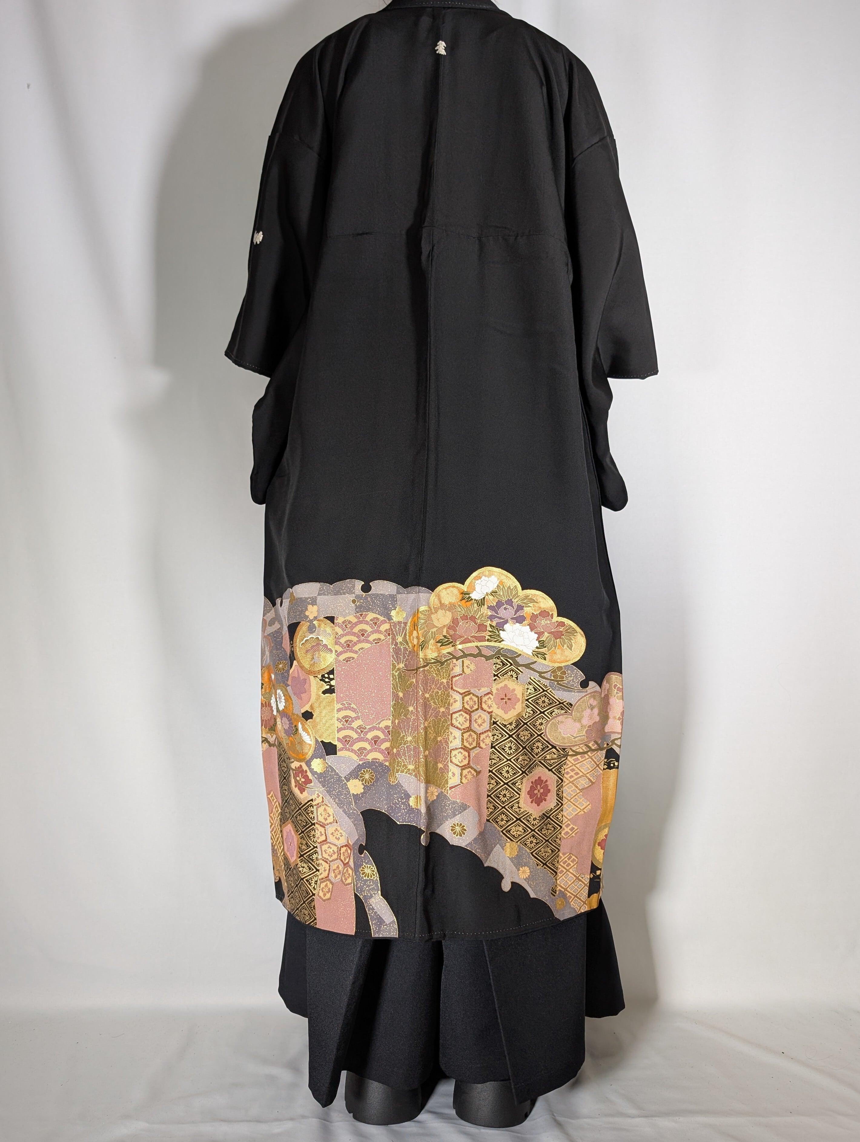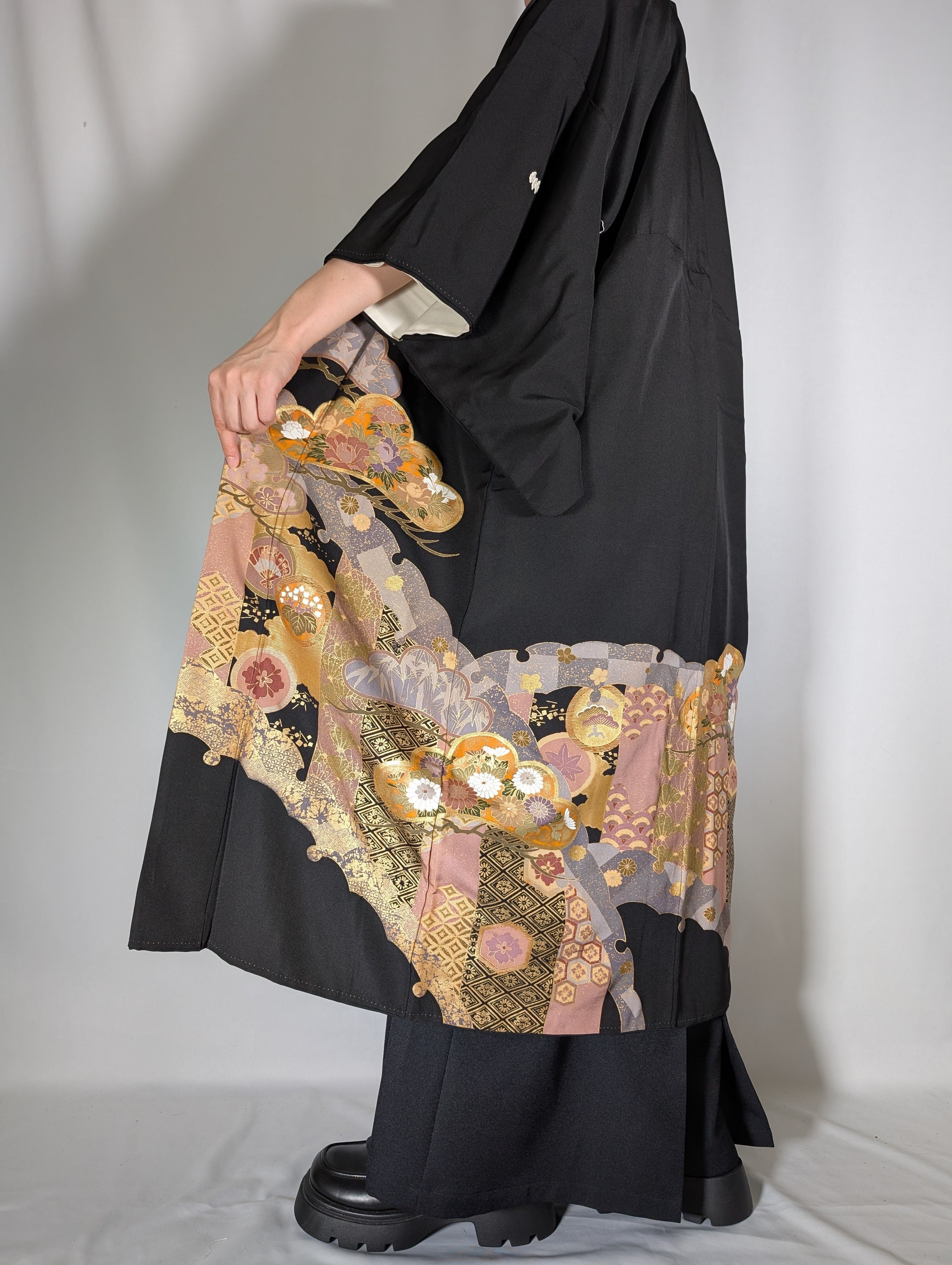 【14483】 着物リメイク 黒留袖 ロングコート kimono tomesode remake long coat black